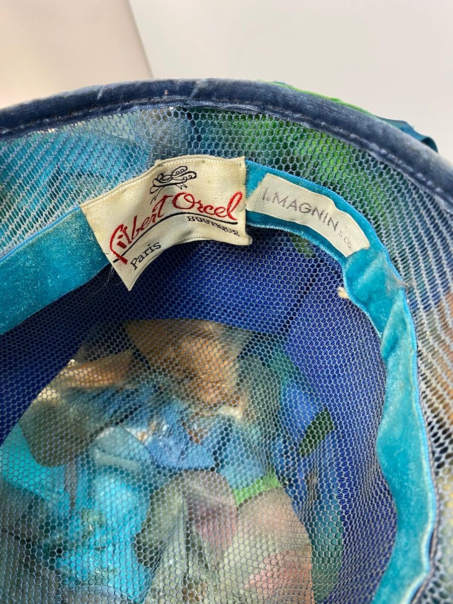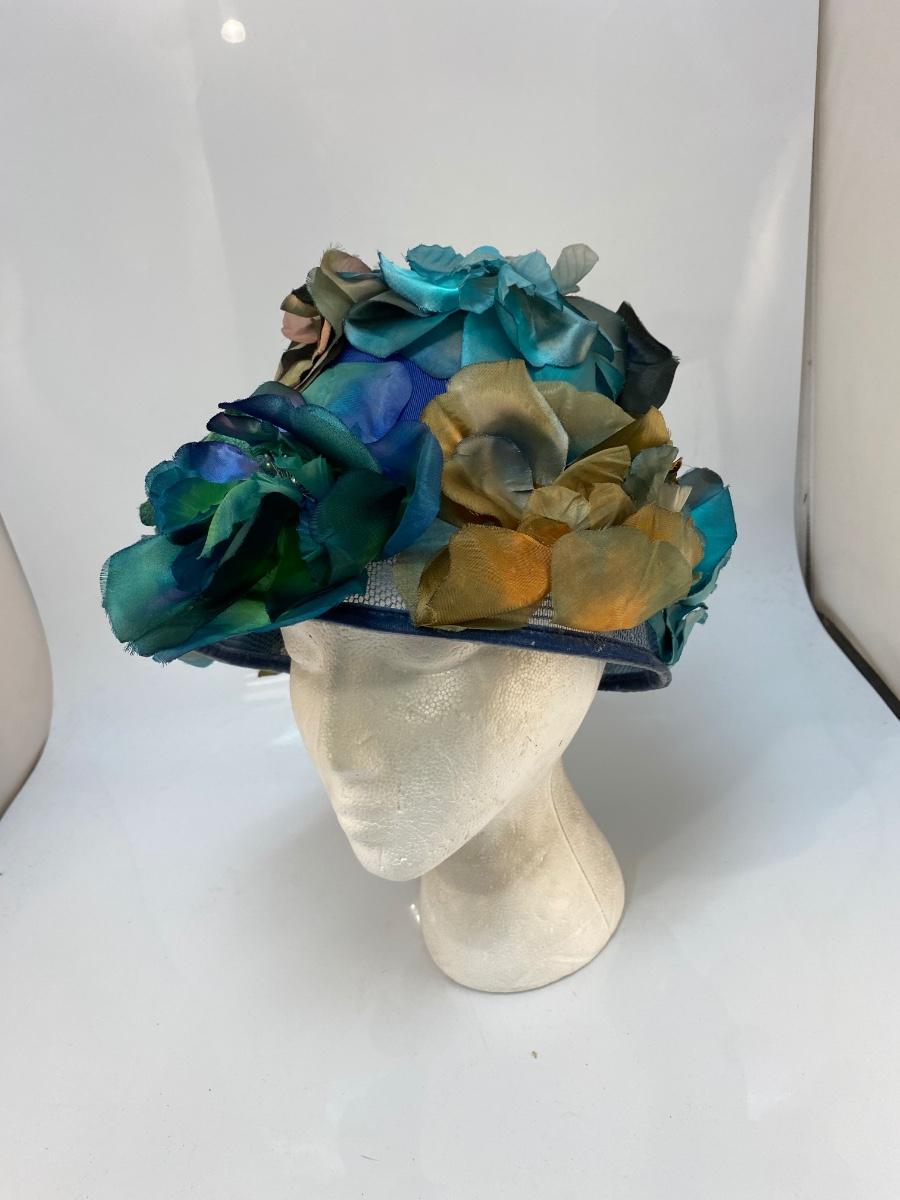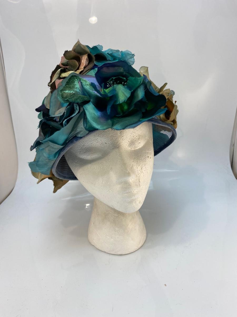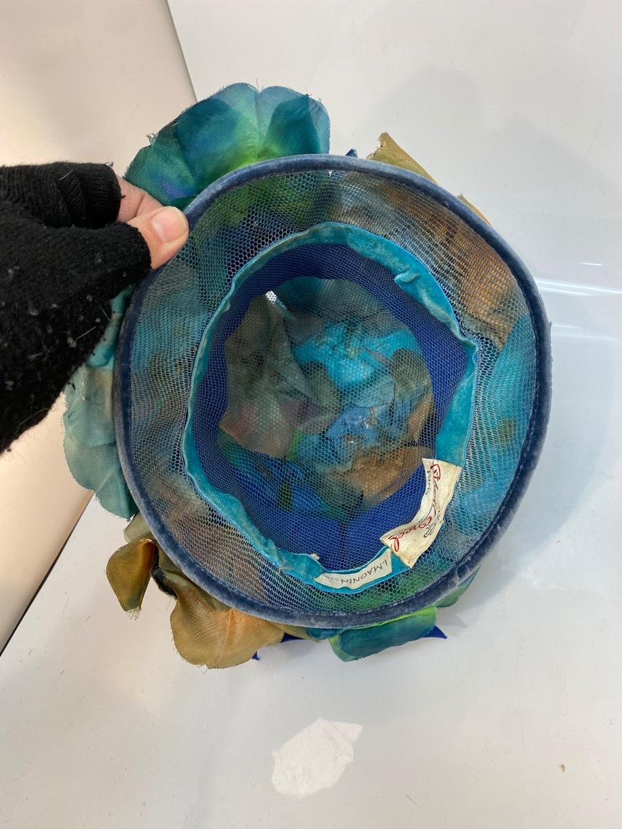 Vintage Blue & Green Floral Adorn Mesh Cloche Hat Cap Gilbert Orcel Boutique. In good vintage condition. The flowers are a bit flat from storage, but the hat is in good shape. Sold by I. Magnin & Co.