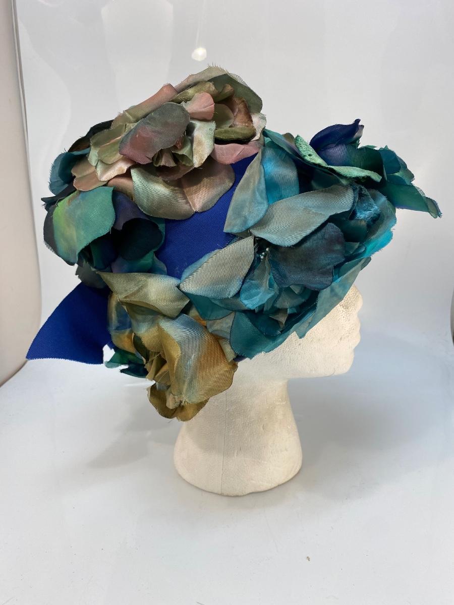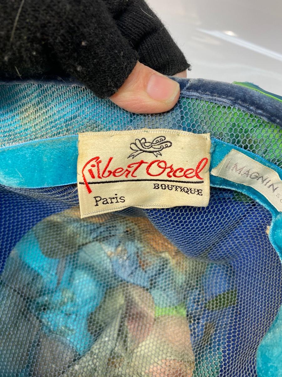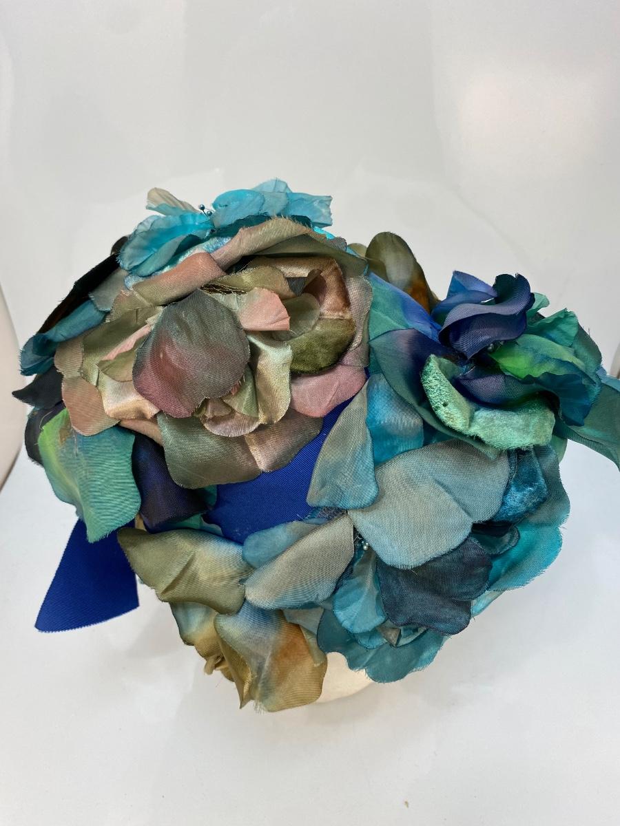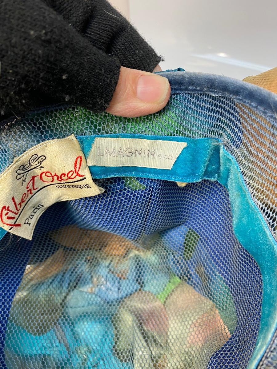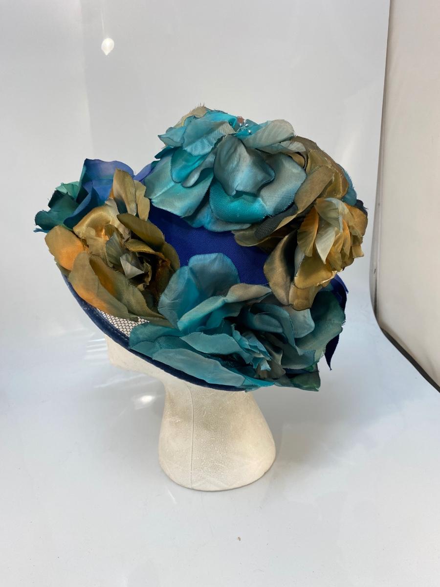Vintage Blue & Green Floral Adorn Mesh Cloche Hat Cap Gilbert Orcel Boutique. In good vintage condition. The flowers are a bit flat from storage, but the hat is in good shape. Sold by I. Magnin & Co.