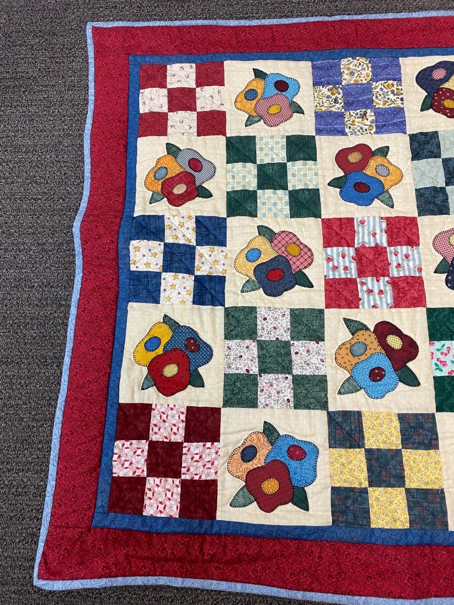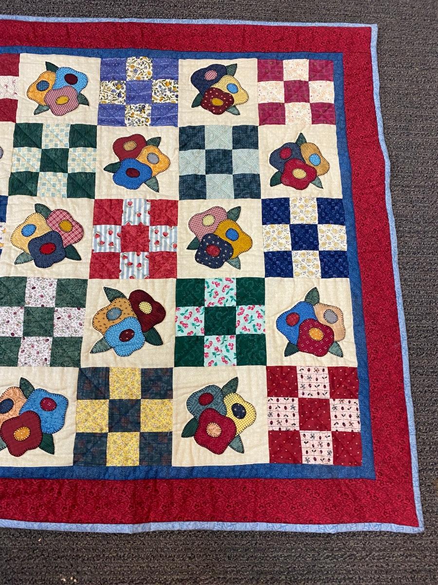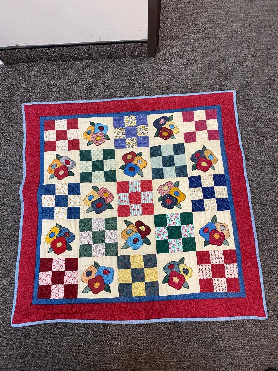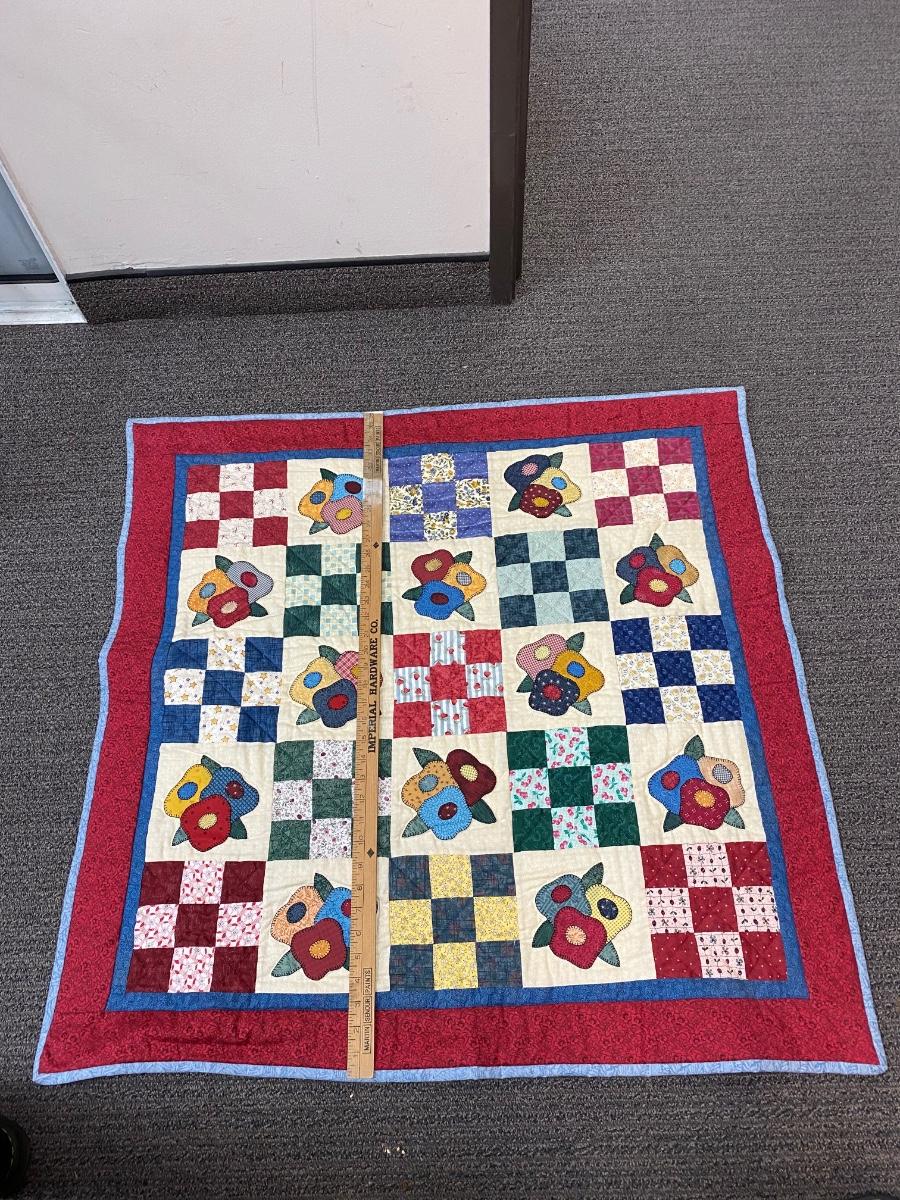 Small 36" Floral & Checker Patchwork Throw Wall Hanging Blanket. In good vintage condition, light discoloration. There is a sleeve along the back for wood dowel to hang.