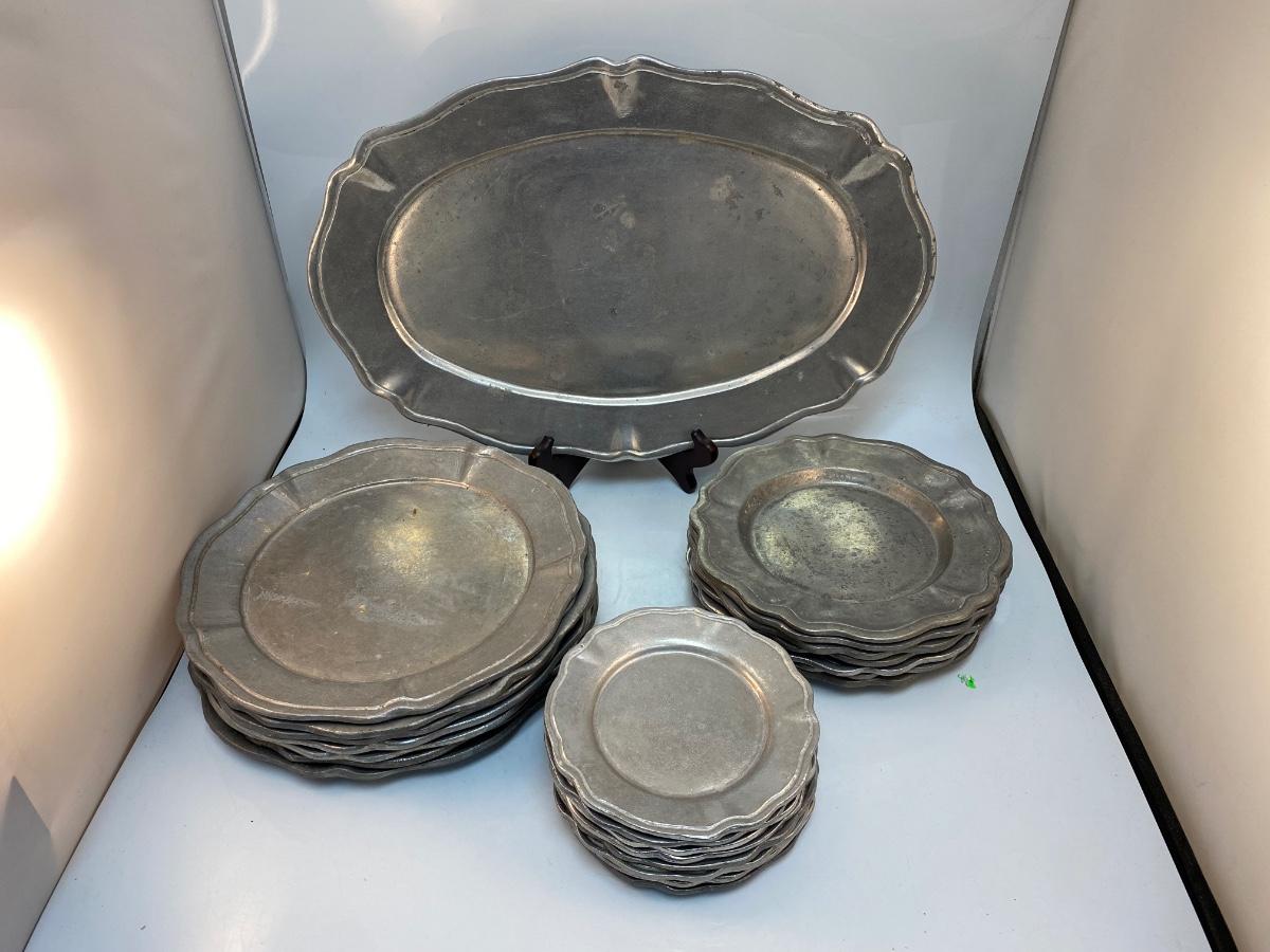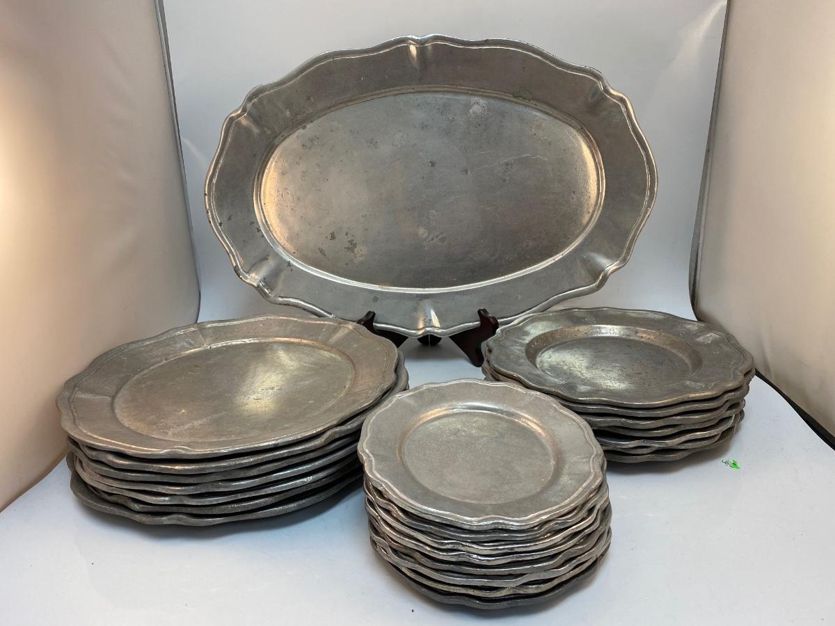 Vintage Gemetal Metal Alloy Dinner Set Plate Saucer Platter. Three sizes of plates and an oval serving platter. In used condition. Metal alloy serving pieces similar to Wilton Armetale.