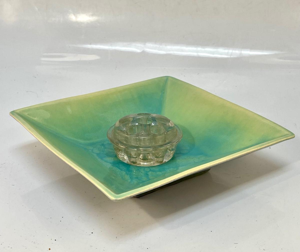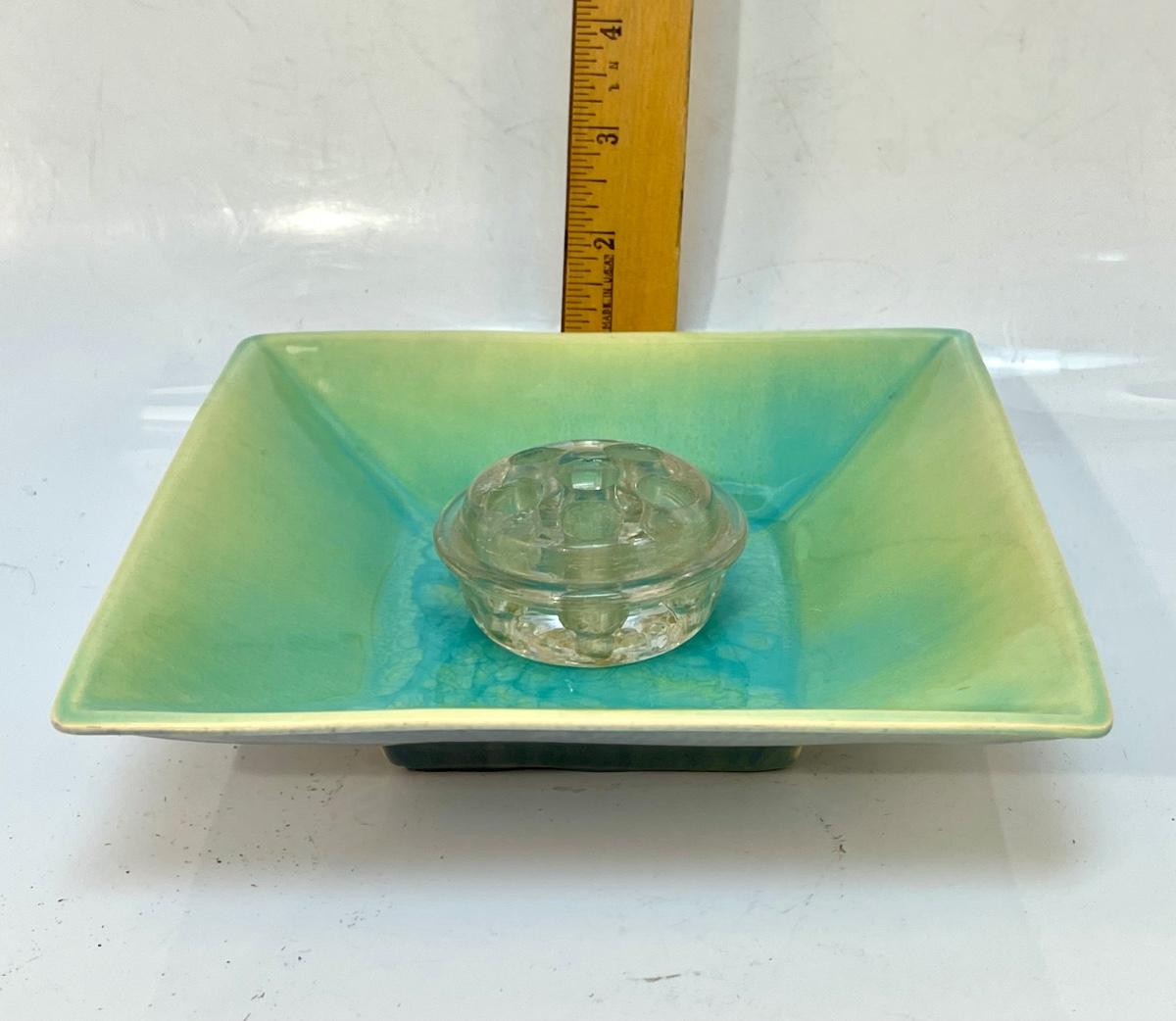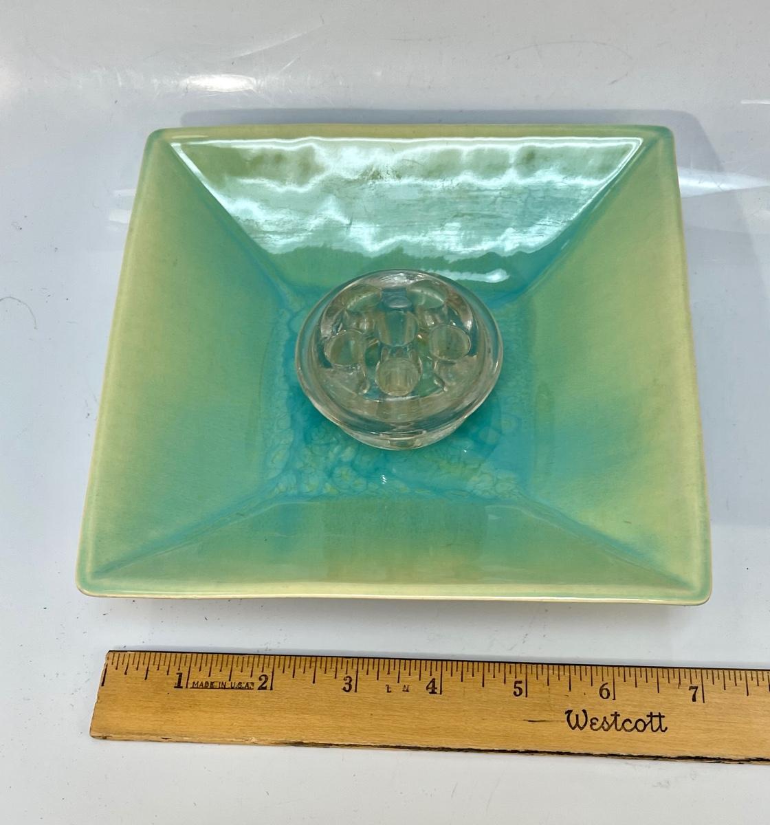 Vintage Square Pottery Plate Dish Yellow Green Blue Ombre Finish with Clear Glass Floral Frog. 7" plate. In vintage condition.