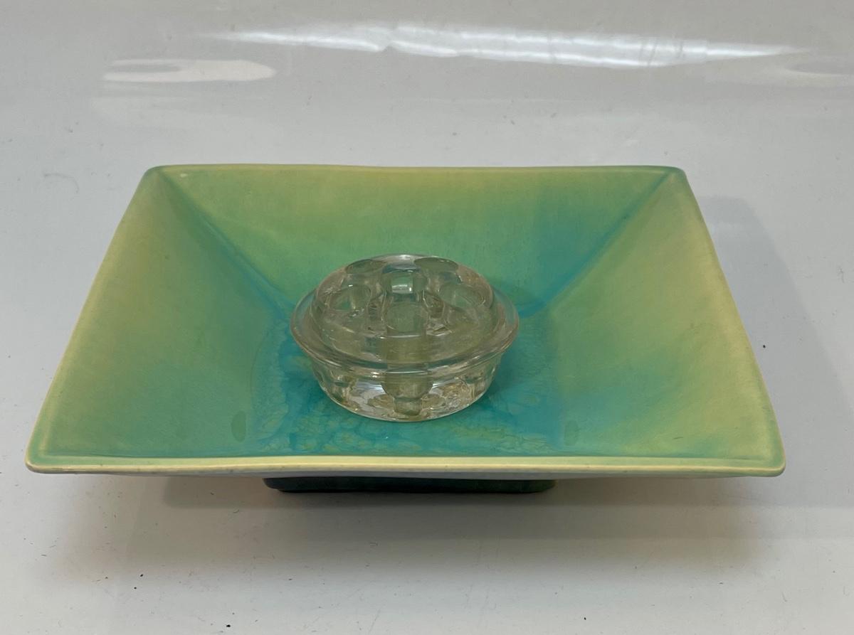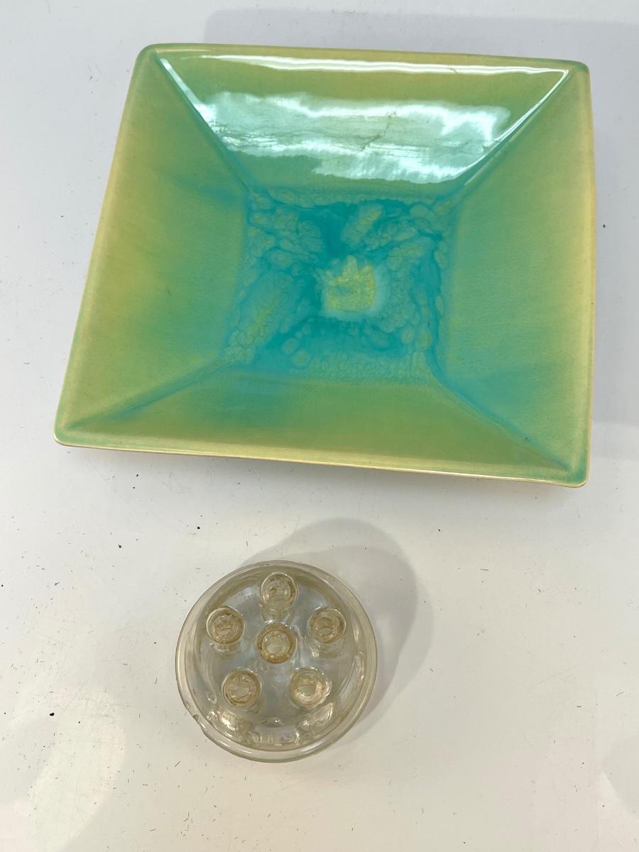 Vintage Square Pottery Plate Dish Yellow Green Blue Ombre Finish with Clear Glass Floral Frog