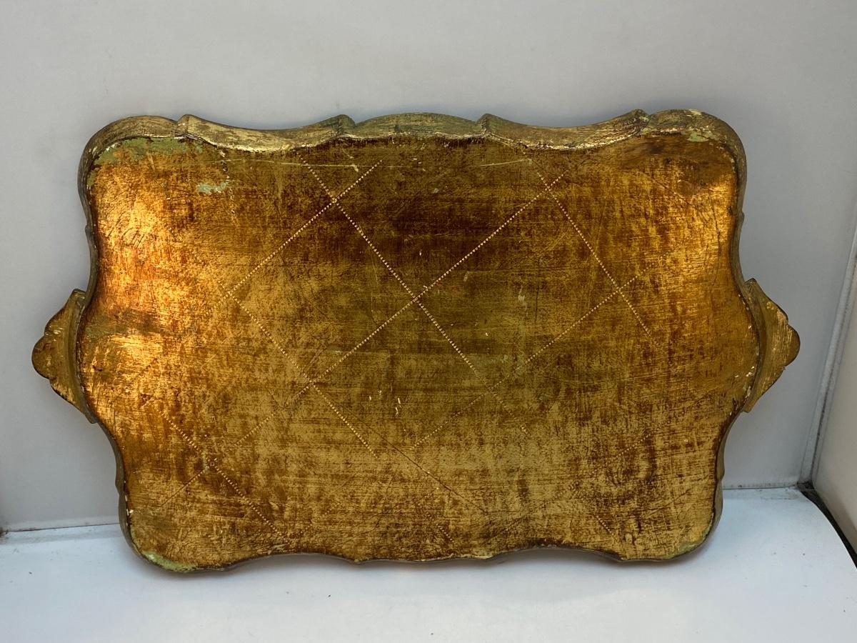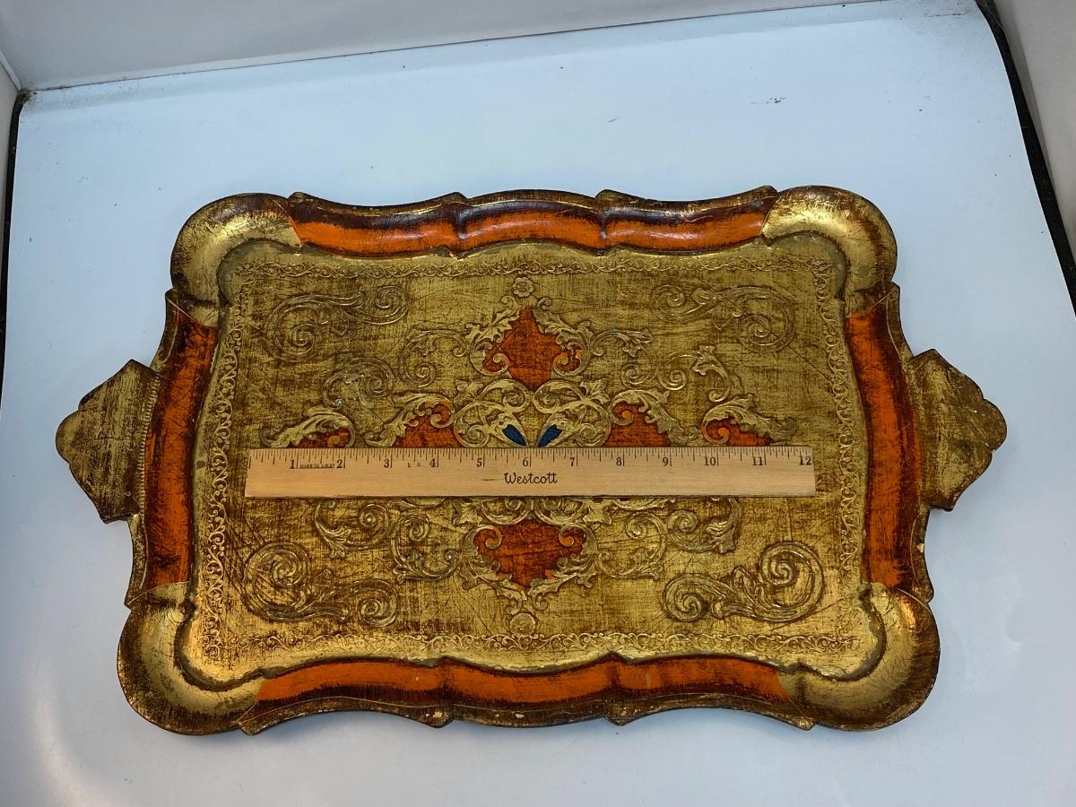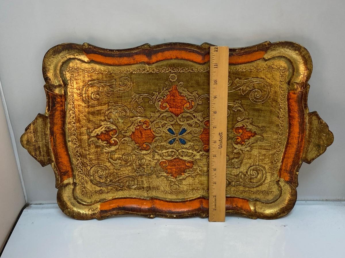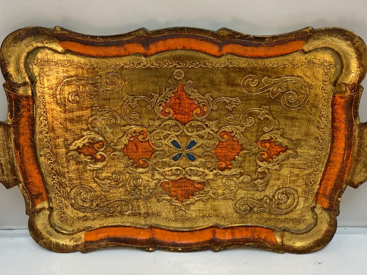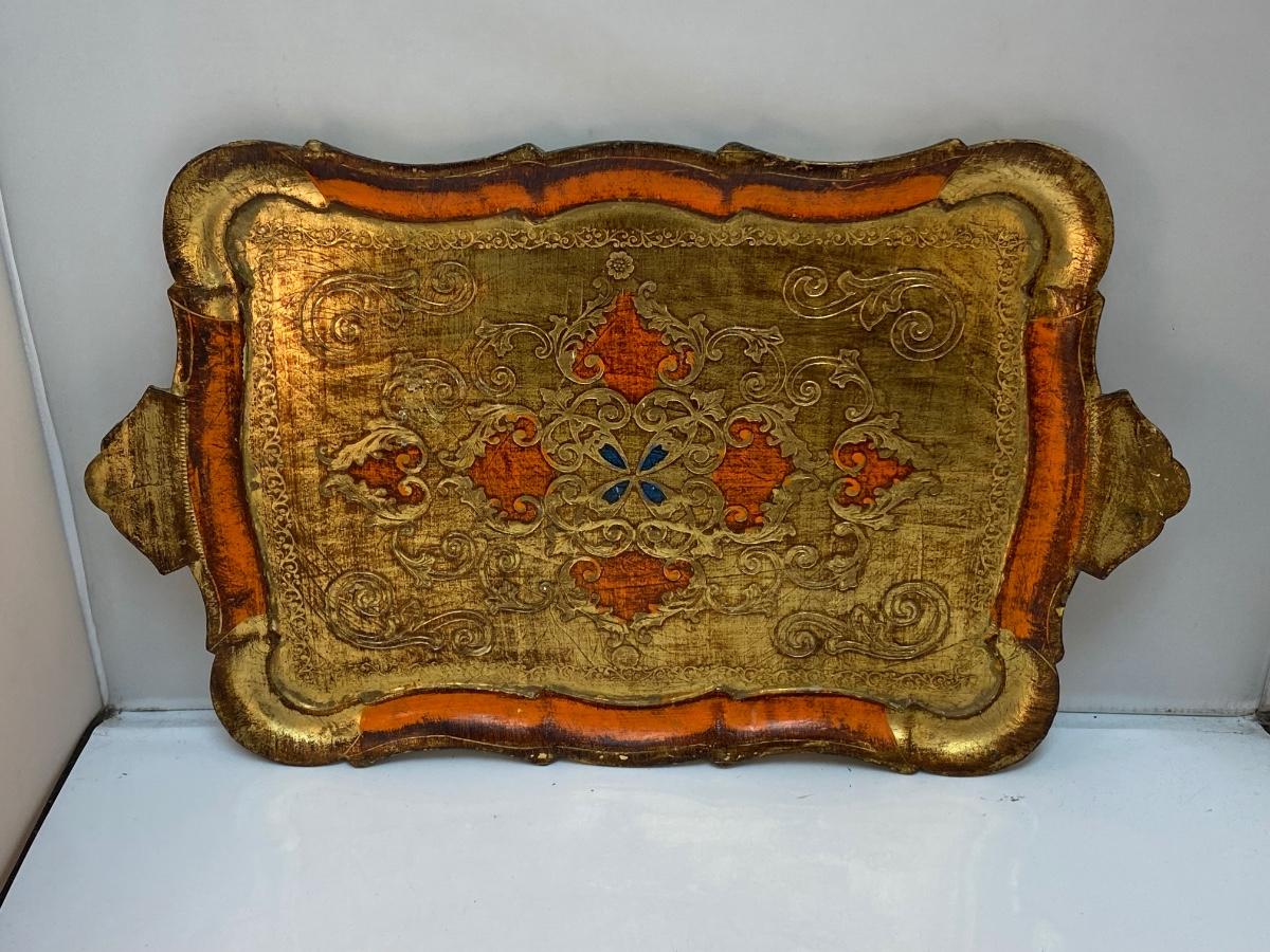 Vintage Mid Century Hollywood Regency Italian Florentine Gold & Orange Serving Tray Platter. In good vintage condition. Brilliant gold with orange and a hint of blue accents. Ornate embossed design. About 12" wide and close to 18" long. Did not notice or see any maker mark or name on the back.