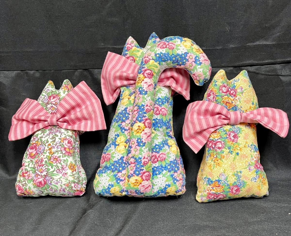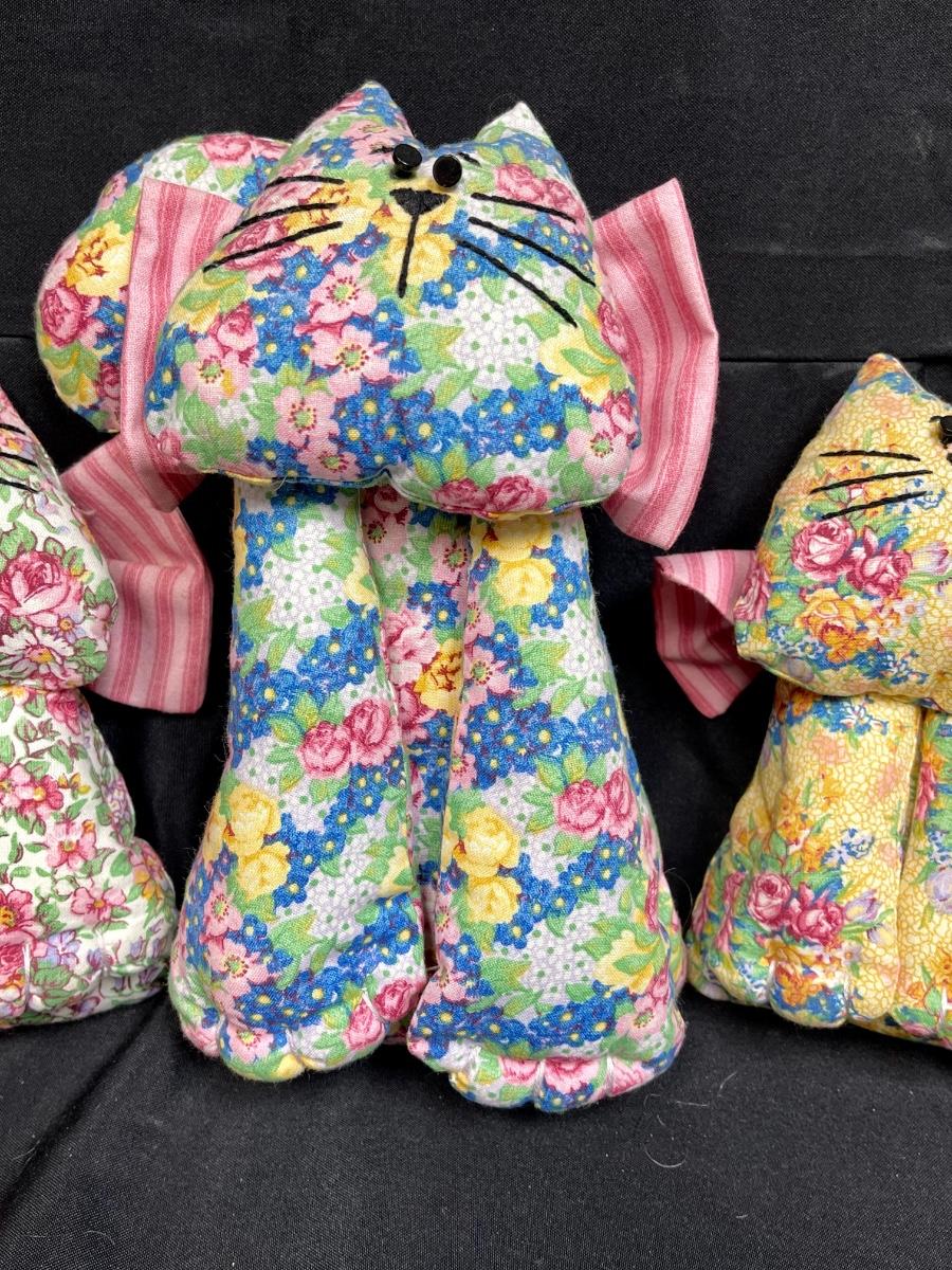 Set of Three Colorful Floral Pattern Plush Cat Kitten Shabby Chic Cottage Core Folk Art Dolls. In good previously displayed condition.