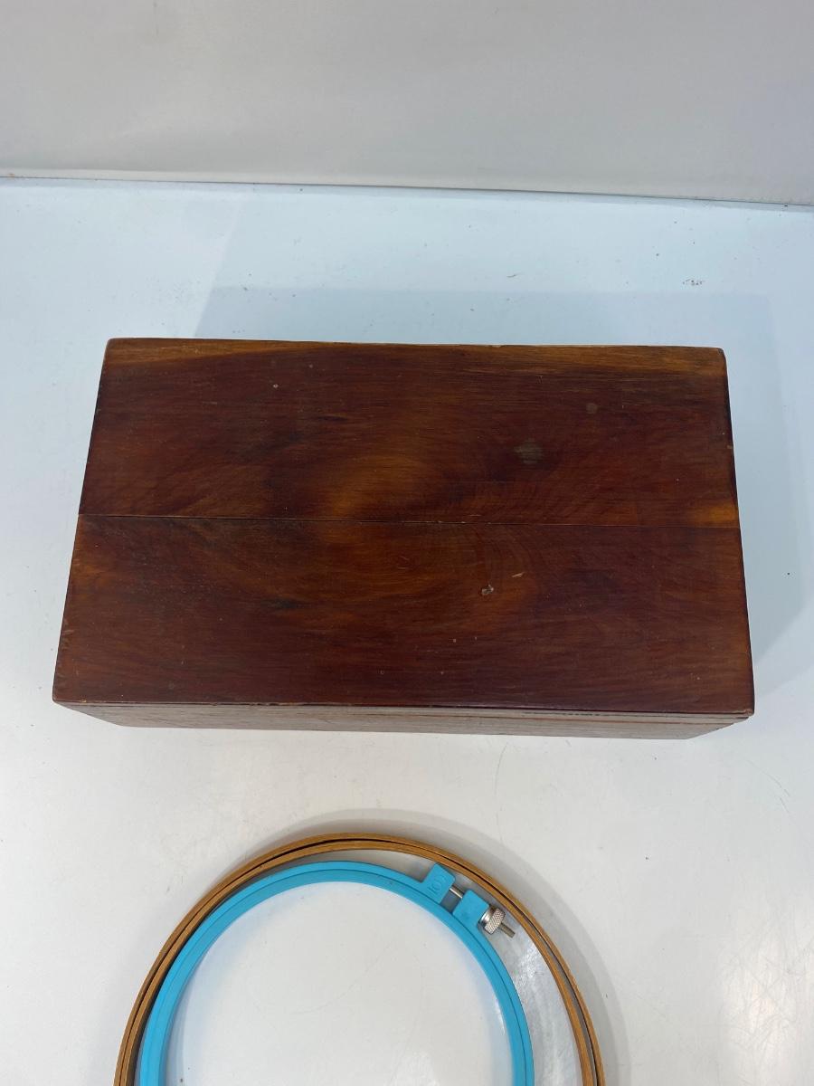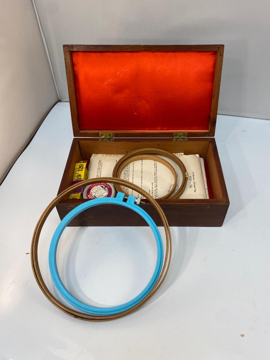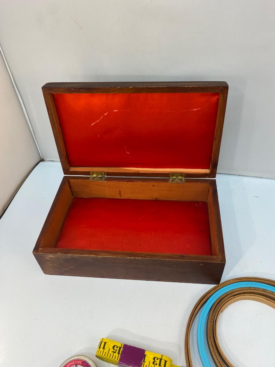 Mixed Lot of Crafting Sewing Items with Hinged Lid Wood Box