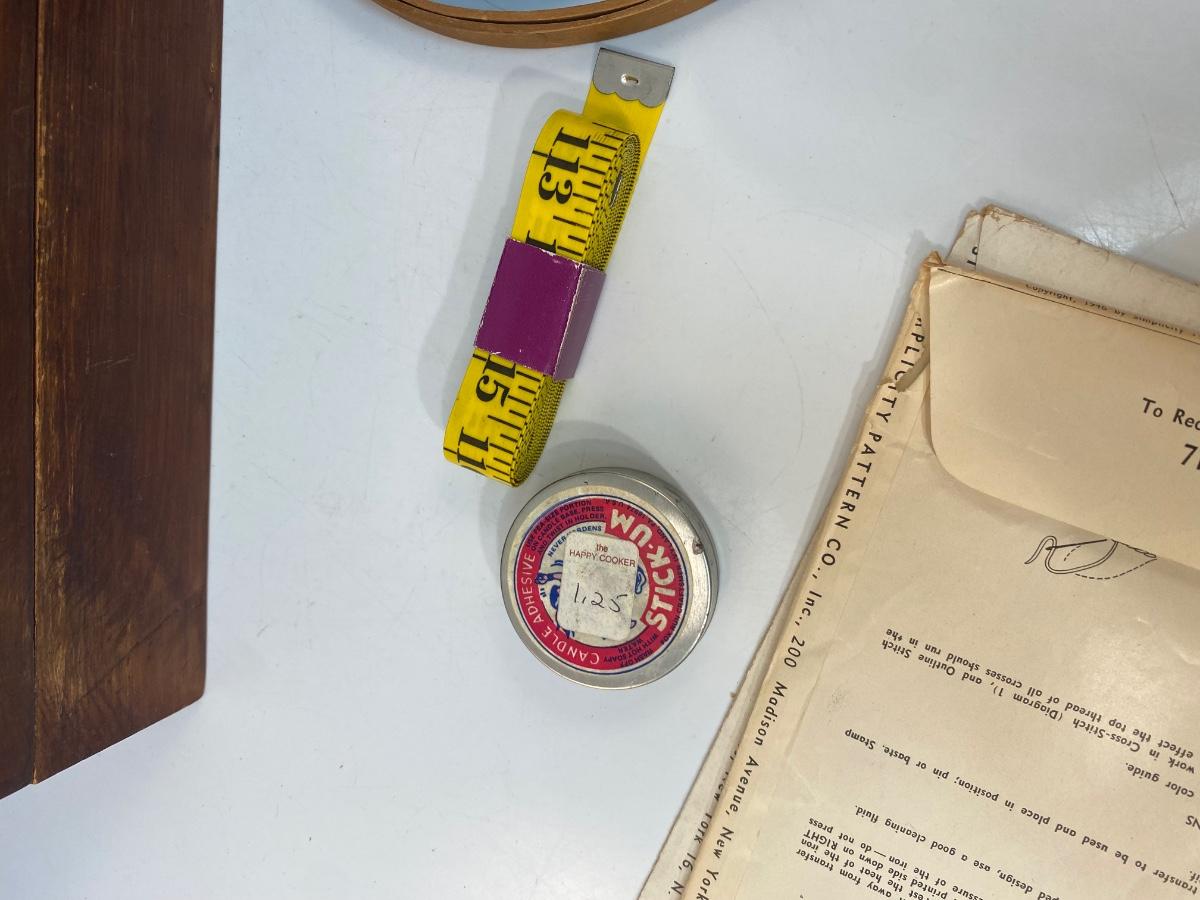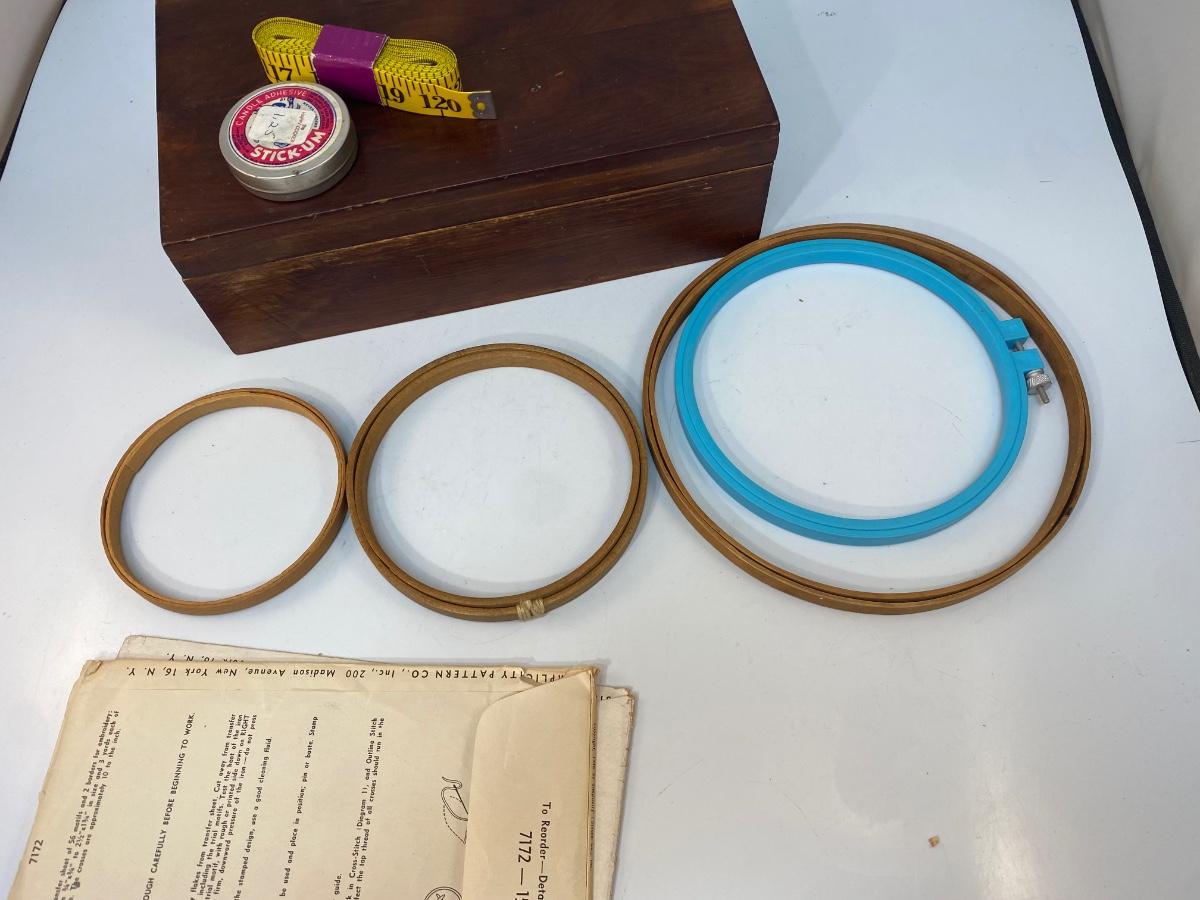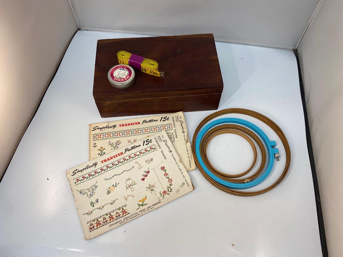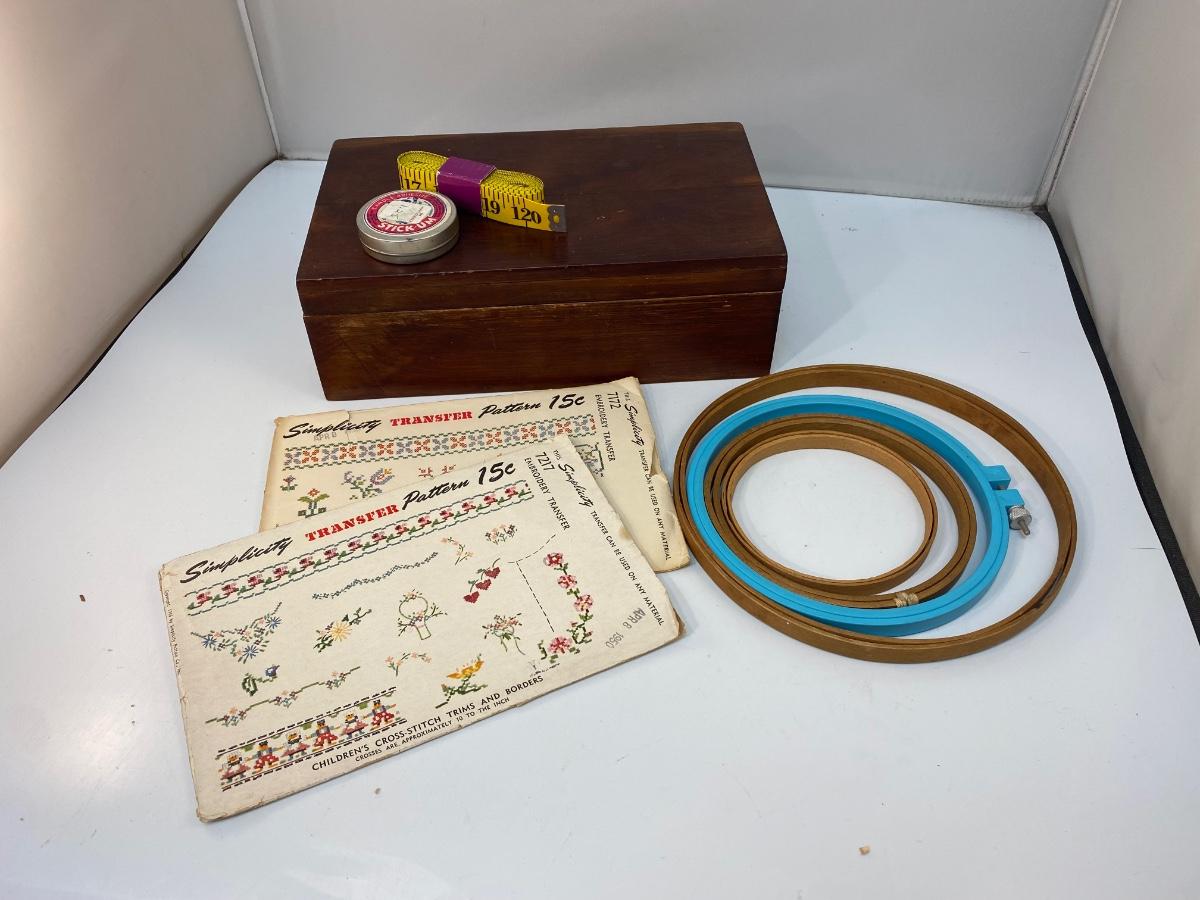 Mixed Lot of Crafting Sewing Items with Hinged Lid Wood Box. Everything in good vintage condition. There does seem to be patterns in both envelopes unsure for completeness.