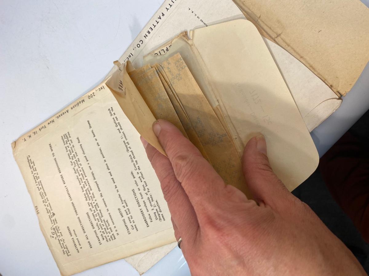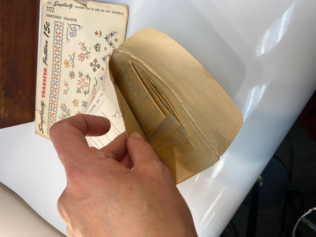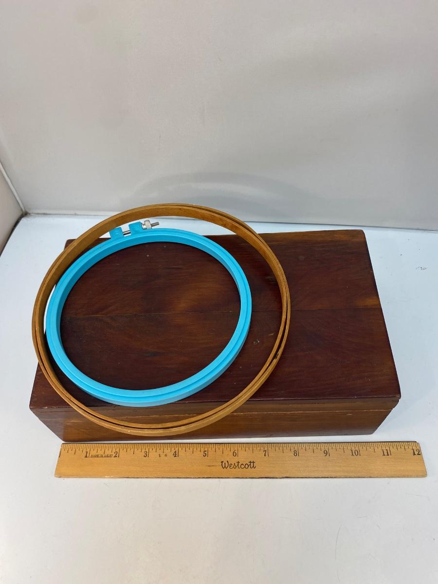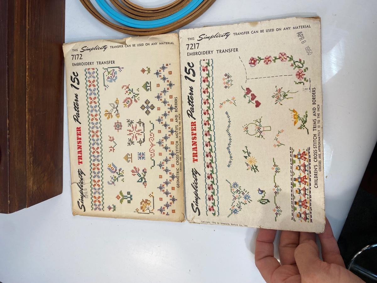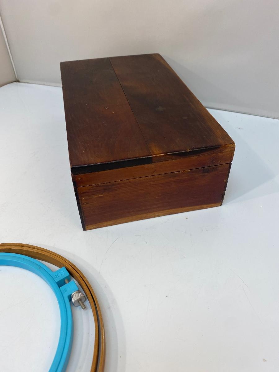 Mixed Lot of Crafting Sewing Items with Hinged Lid Wood Box. Everything in good vintage condition. There does seem to be patterns in both envelopes unsure for completeness.