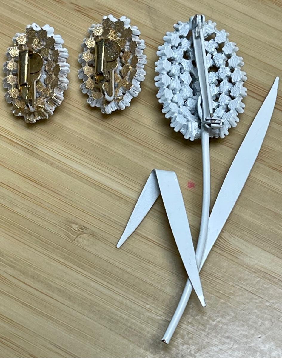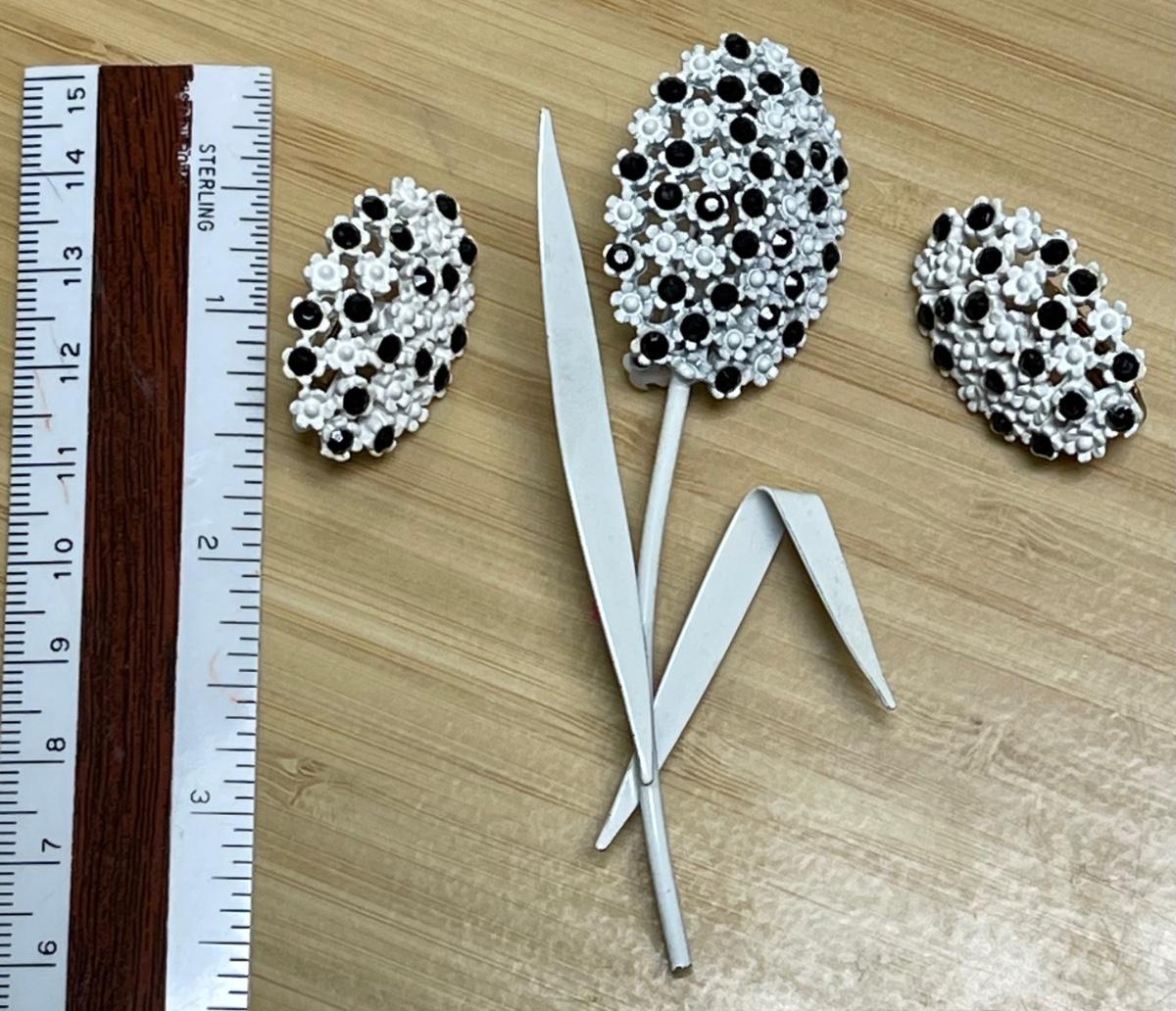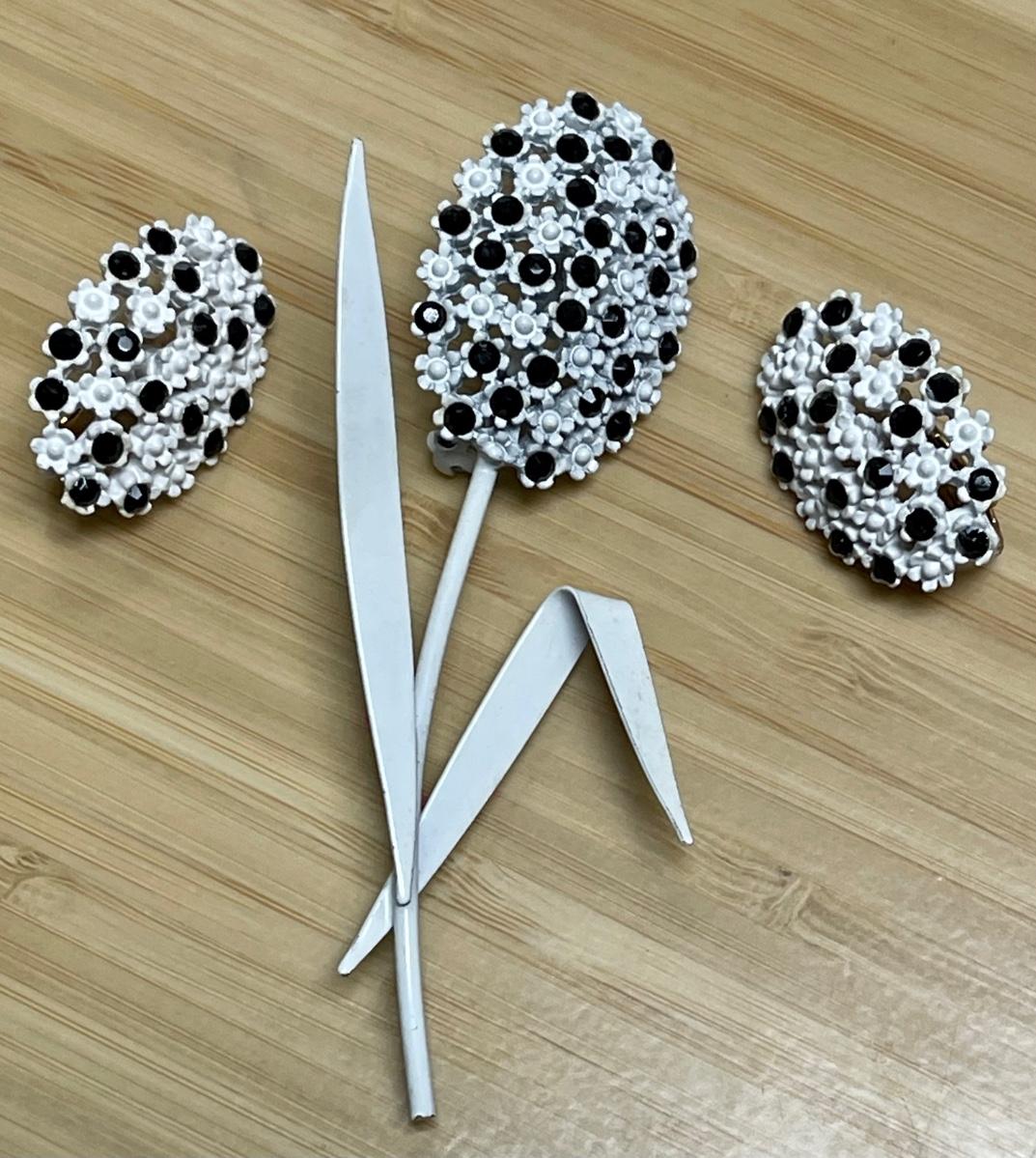 Vintage White Enamel & Black Rhinestone Pin and Earring Set Cluster Flowers