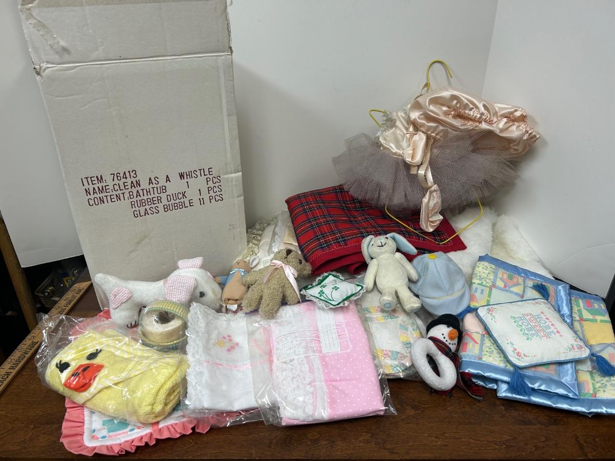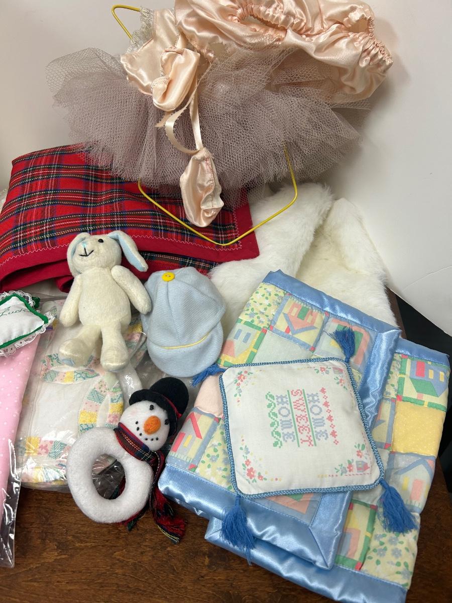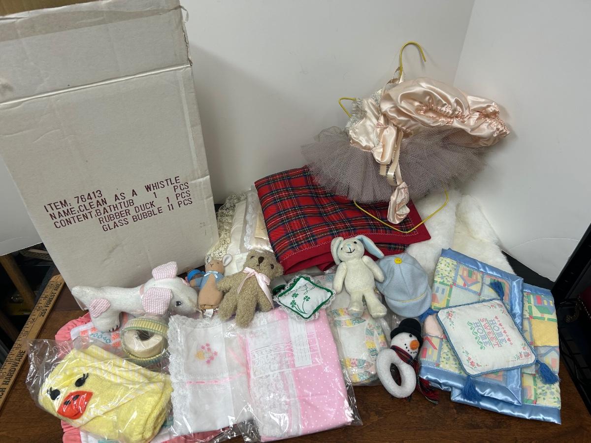 Mixed Lot of Various Doll Blankets and Accessories. The box contains a plastic bathtub, still in original packaging. There is some discoloration from age and dusty on some of the blankets.
