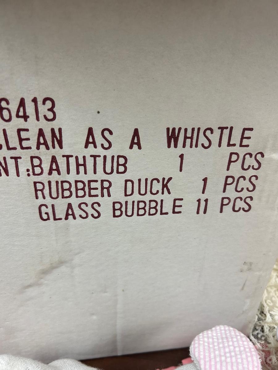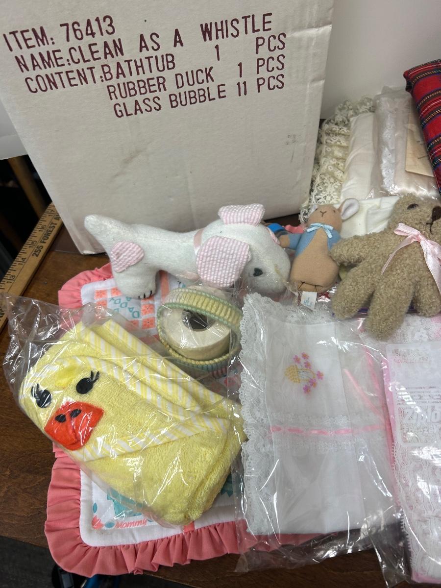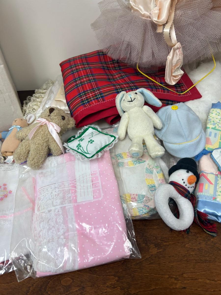Mixed Lot of Various Doll Blankets and Accessories. The box contains a plastic bathtub, still in original packaging. There is some discoloration from age and dusty on some of the blankets.