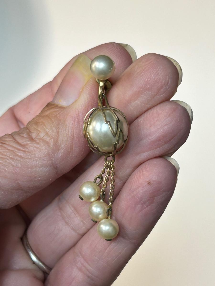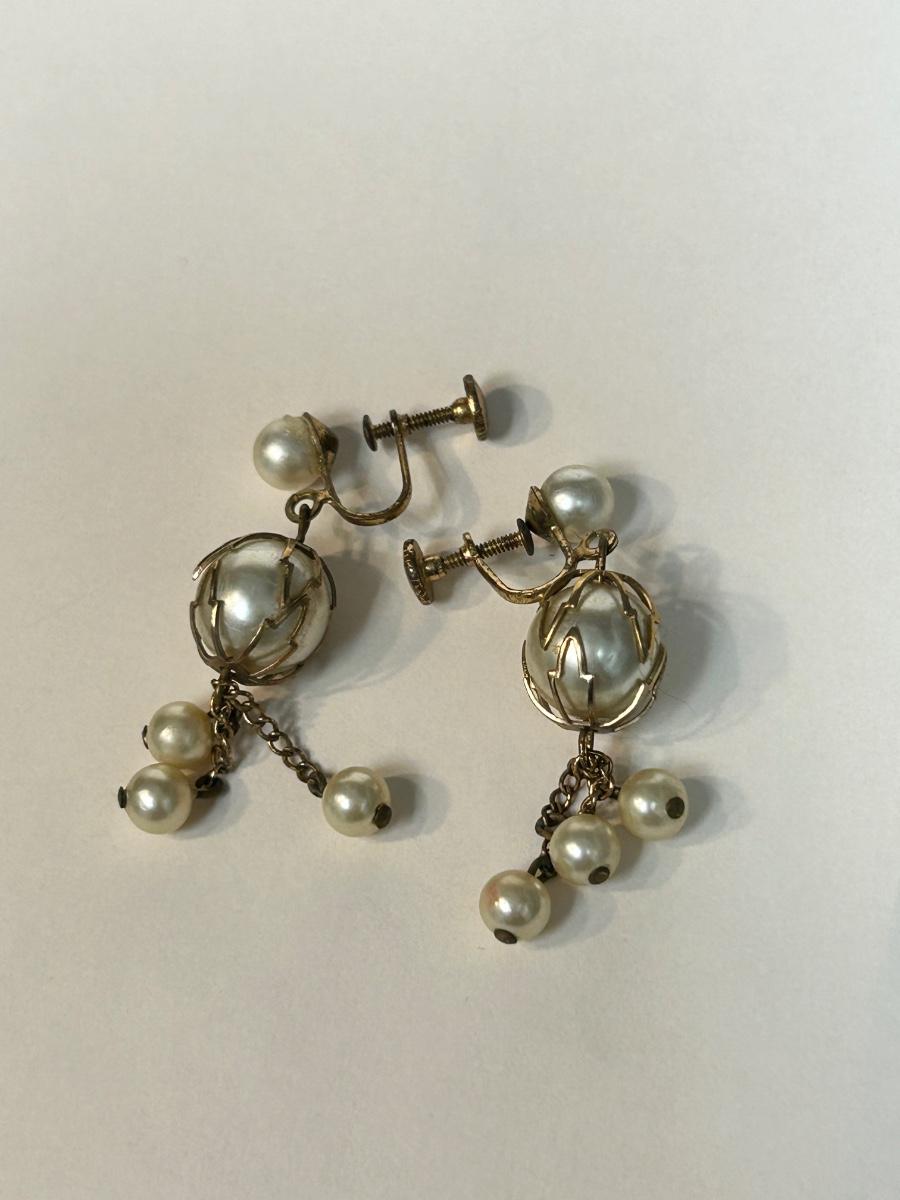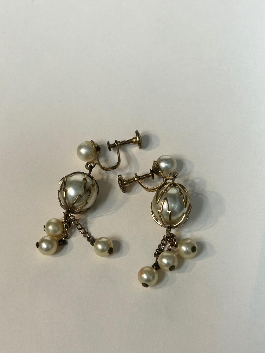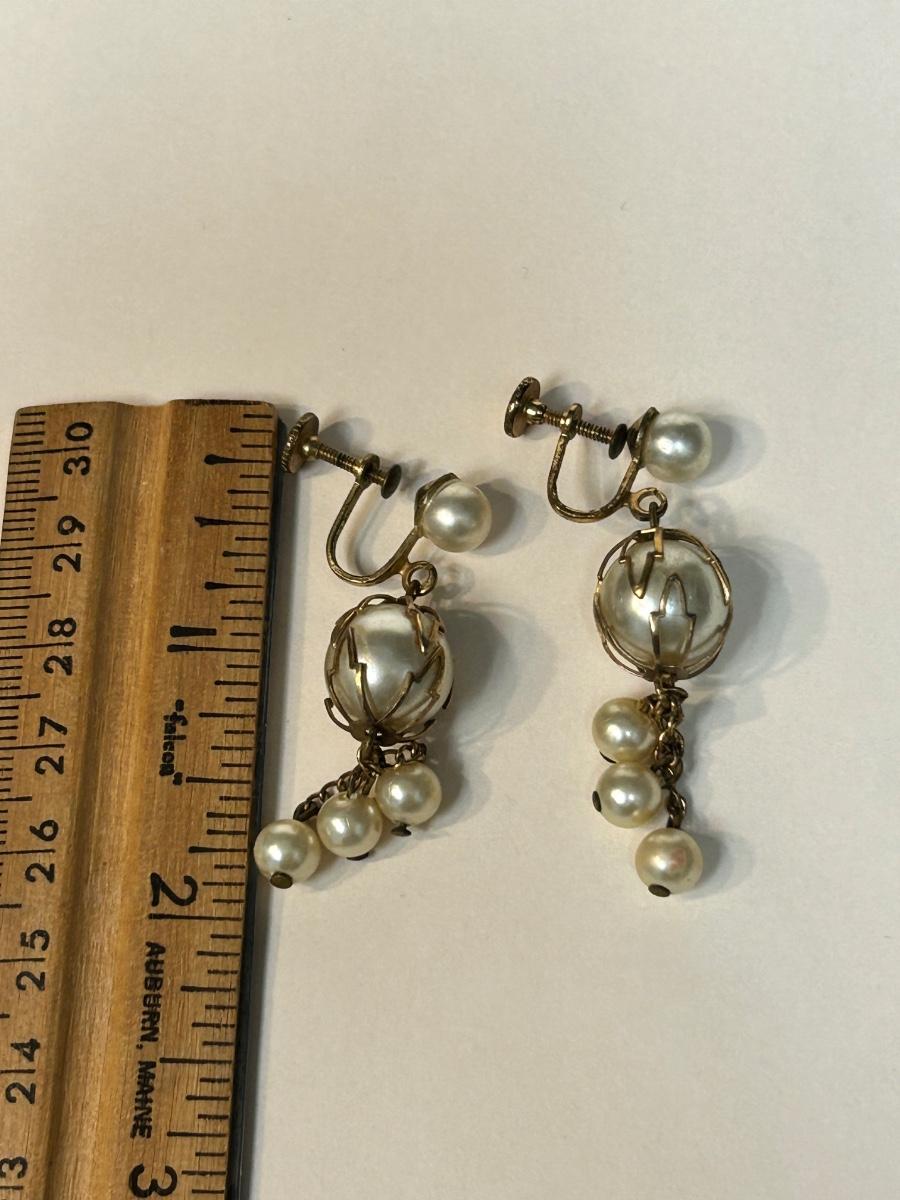 Pair of Vintage Gold Tone Metal and Faux Pearl Dangling Screw Back Earrings. In good condition.