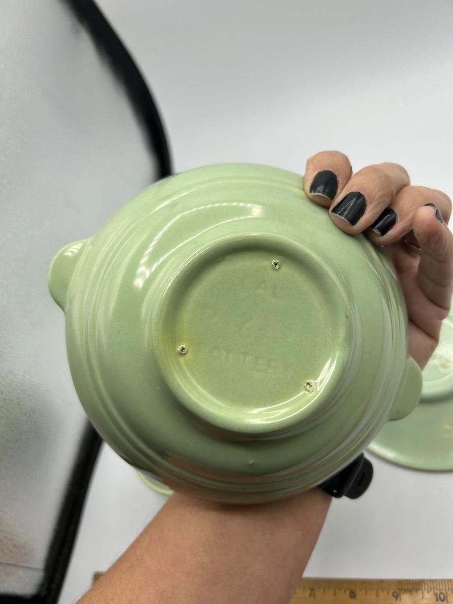 Vintage Pale Sea Foam Green California Pottery Dishes Cup with Saucer Small Bowl Plate. Tiny chip in bowl edge. Great pale green color. Some pieces marked.