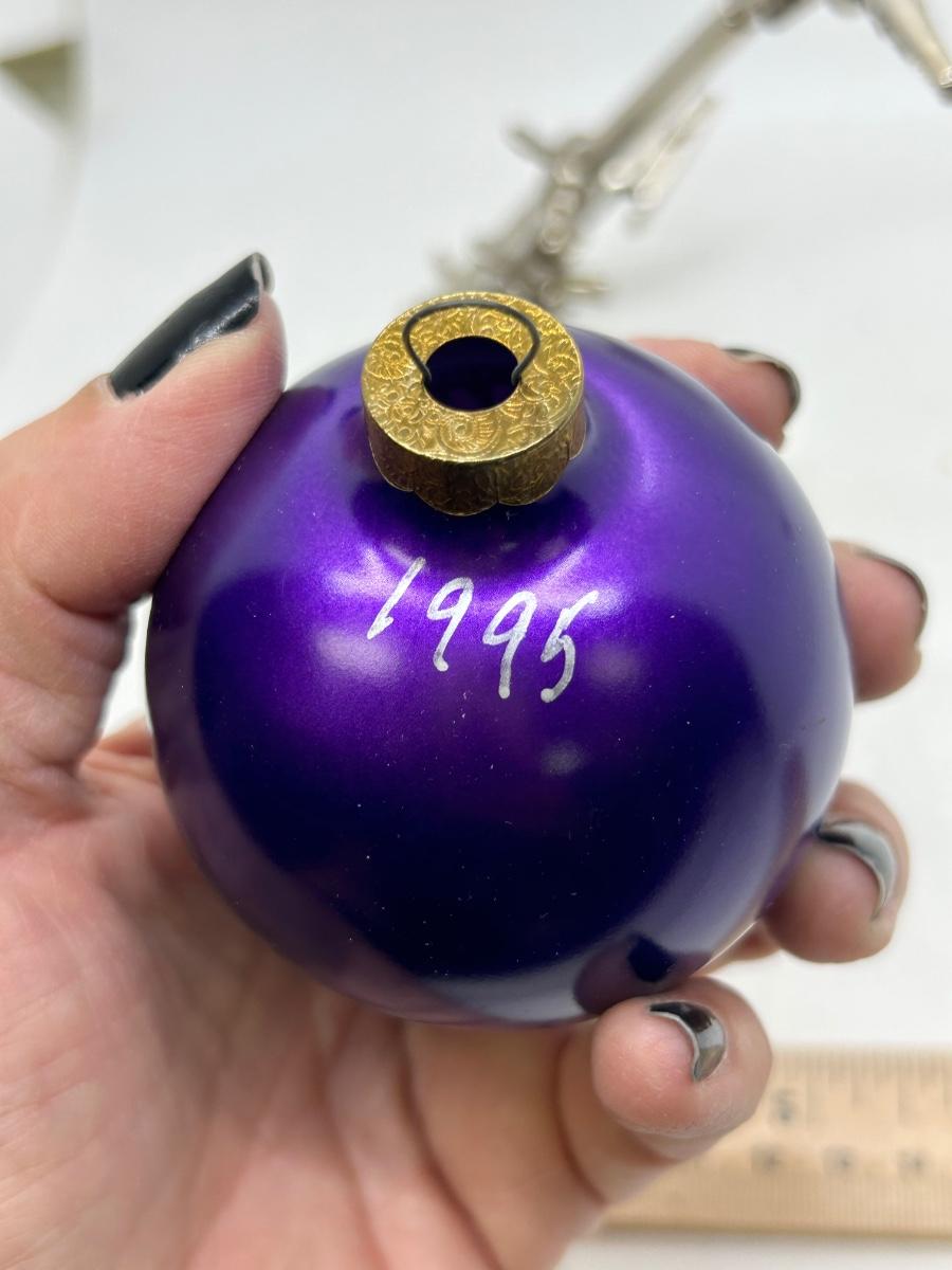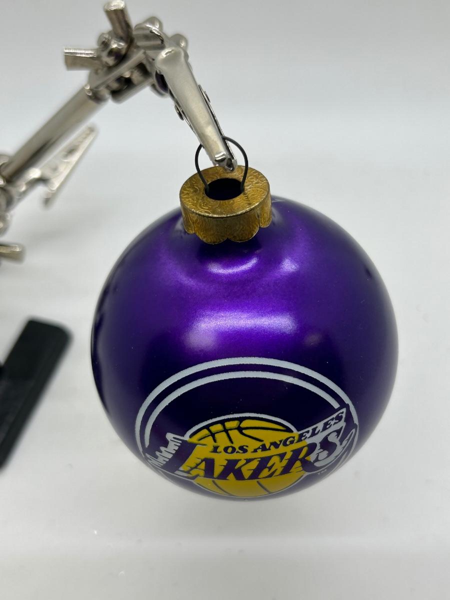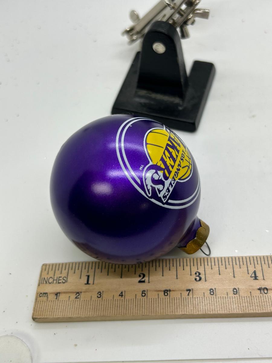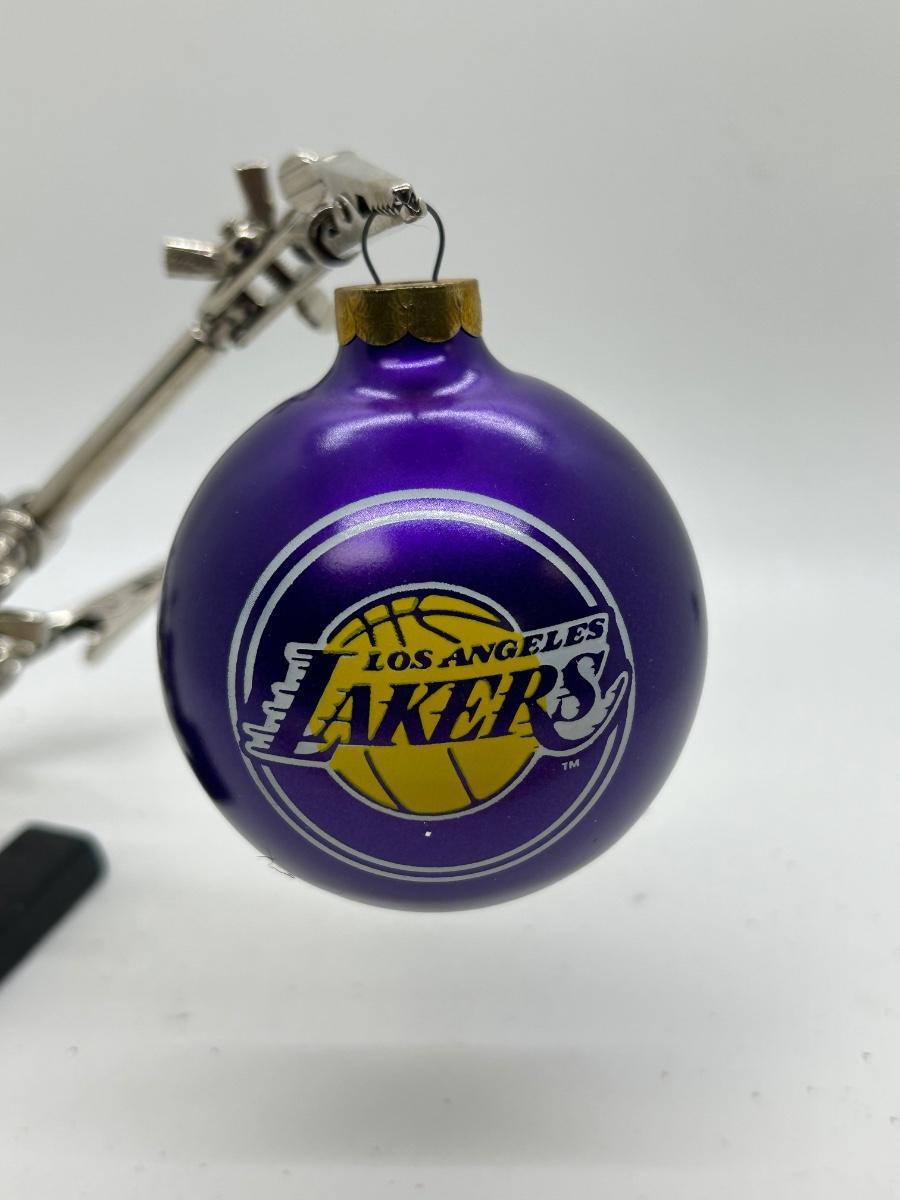 Purple and Gold Blown Glass Los Angeles Lakers NBA Basketball Christmas Holiday Tree Ornament. in good condition, little signs of wear. Previous owner dated the top at the back.