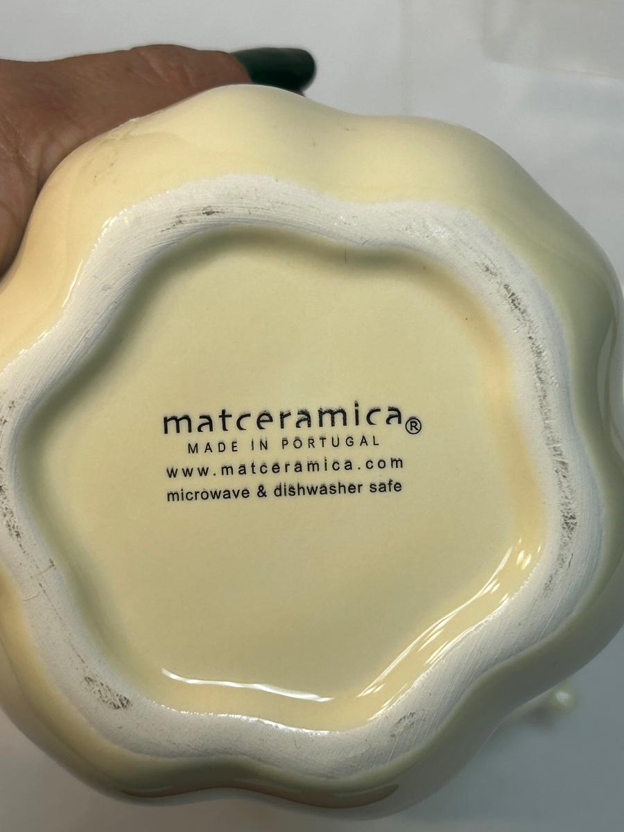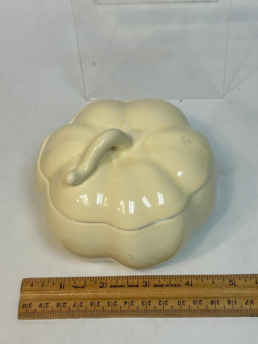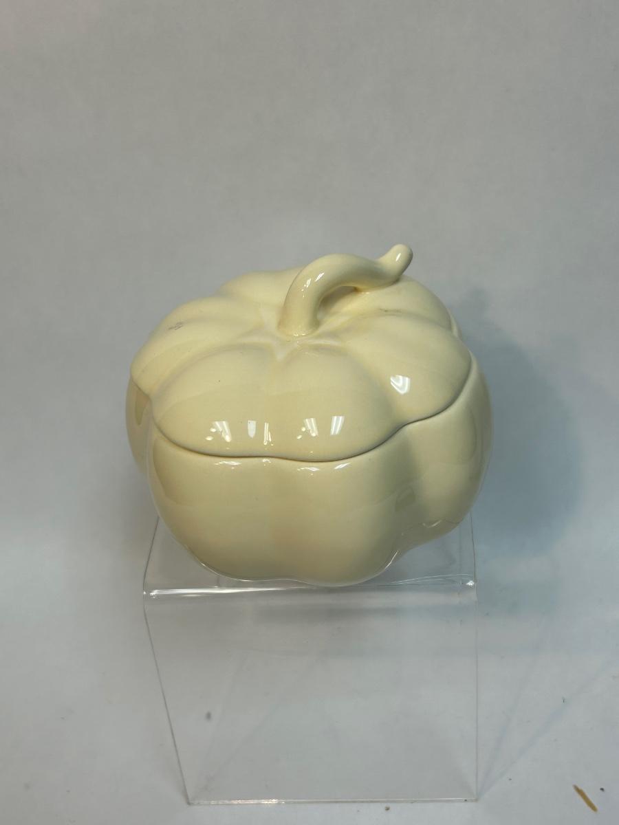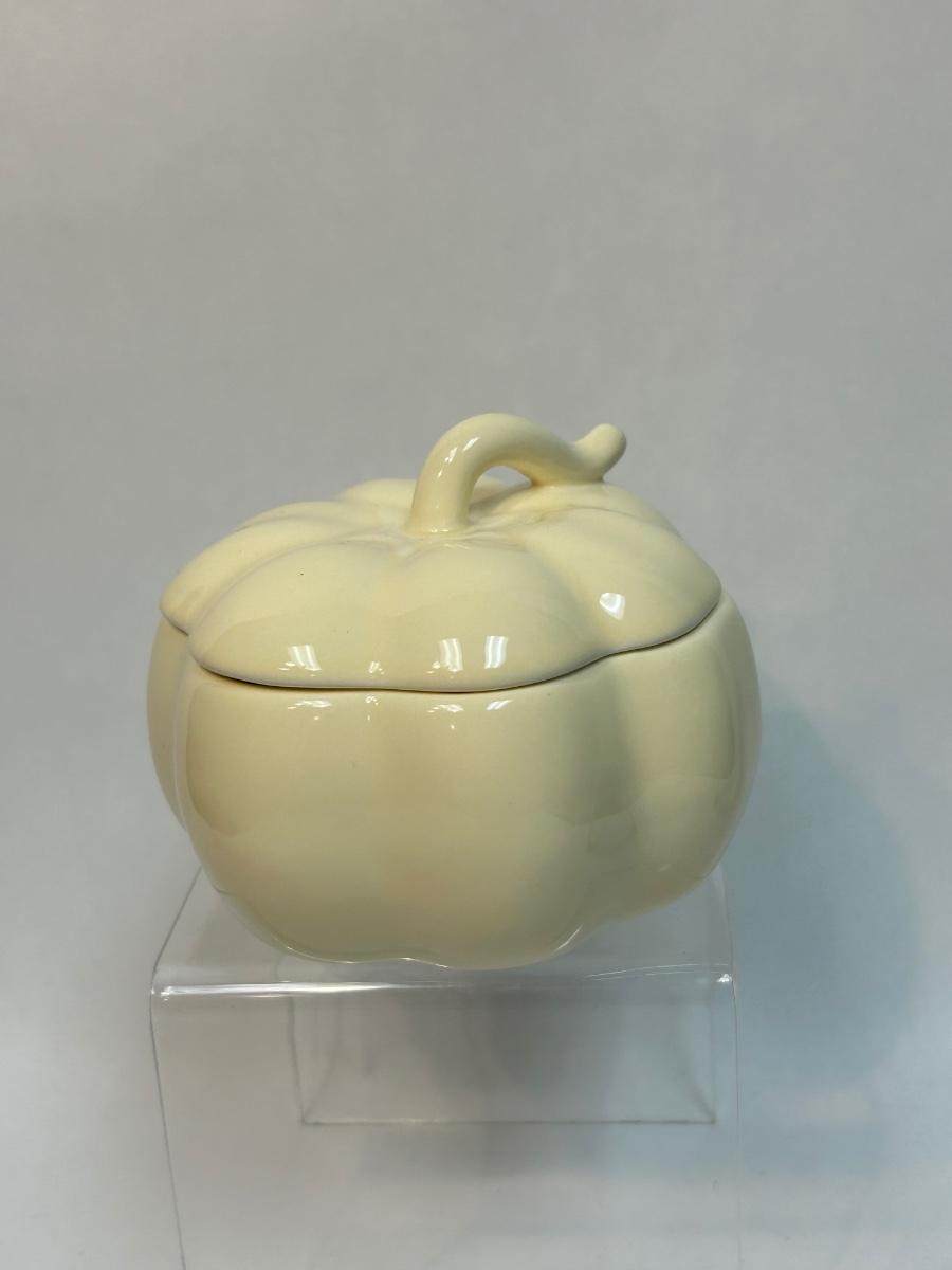 Matceramica Pale Yellow Ceramic Pumpkin Shaped Candy Dish Lidded Bowl. In good condition. About 5" diameter.