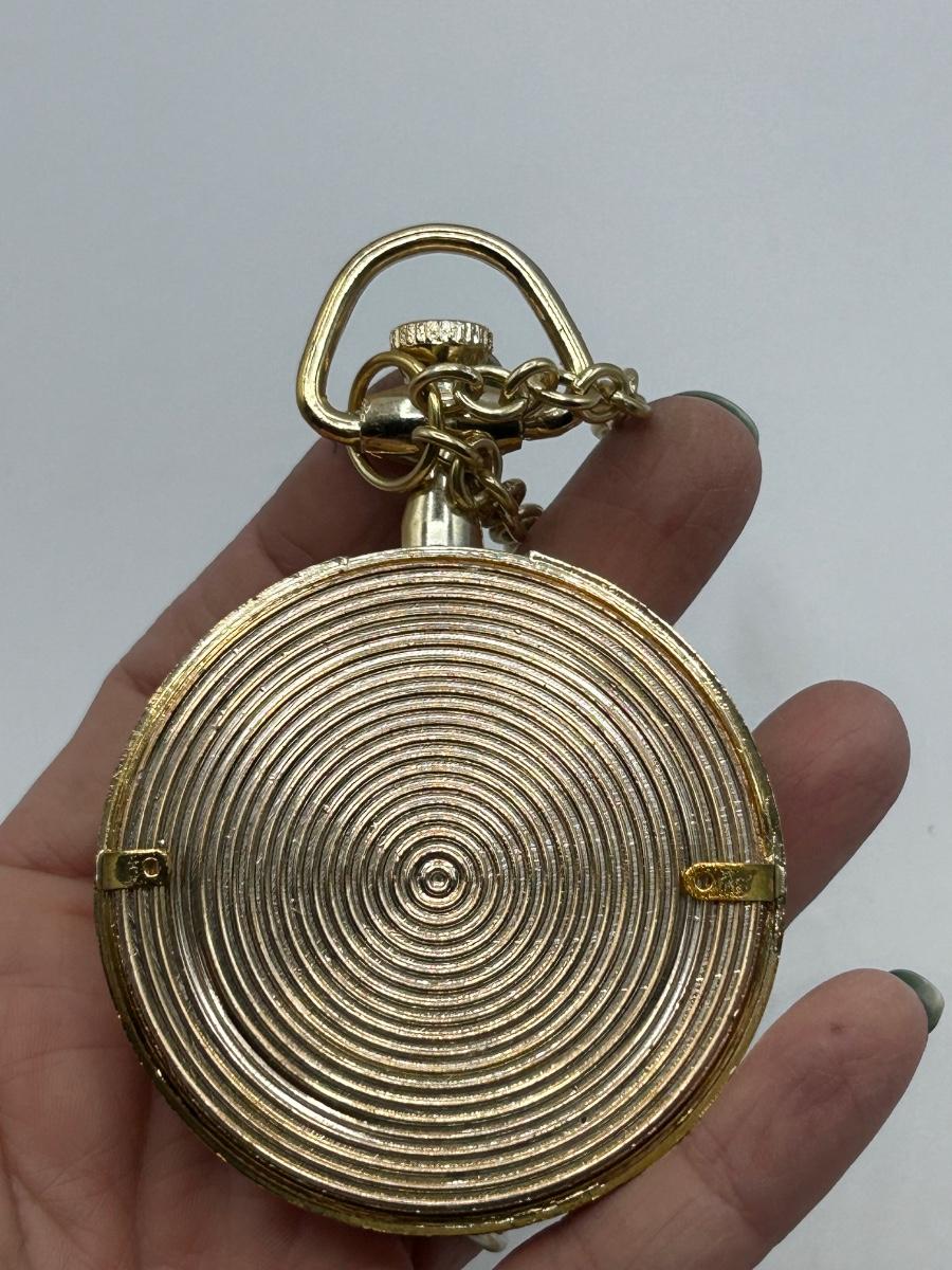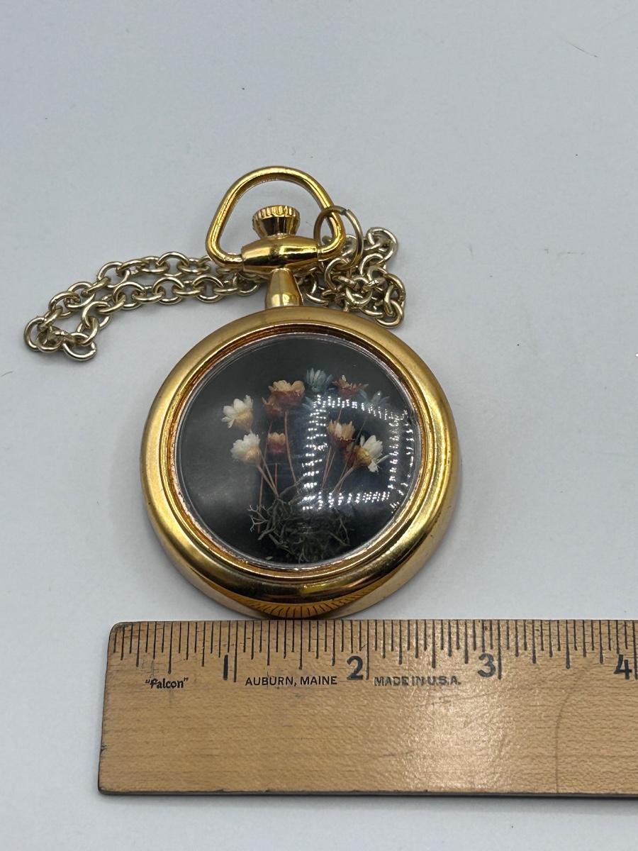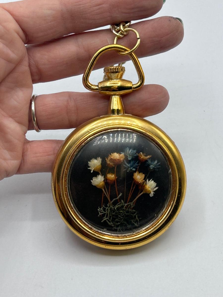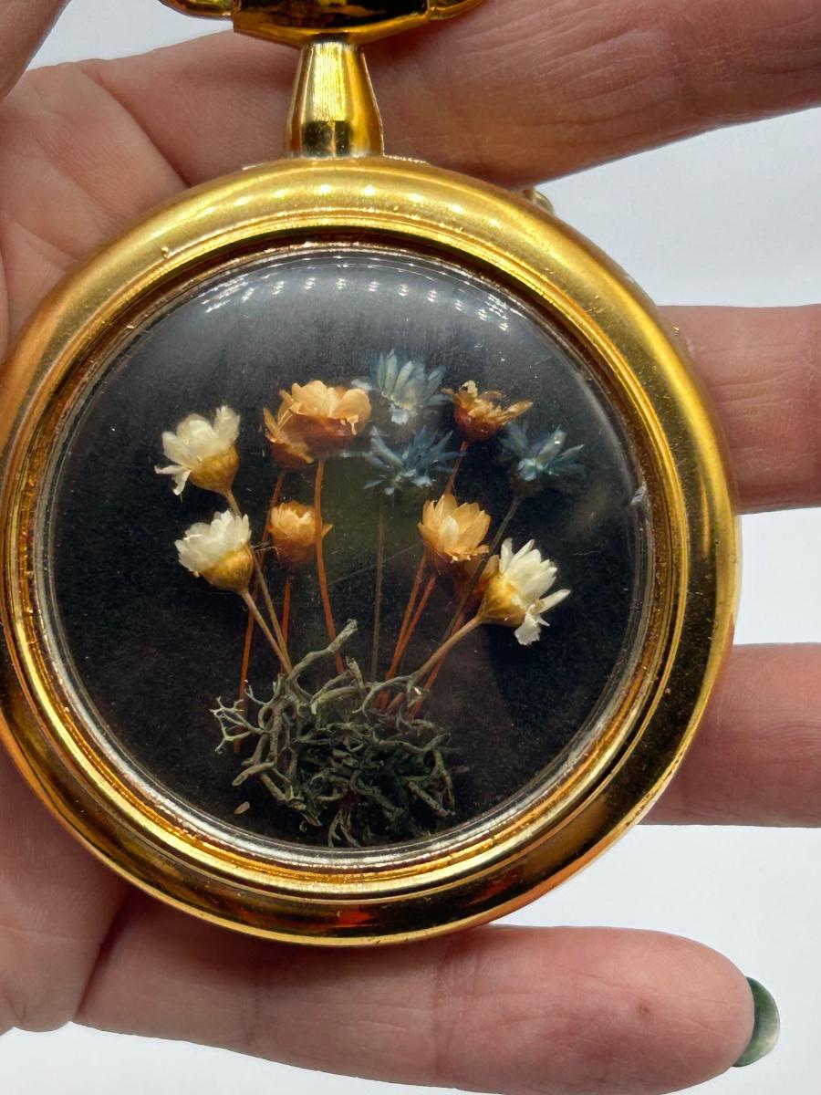 Vintage Retro Tiny Dried Flower in Plastic Gold Tone Medallion Frame. In good vintage condition. Frame looks like a pocket watch in a way.