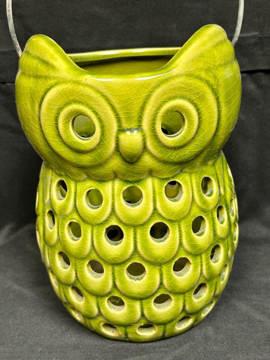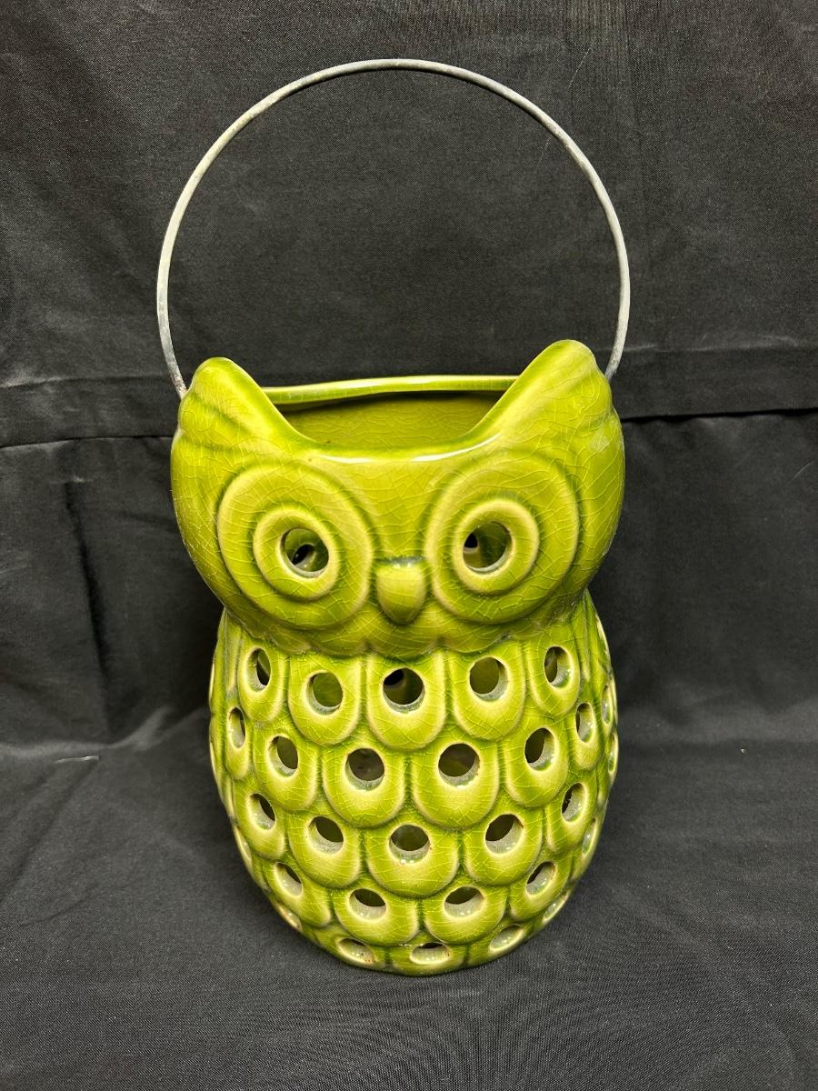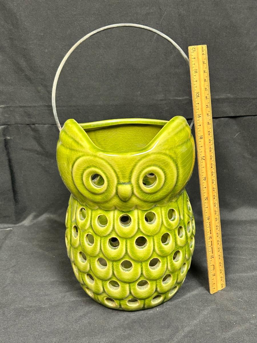 Green Ceramic Owl Shaped Outdoor Candle Lantern Garden Patio. In good used condition. The ceramic is crazed but it displays well and is useable. About 9" size not including the handle.
