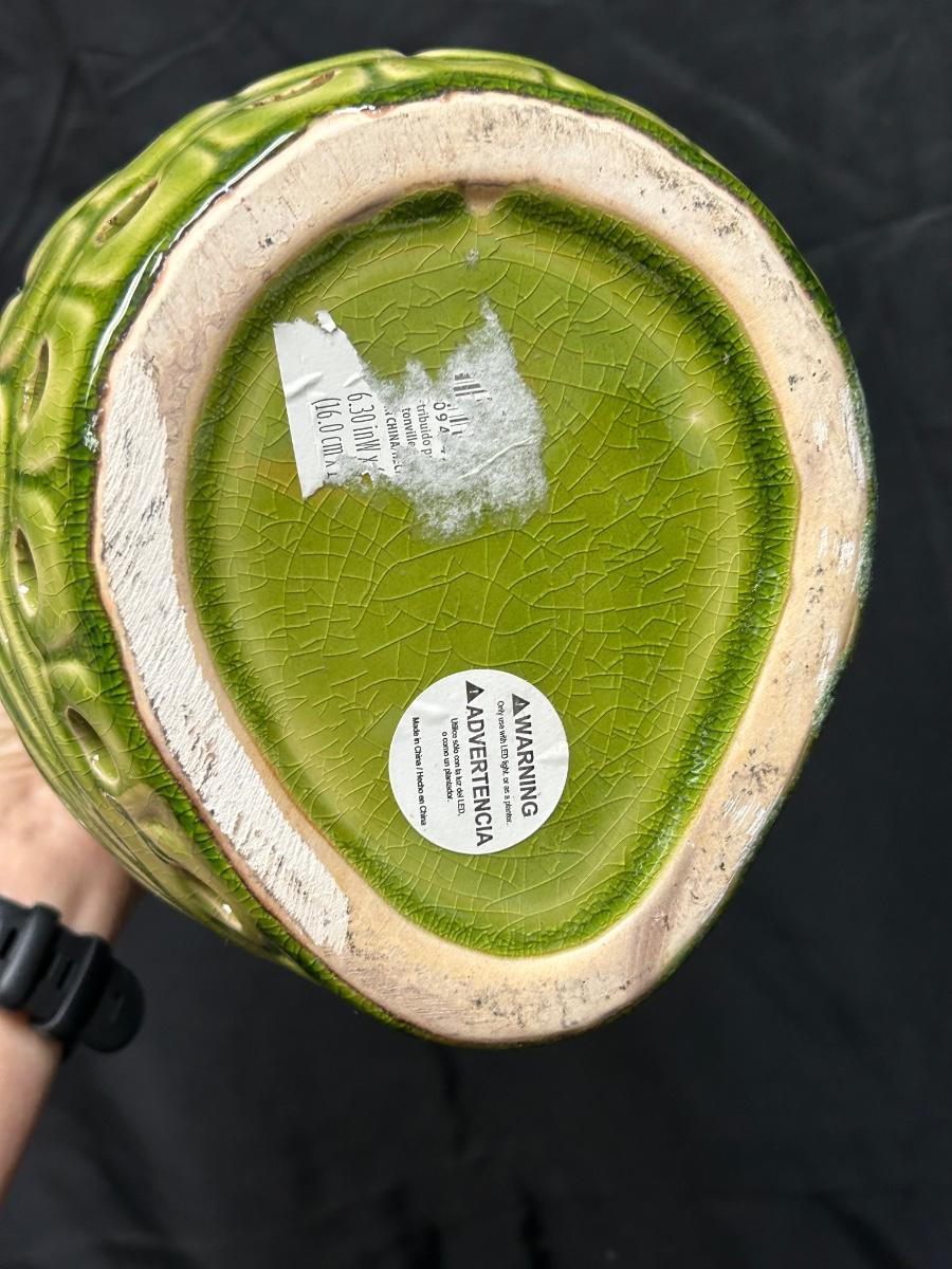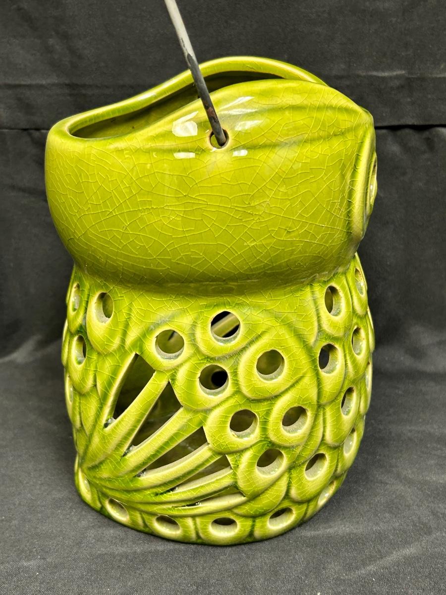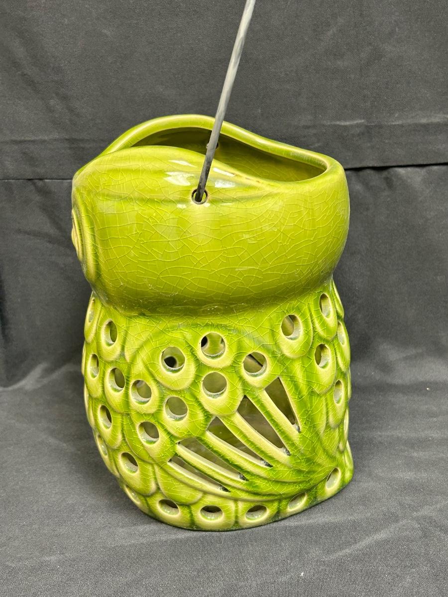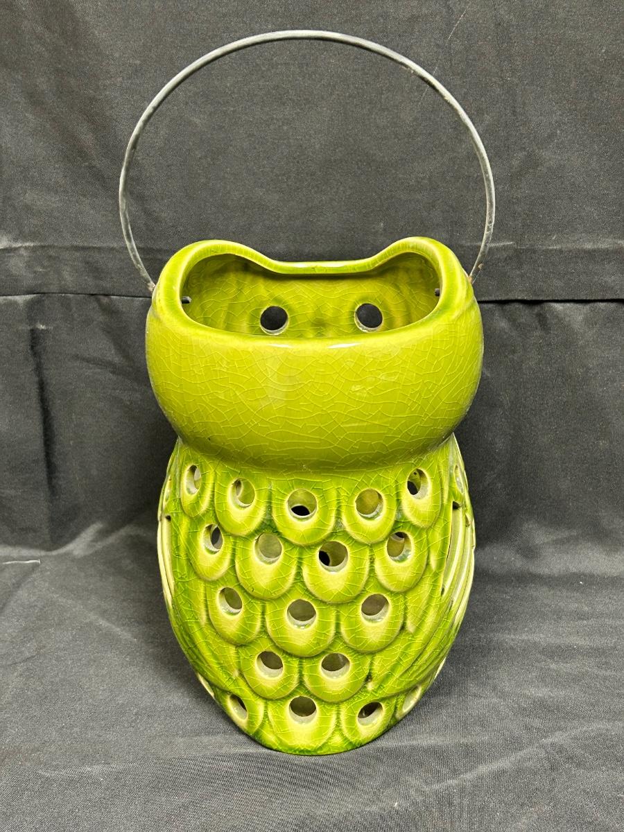 Green Ceramic Owl Shaped Outdoor Candle Lantern Garden Patio. In good used condition. The ceramic is crazed but it displays well and is useable. About 9" size not including the handle.
