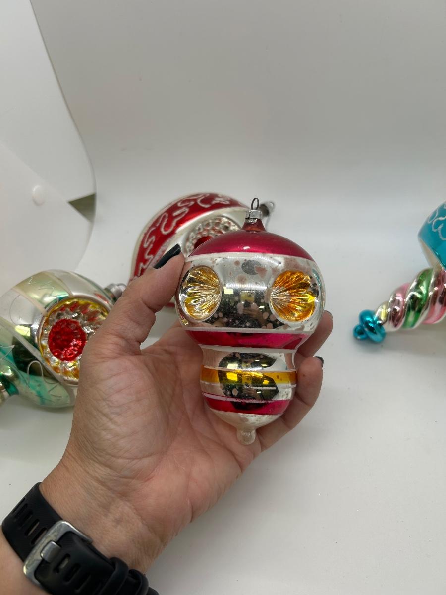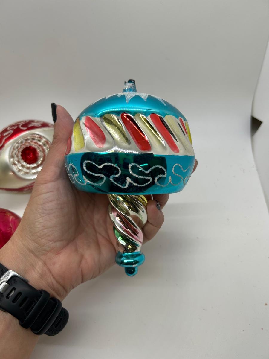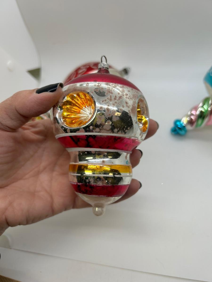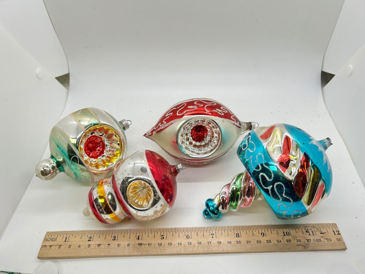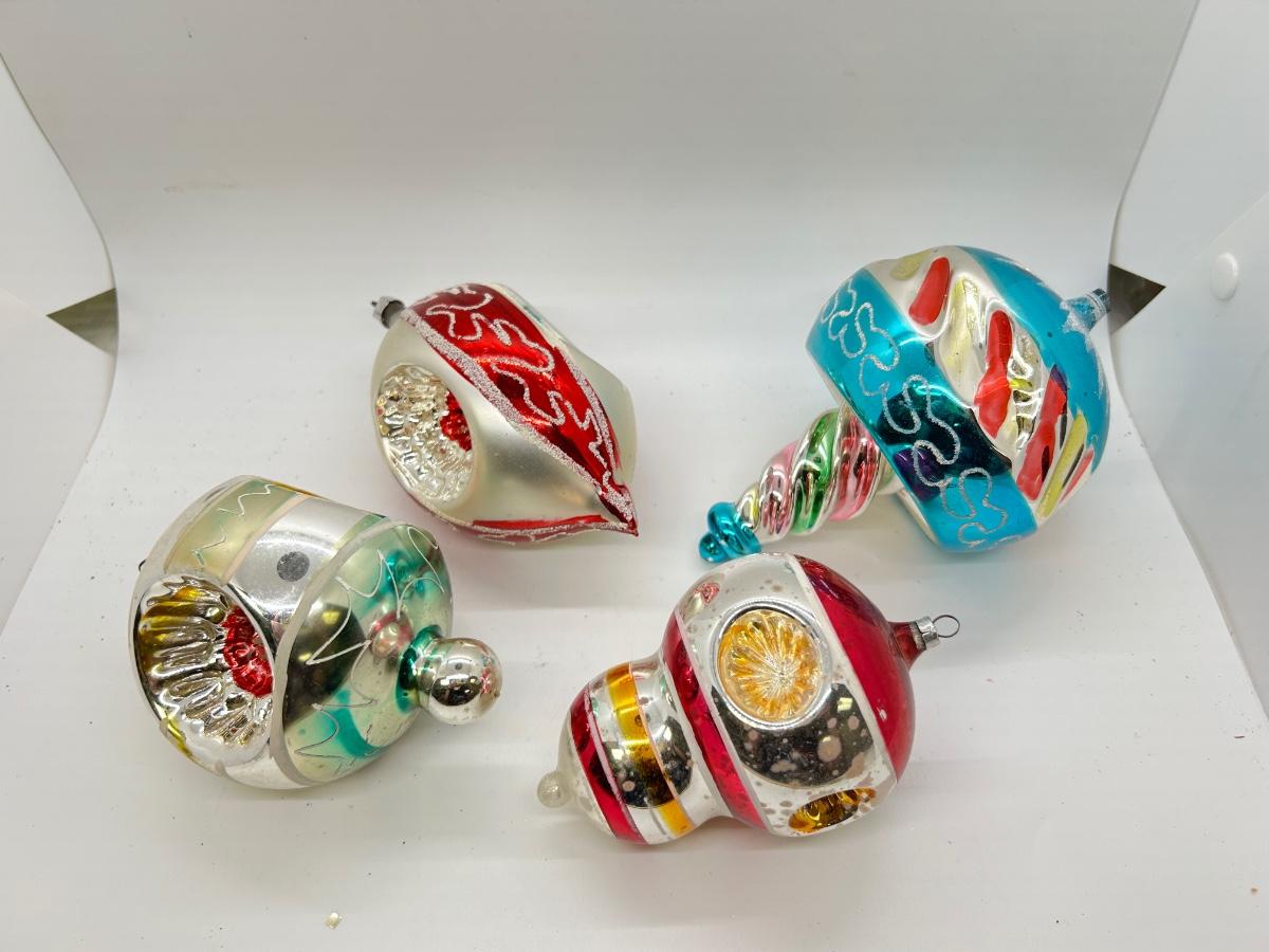 Lot of Four Large Odd Shaped Colorful Blown Glass Christmas Holiday Tree Ornaments. In good vintage condition. Colors are still pretty vibrant. The umbrella like ornament is missing the metal top piece. Indented and funky shapes, great for display. Around 5" size, maybe a little bigger.