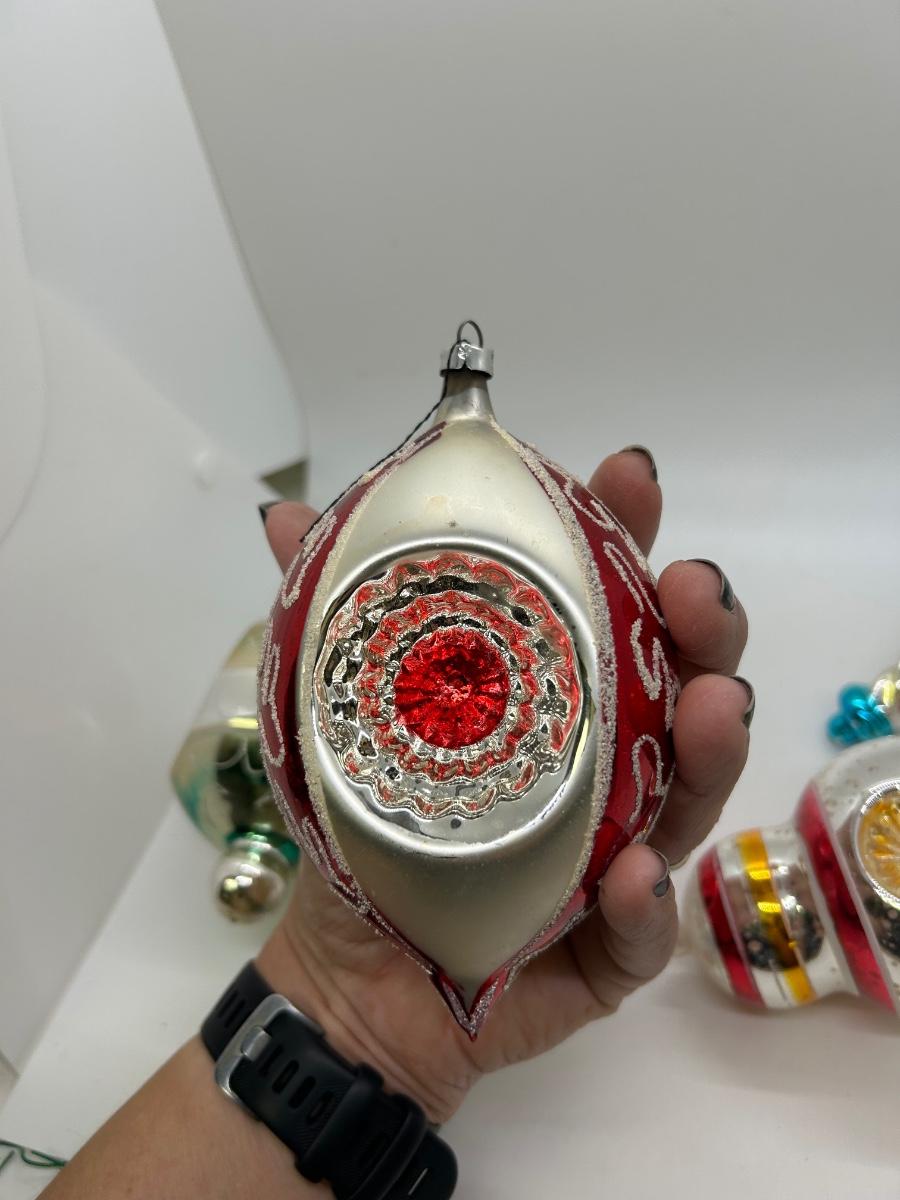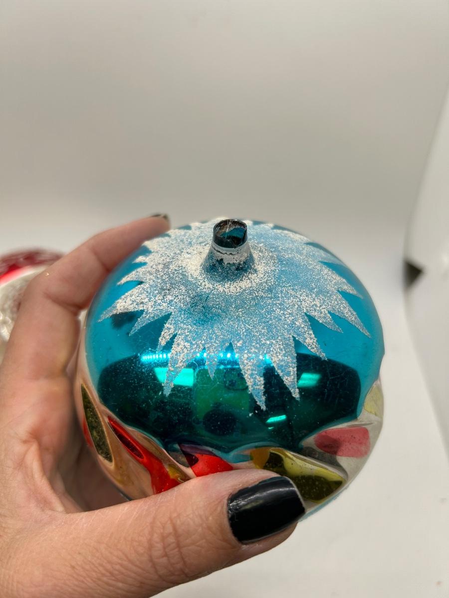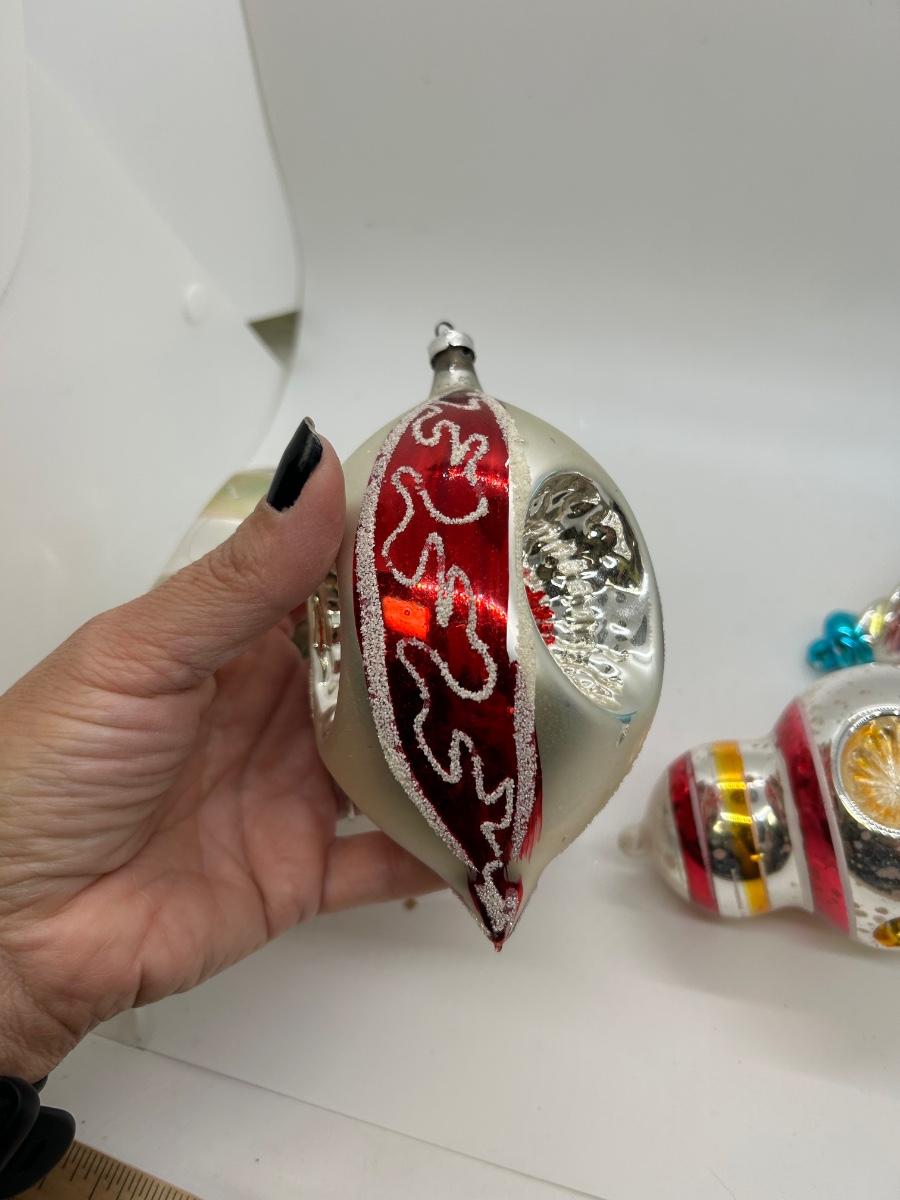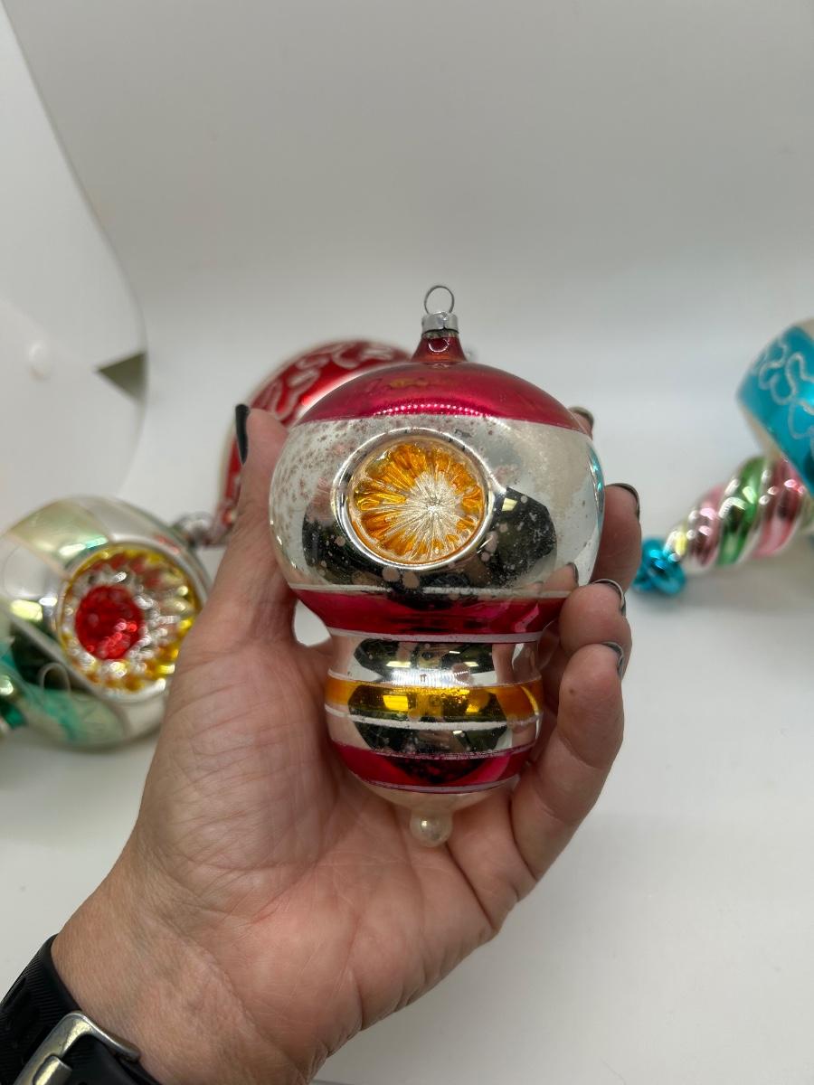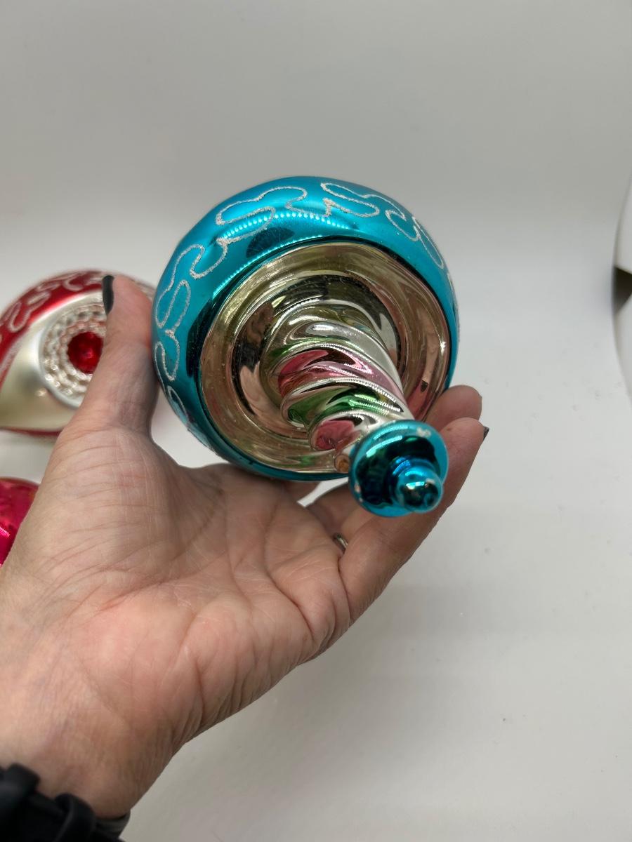 Lot of Four Large Odd Shaped Colorful Blown Glass Christmas Holiday Tree Ornaments. In good vintage condition. Colors are still pretty vibrant. The umbrella like ornament is missing the metal top piece. Indented and funky shapes, great for display. Around 5" size, maybe a little bigger.