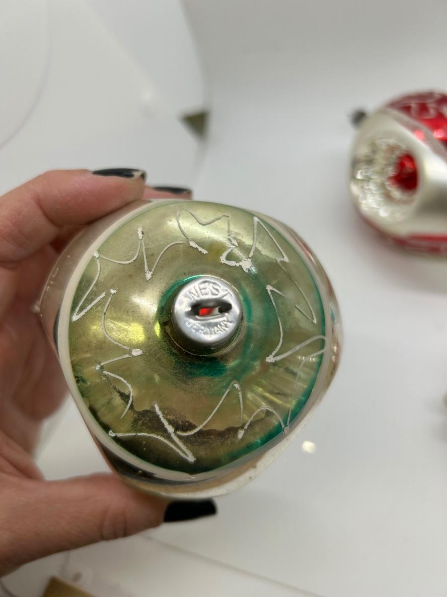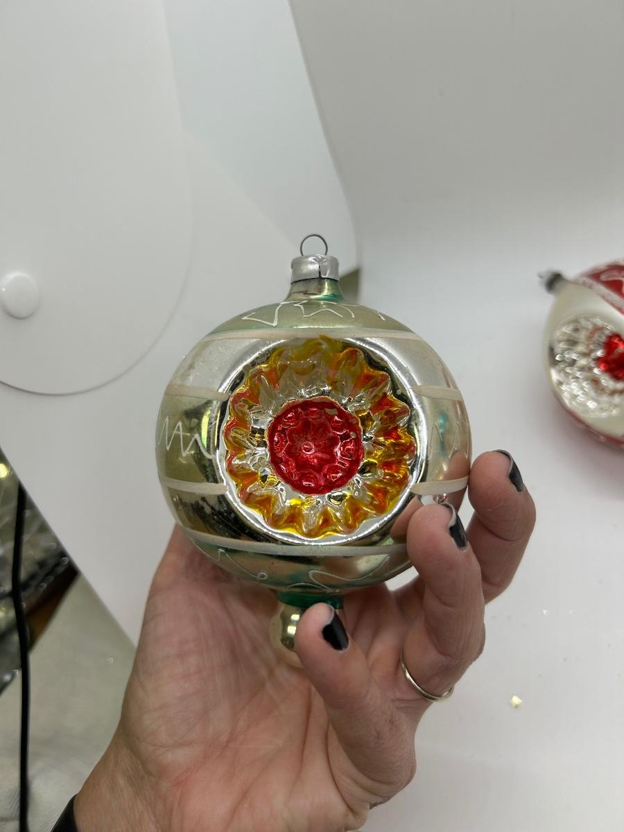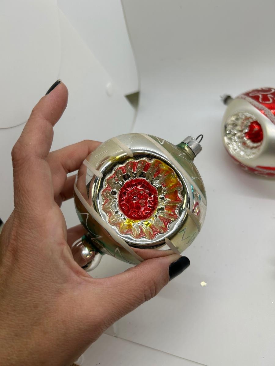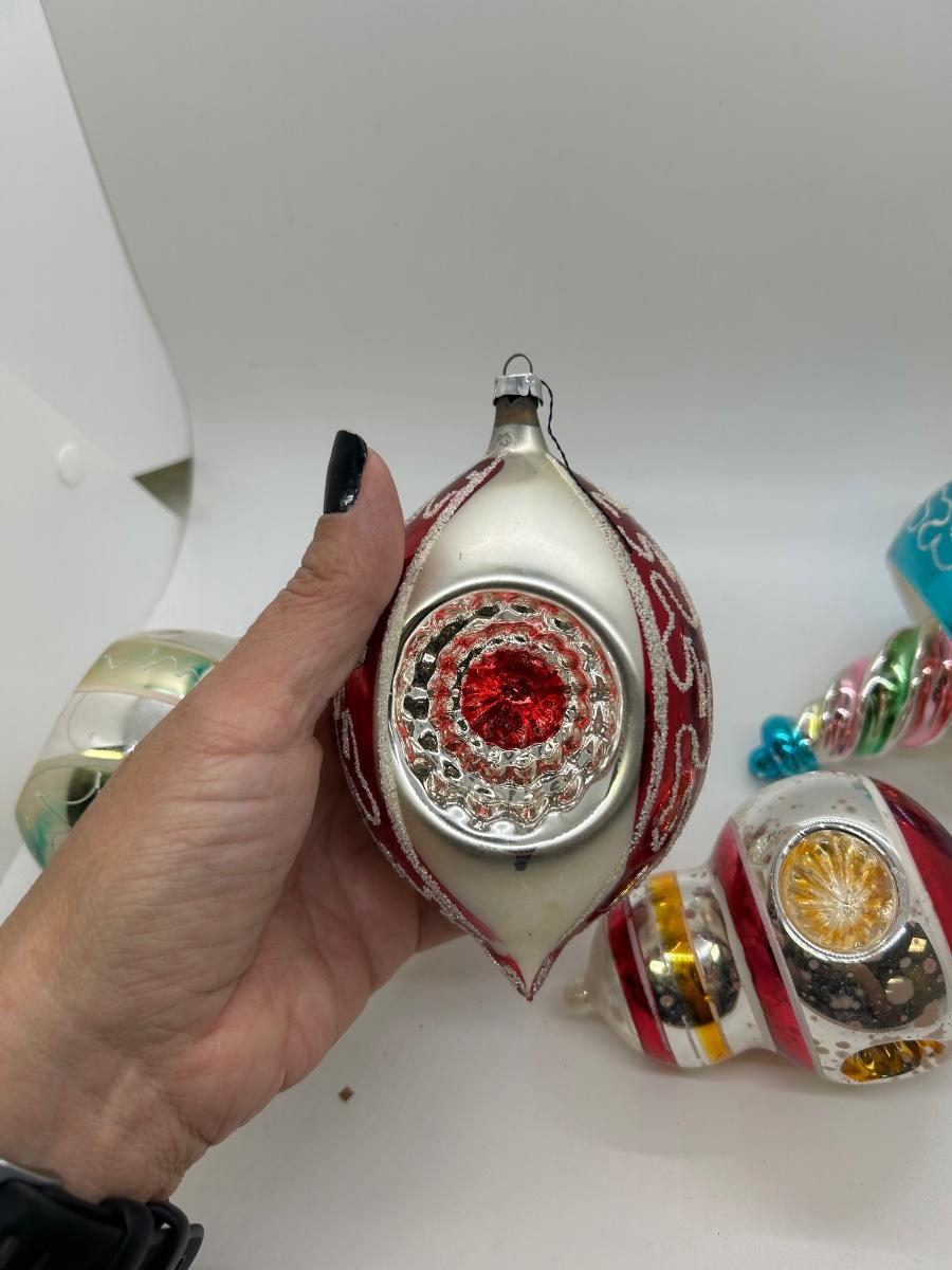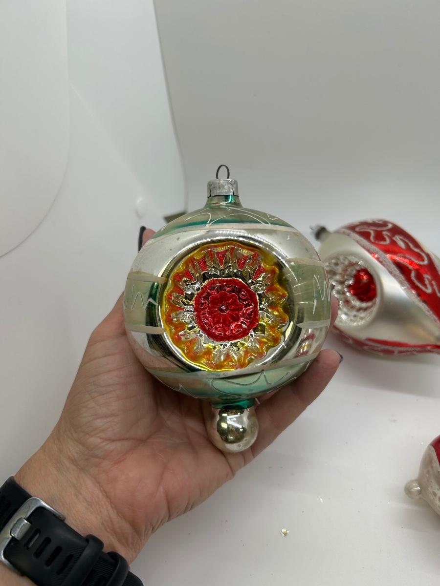 Lot of Four Large Odd Shaped Colorful Blown Glass Christmas Holiday Tree Ornaments. In good vintage condition. Colors are still pretty vibrant. The umbrella like ornament is missing the metal top piece. Indented and funky shapes, great for display. Around 5" size, maybe a little bigger.