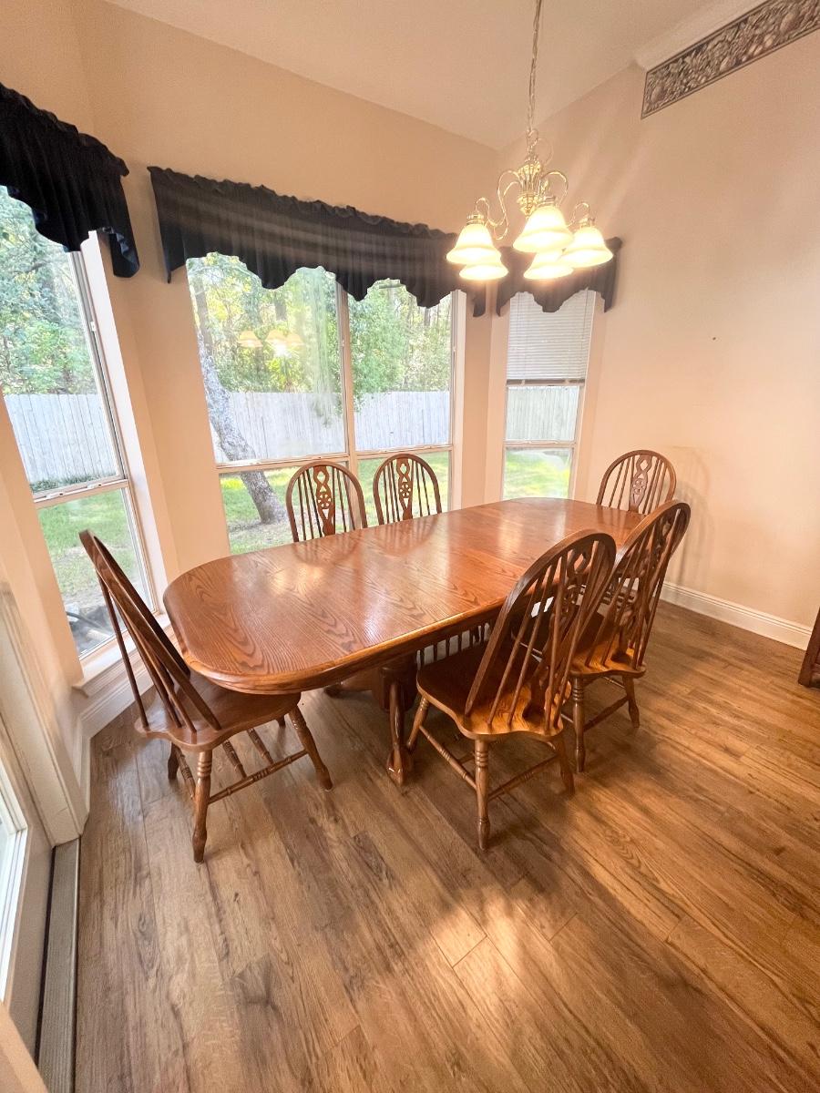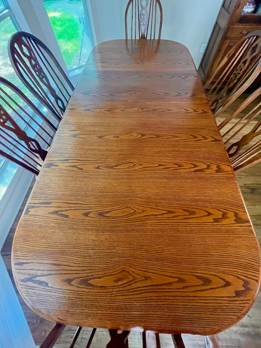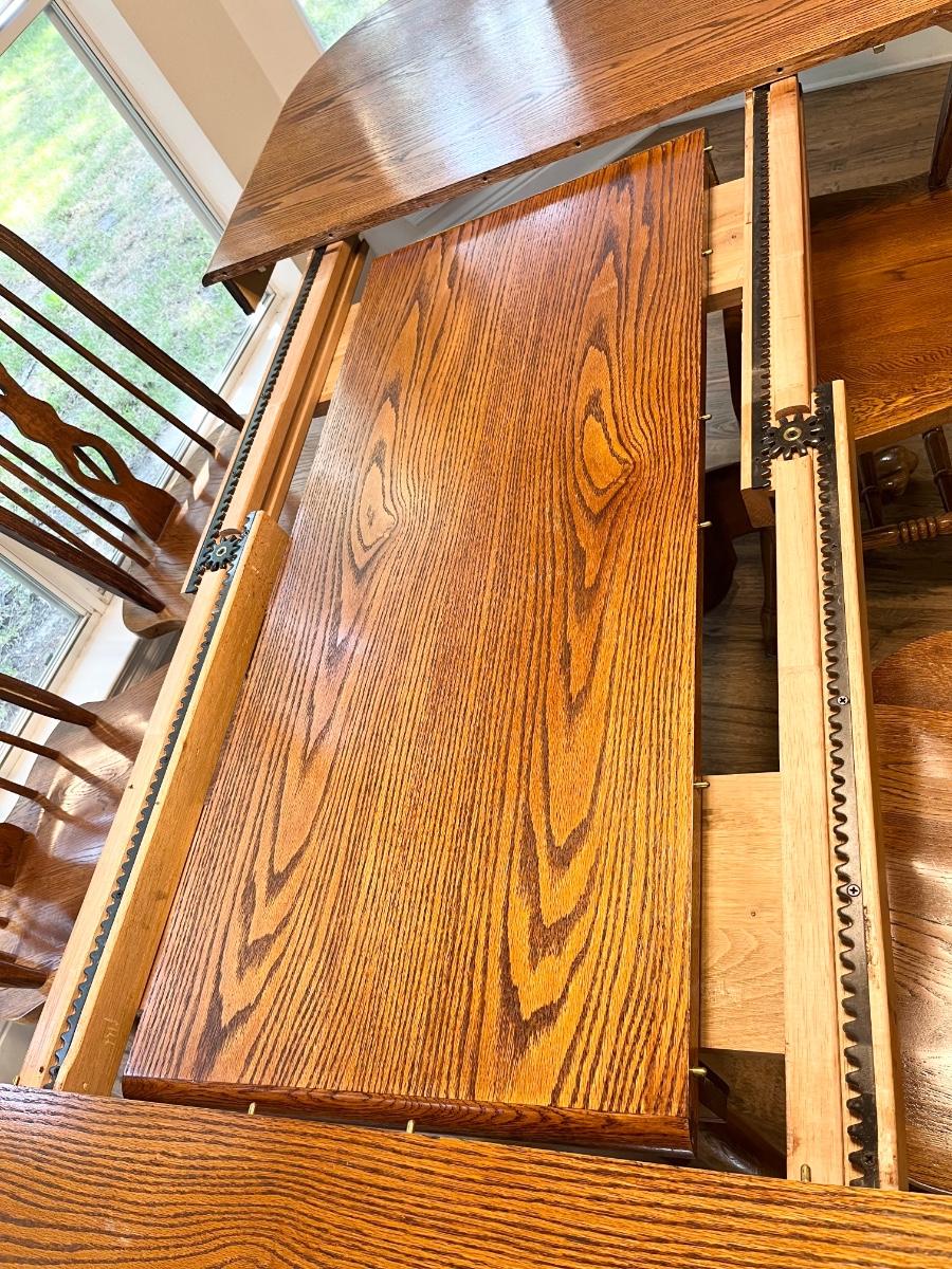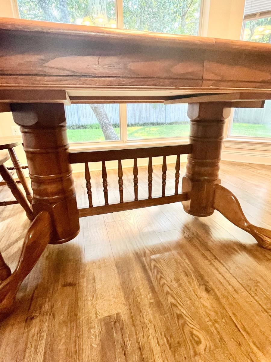 Has two leaves ~ Table = with leaves 30” H x 96” W x 41.5” D ~ no brand name found ~ normal wear & tear