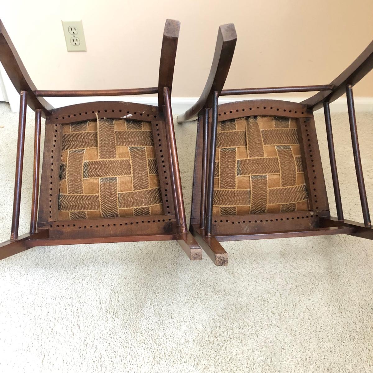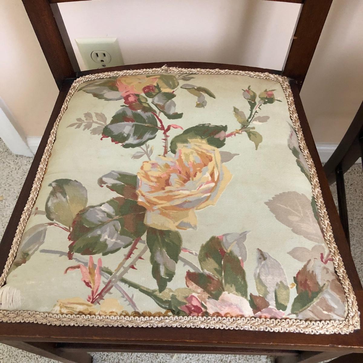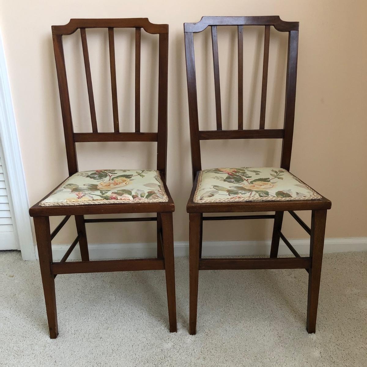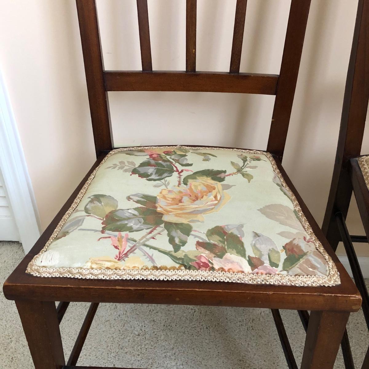 These two lightweight solid wood chairs have green seats with a floral pattern of yellow and pink roses. The chairs appear to be antique. Each chair measures 15” x 16” x 36”. The seats of the chair have very little cushioning and the bases show some wear in the support fabric of the upholstery. Local pickup only.