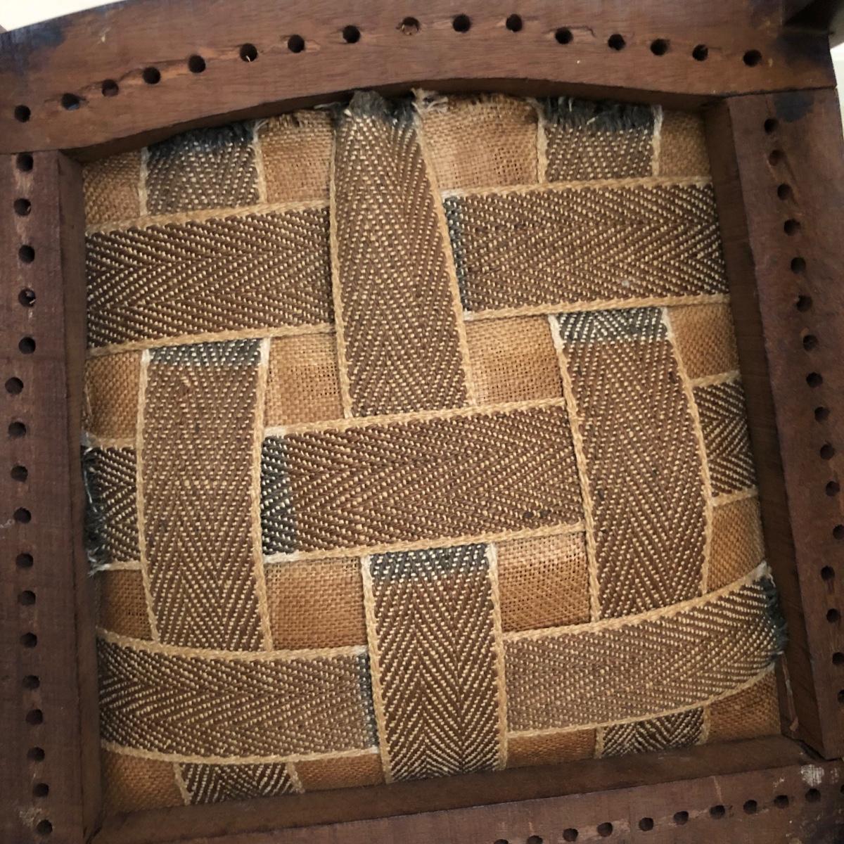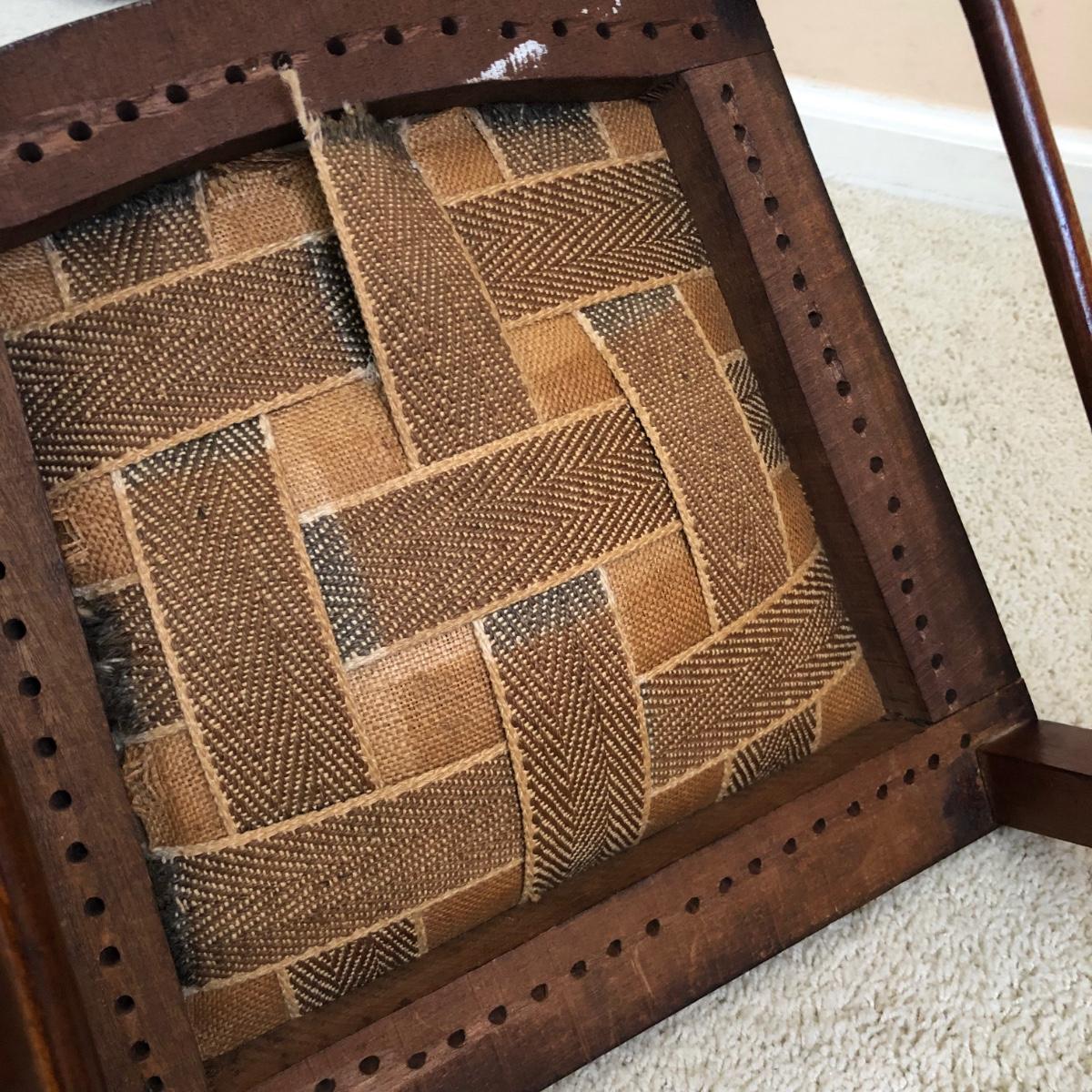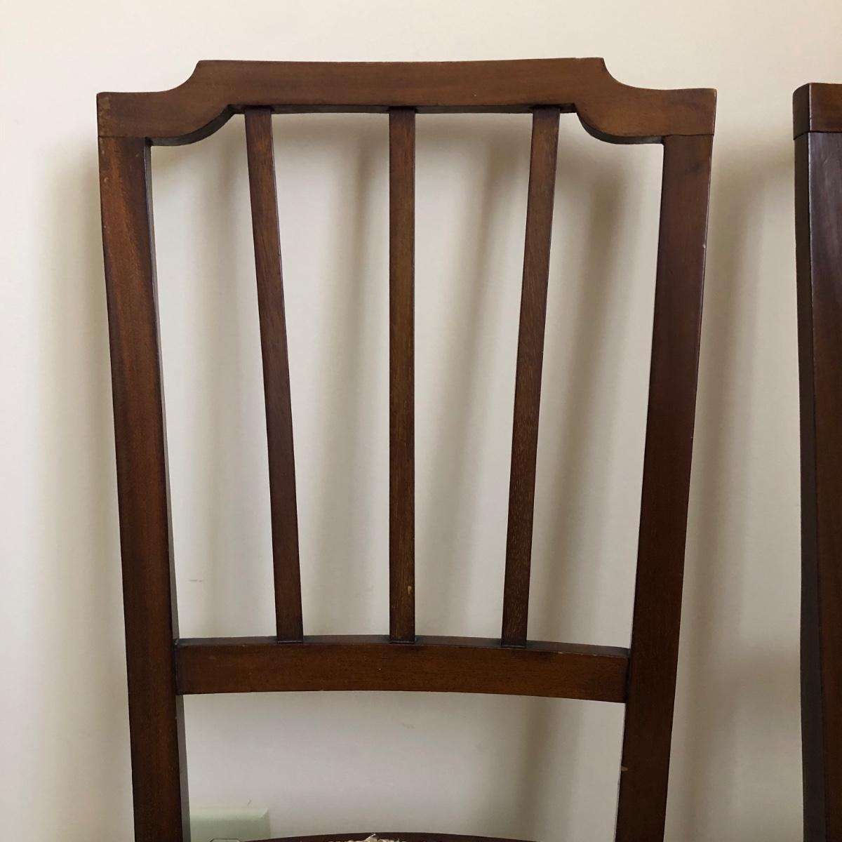 These two lightweight solid wood chairs have green seats with a floral pattern of yellow and pink roses. The chairs appear to be antique. Each chair measures 15” x 16” x 36”. The seats of the chair have very little cushioning and the bases show some wear in the support fabric of the upholstery. Local pickup only.