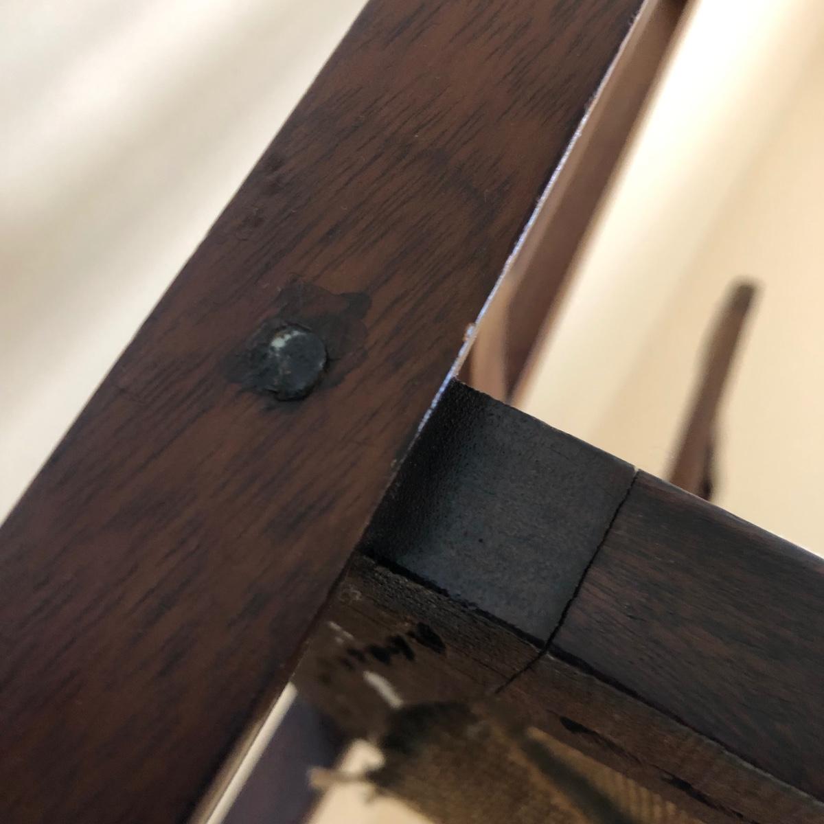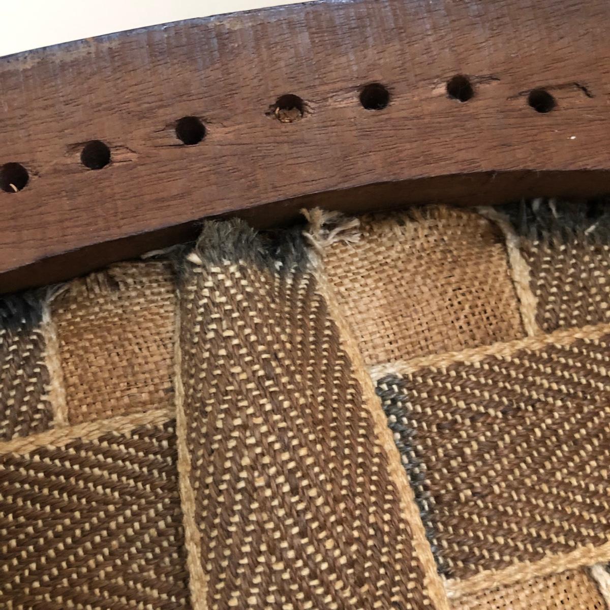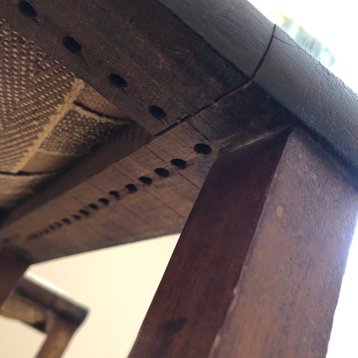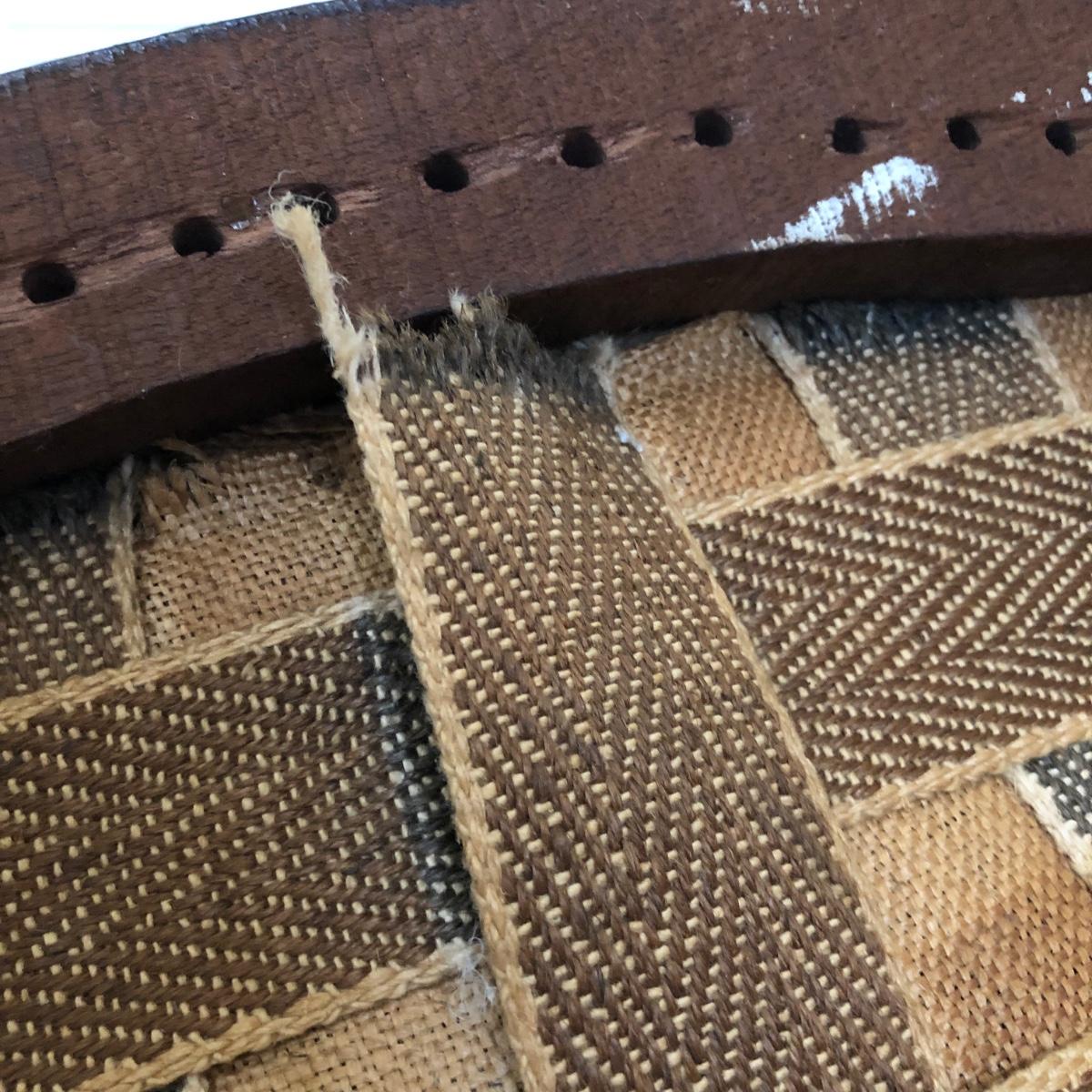 These two lightweight solid wood chairs have green seats with a floral pattern of yellow and pink roses. The chairs appear to be antique. Each chair measures 15” x 16” x 36”. The seats of the chair have very little cushioning and the bases show some wear in the support fabric of the upholstery. Local pickup only.