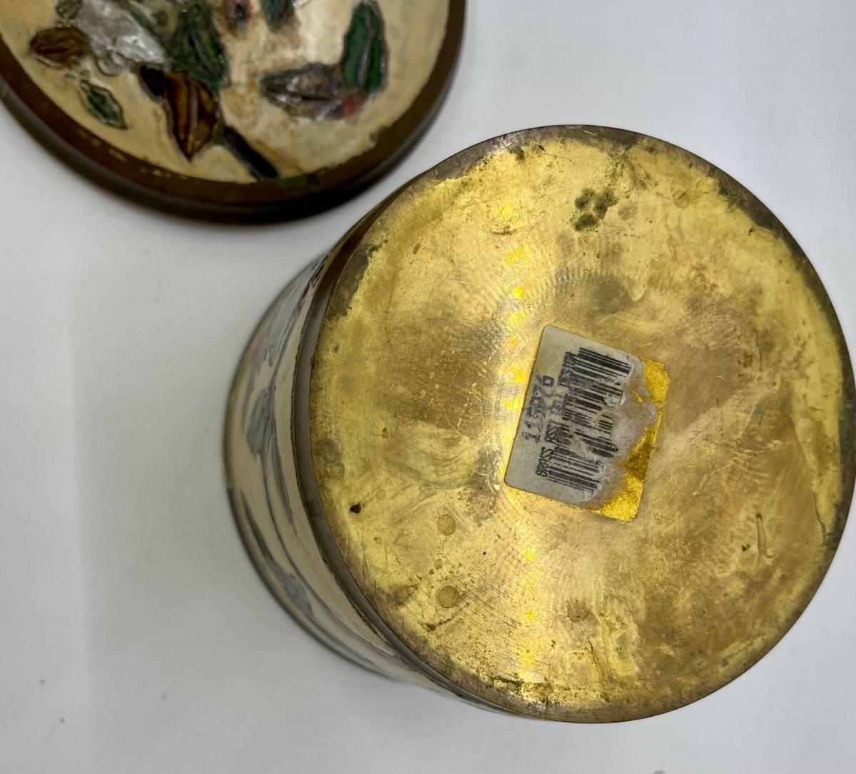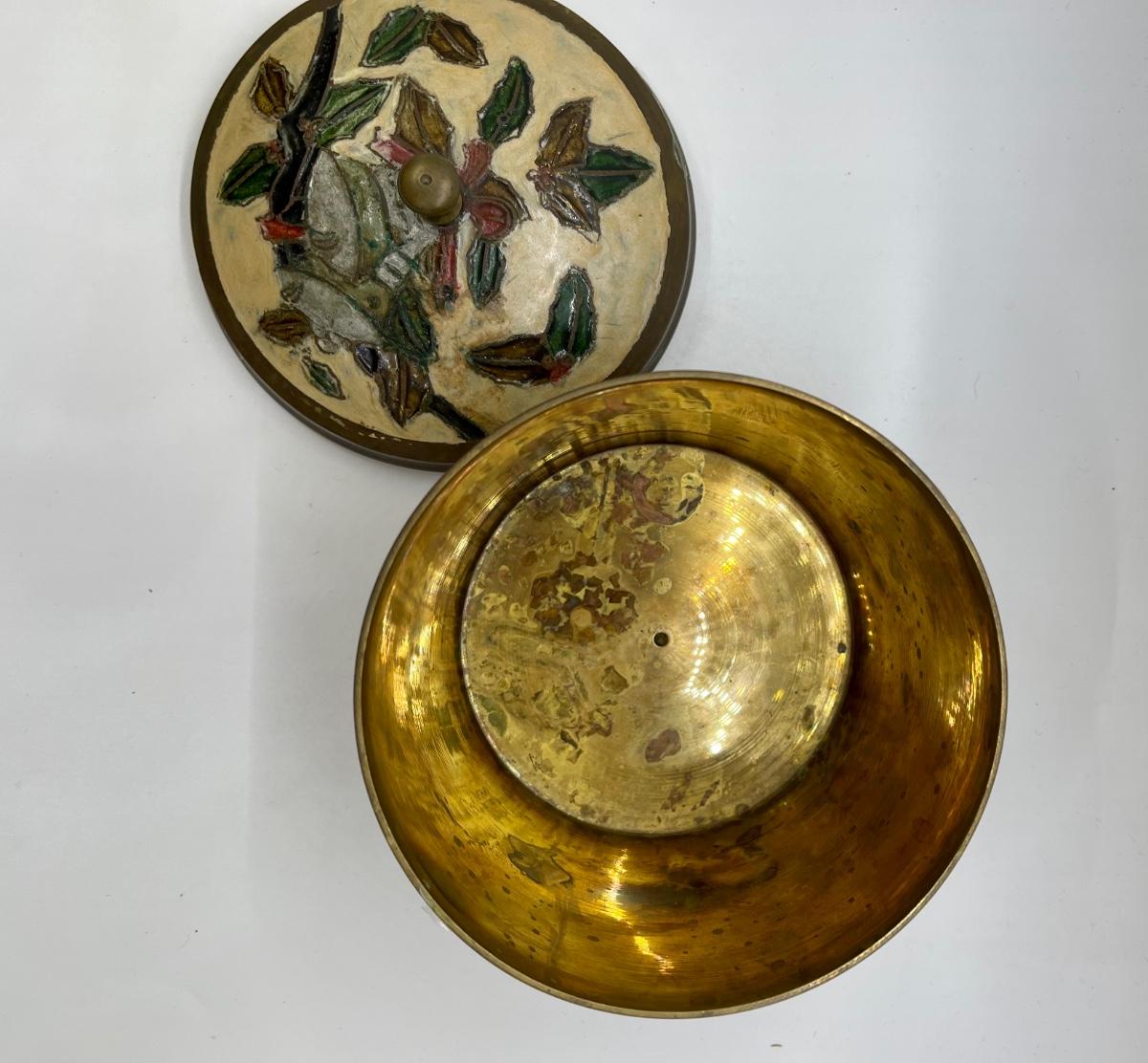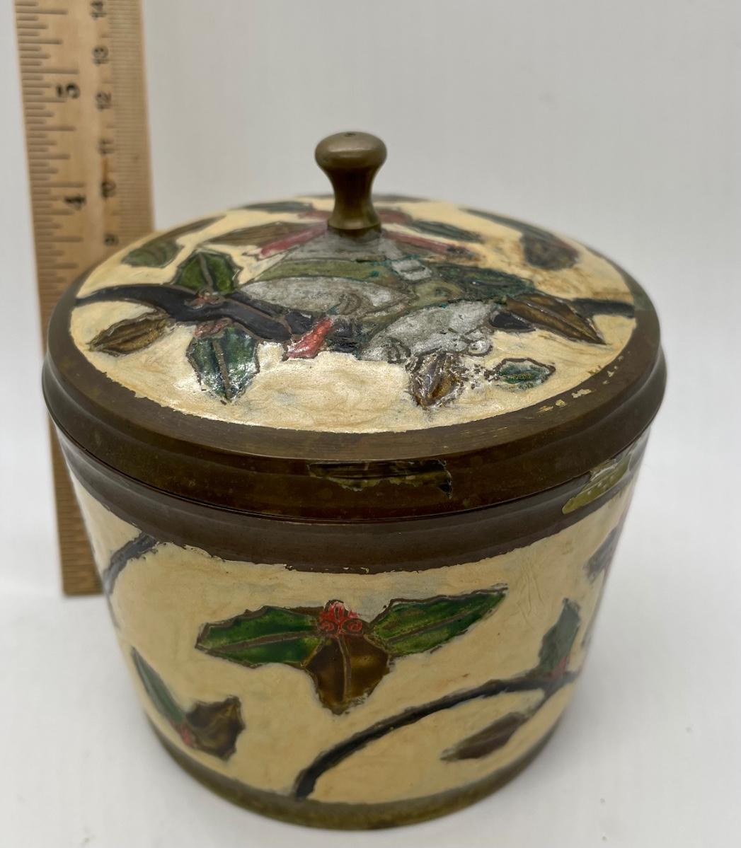 Vintage Enamel Painted Brass Christmas Holly Pattern Canister. In vintage condition. About 5" size.