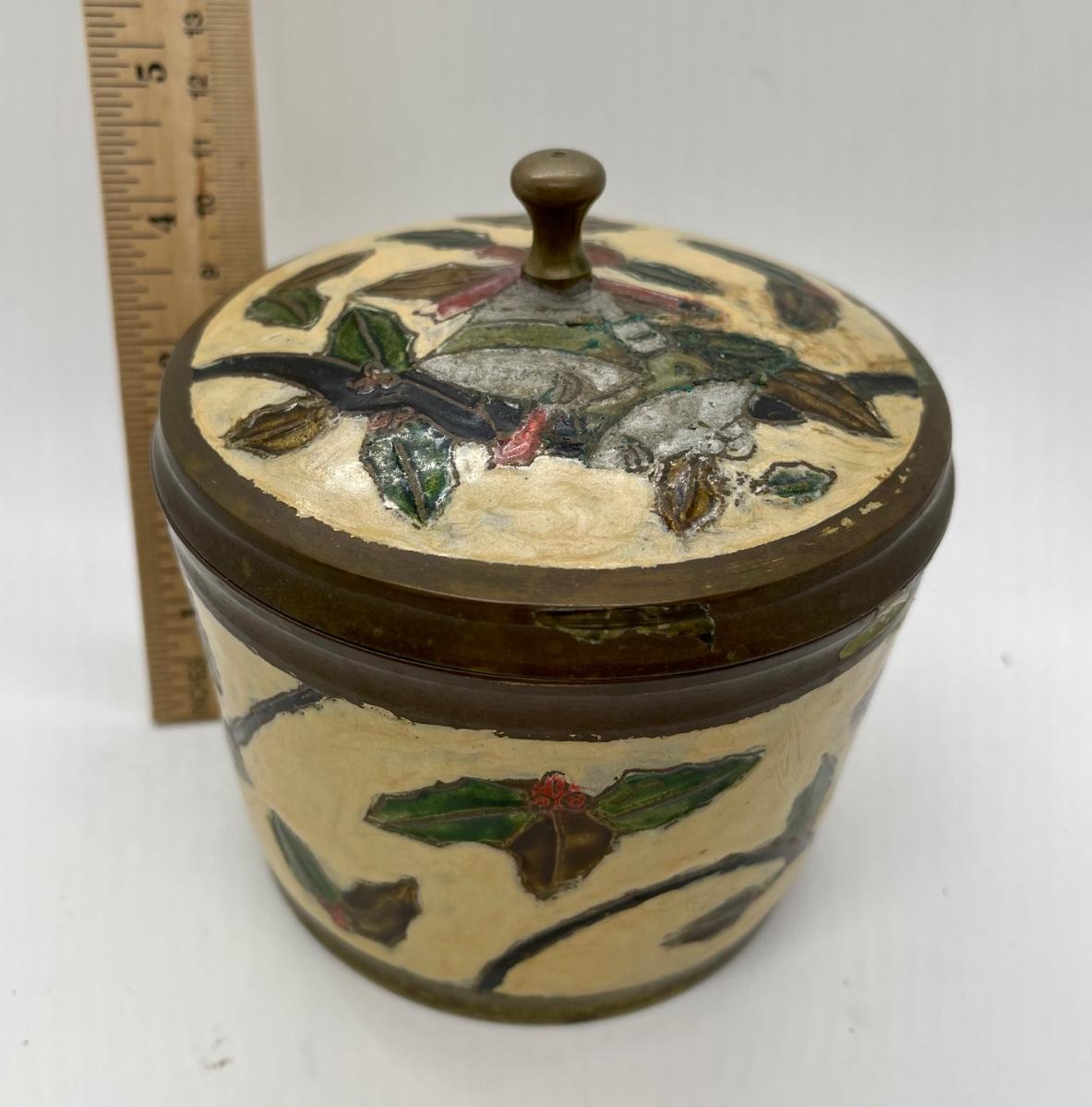 Vintage Enamel Painted Brass Christmas Holly Pattern Canister