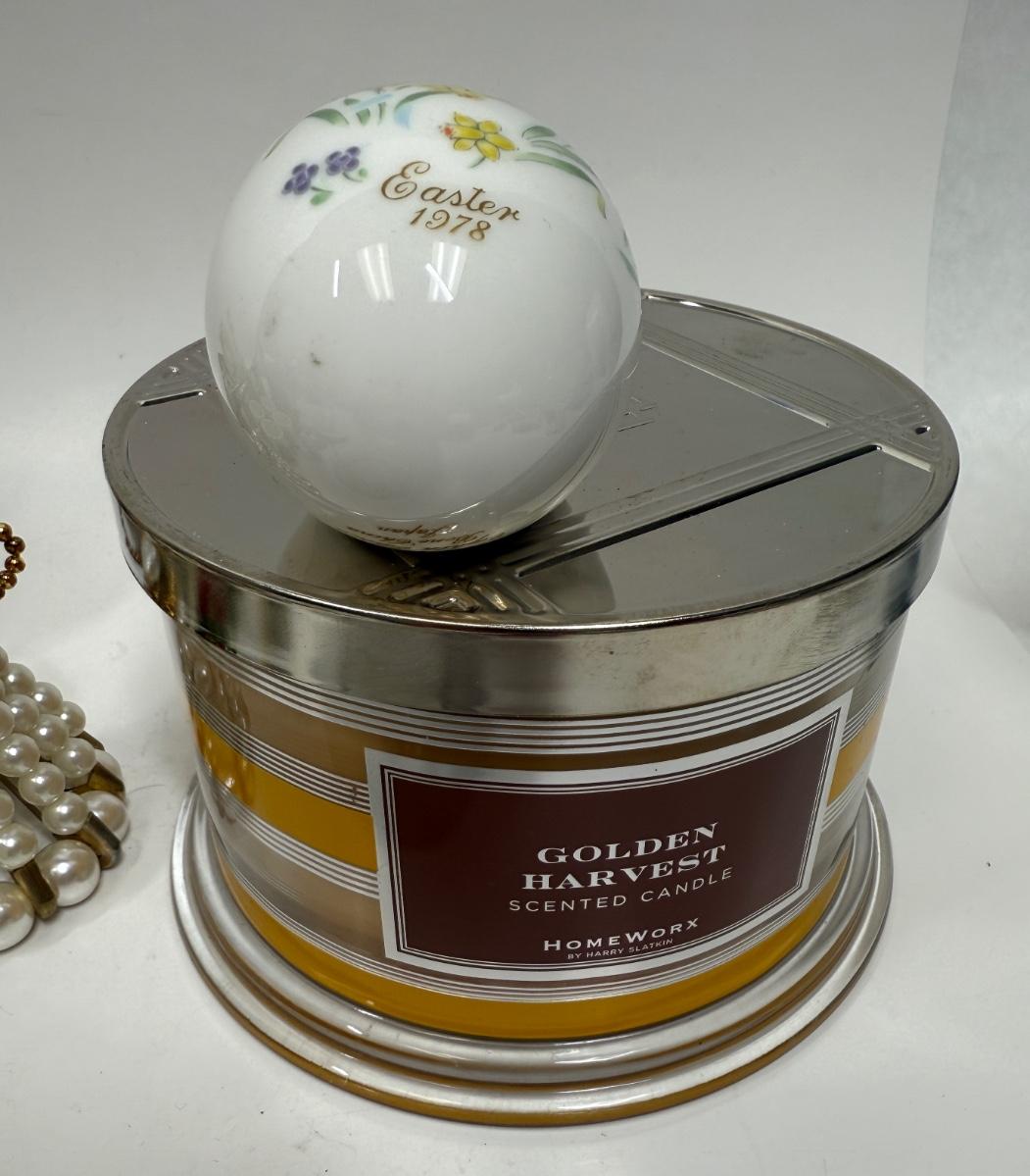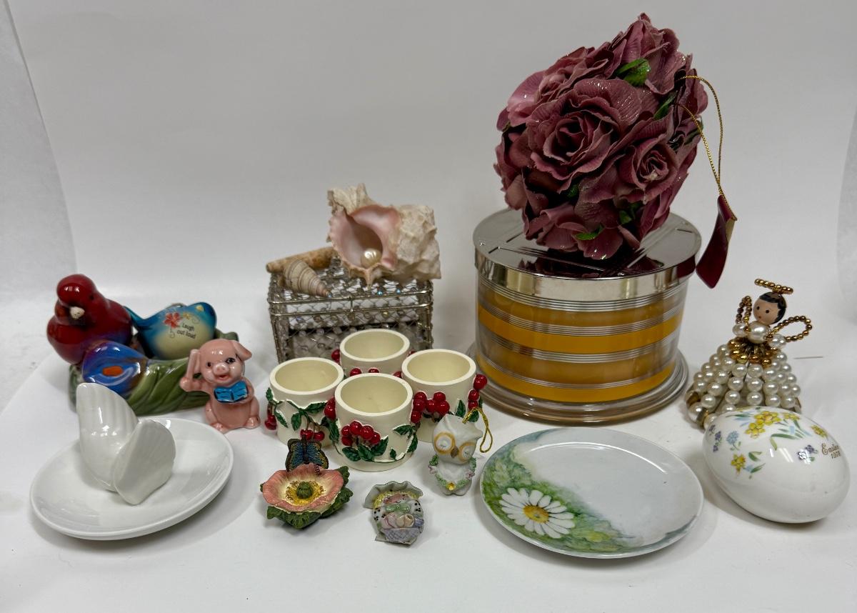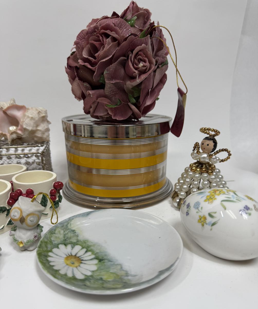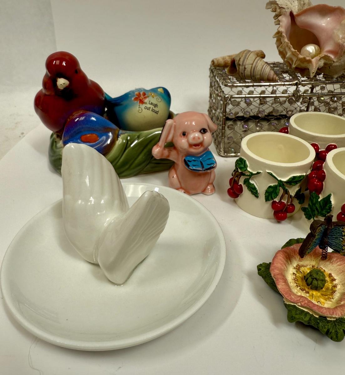 Home Decor Lot: Napkin Rings, Ceramic Figurines, Plates, Candle in Jar, and More
