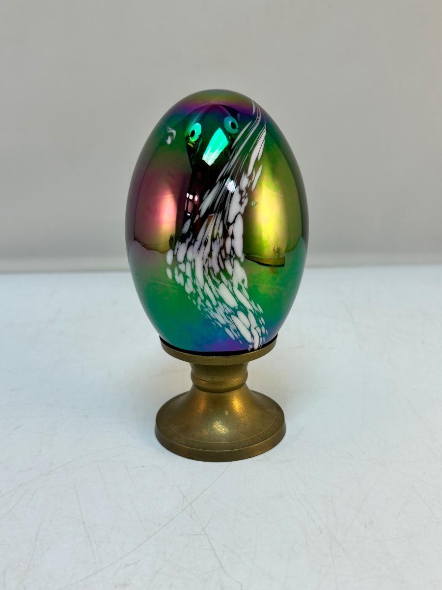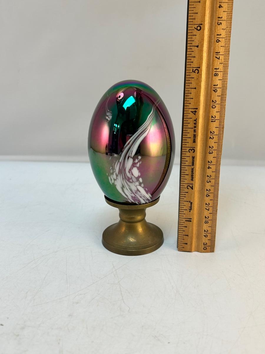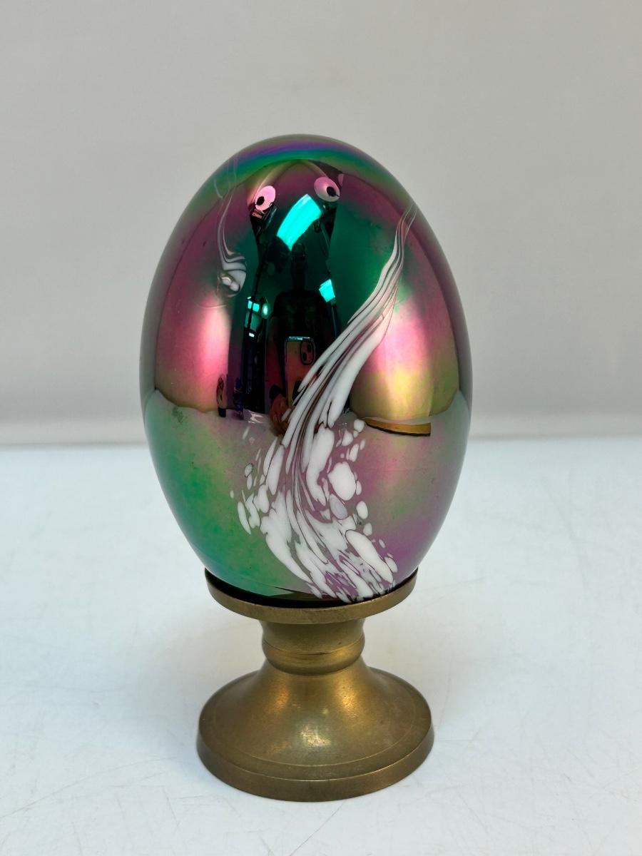 Iridescent Mouthblown Balos Art Glass Egg Paperweight. Comes with tiny stand. In good condition. Has original Balos sticker on the bottom.