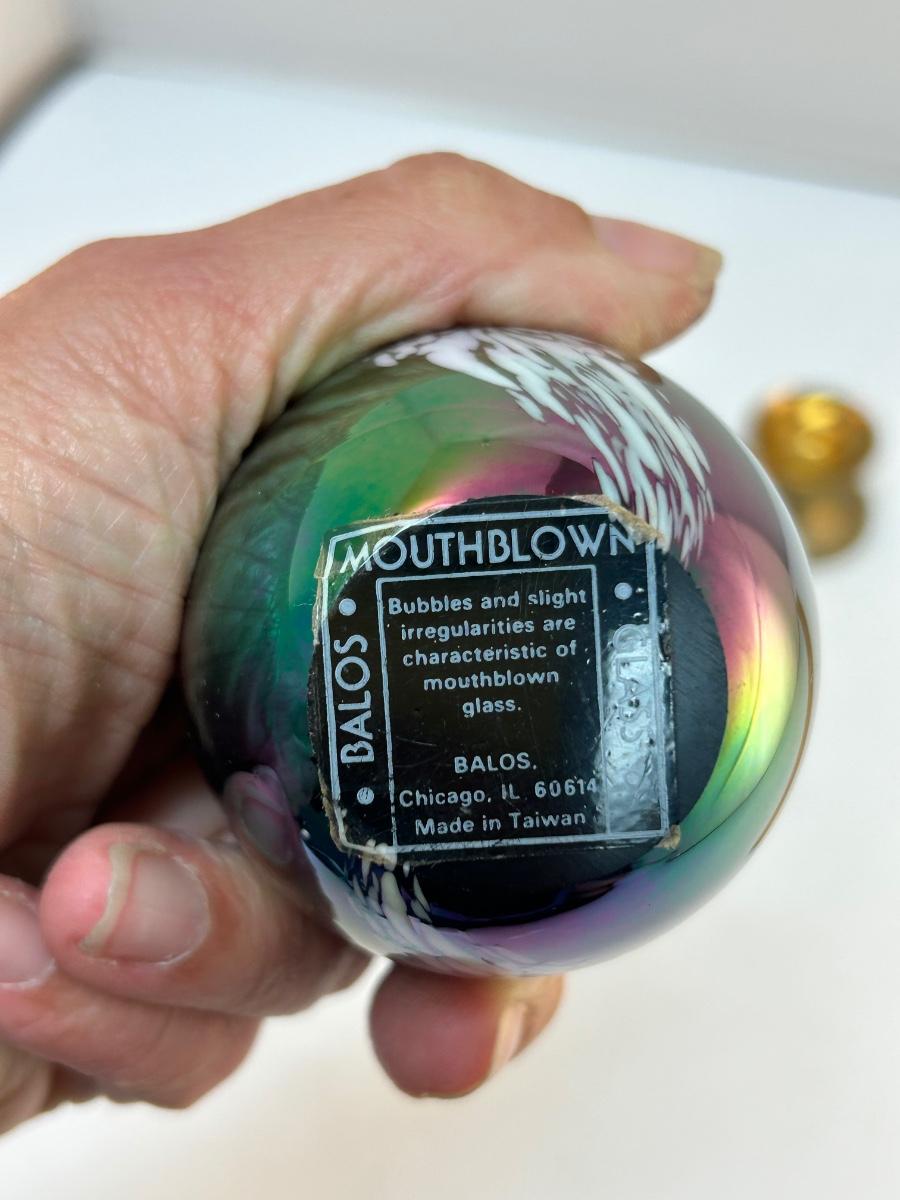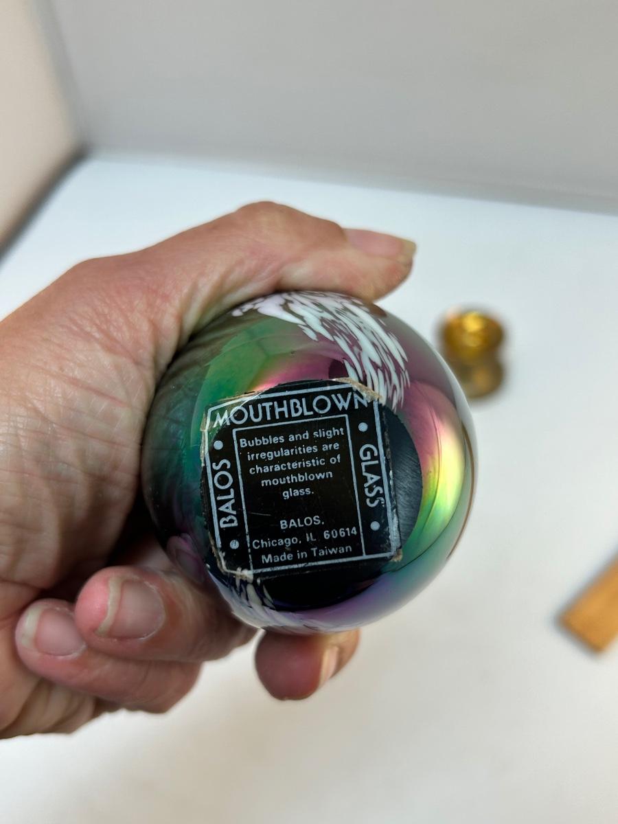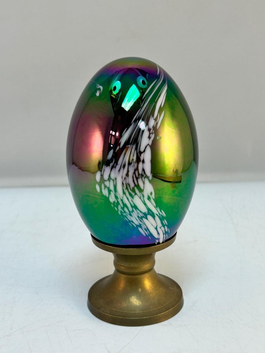 Iridescent Mouthblown Balos Art Glass Egg Paperweight. Comes with tiny stand. In good condition. Has original Balos sticker on the bottom.