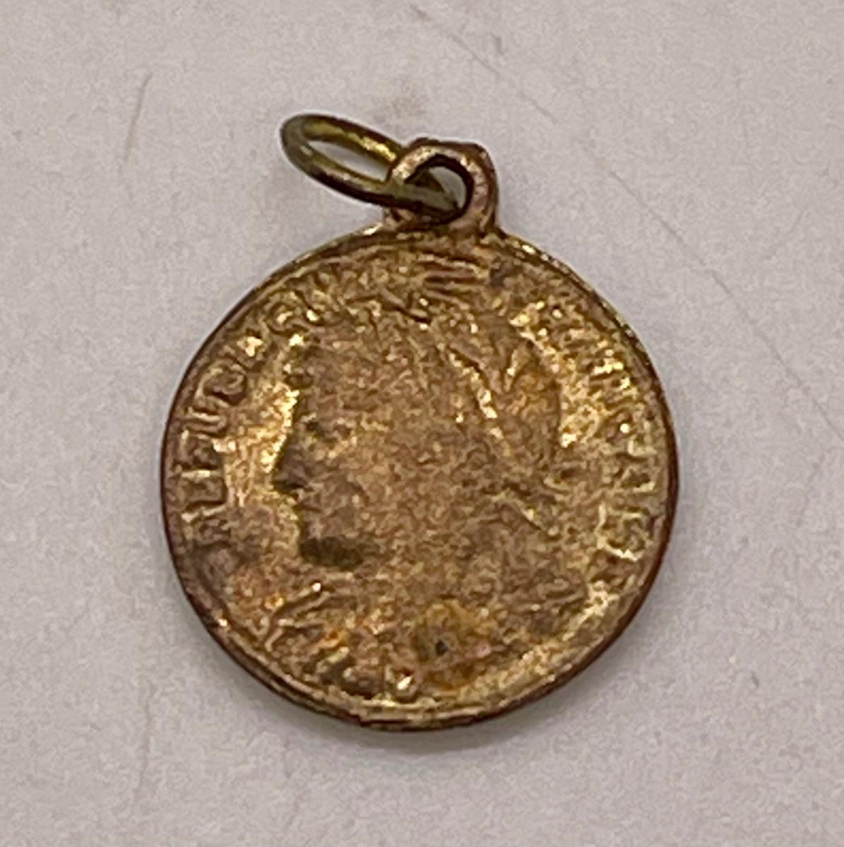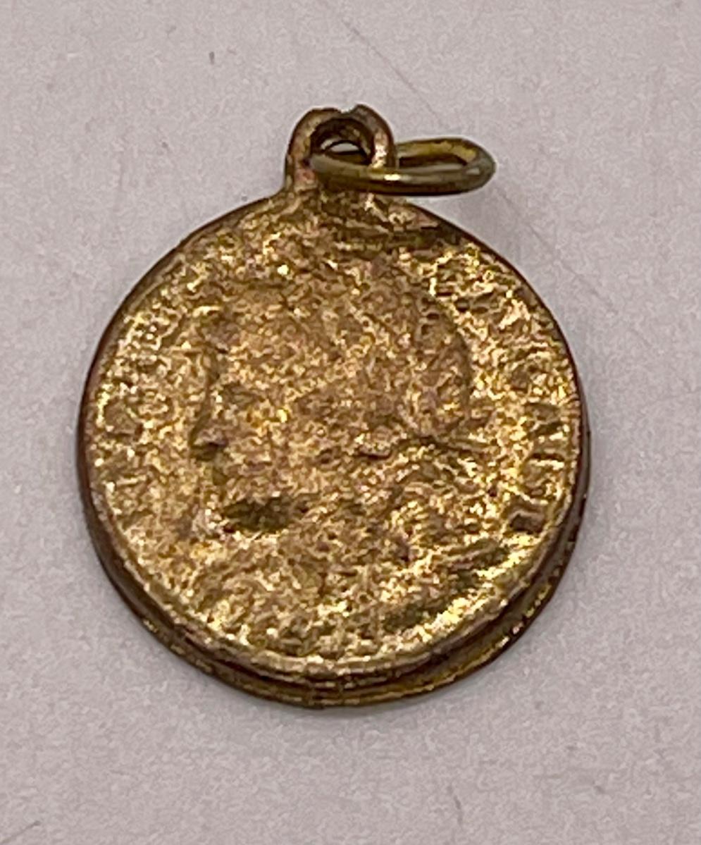 Made originally as a charm or as a pendant, this one appears to be 2 of the same items soldered together so the image is the same on both sides. May have been treated with an etching-type cleaner to remove tarnish, but this has resulted in a more eroded, less distinct image. Age unknown.