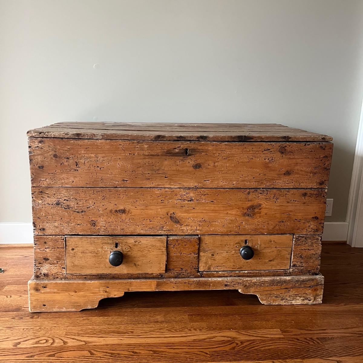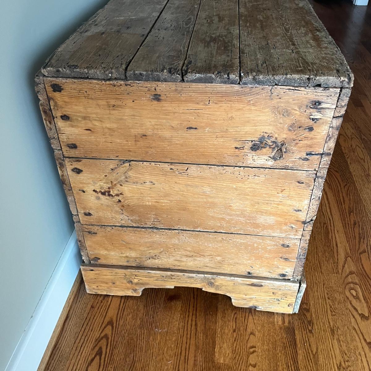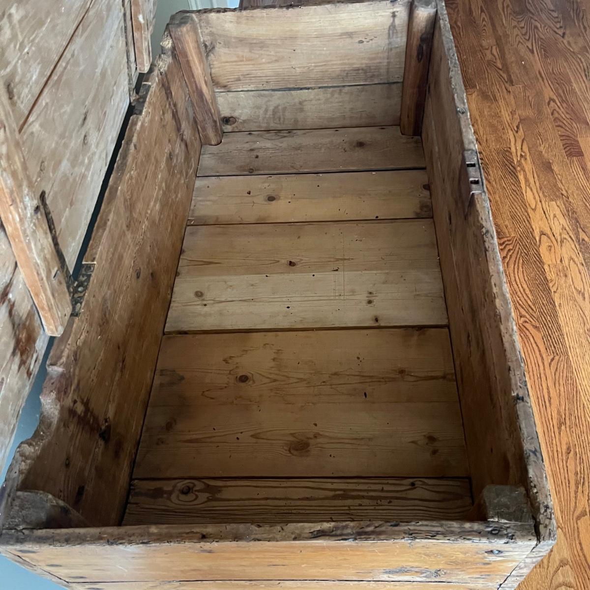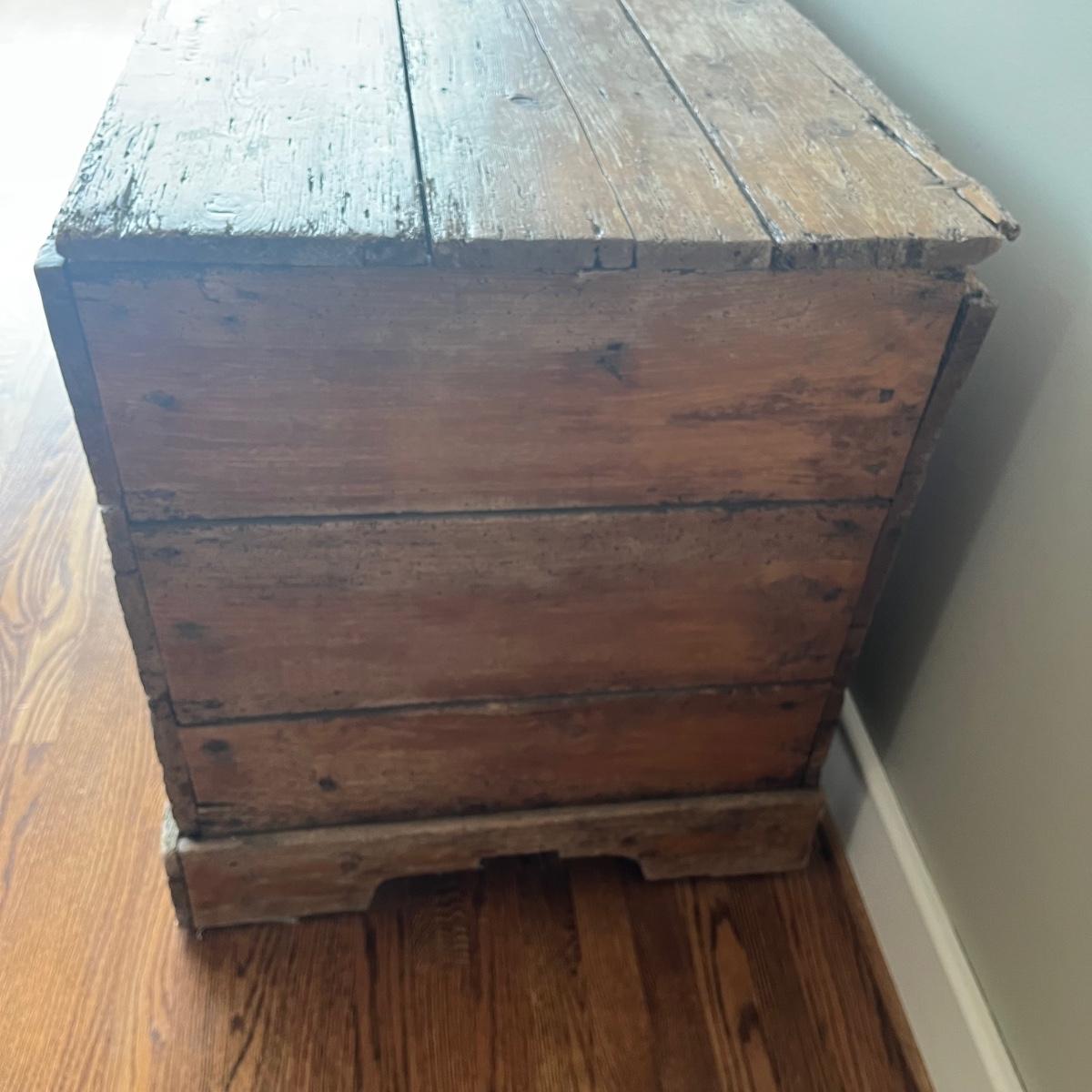 This lovely wooden trunk features a large storage space with two drawers crafted with dovetail joinery. Hardware is a bit rusty, but intact. This piece is a locking mechanism, but no key. This trunk has worn beautifully with time. While it is still strong, there are a couple loose boards on the lid that could easily be reinforced. Overall this piece is solid. Trunk measures 26” x 48” x 29”. The winning bidder will need to bring help to move this item as it is substantial.