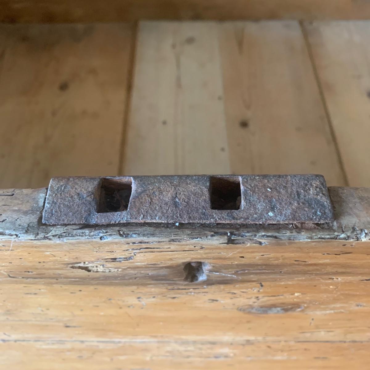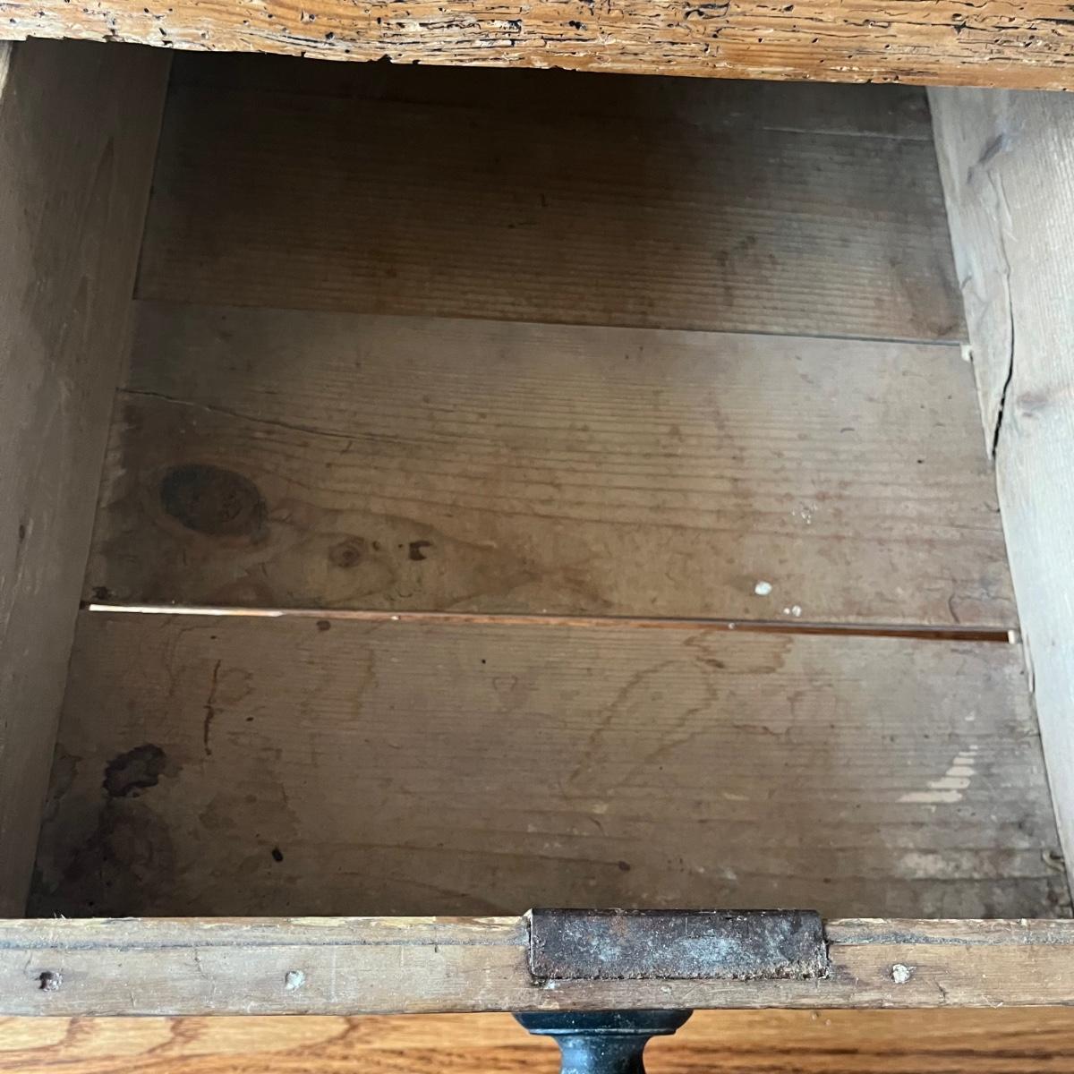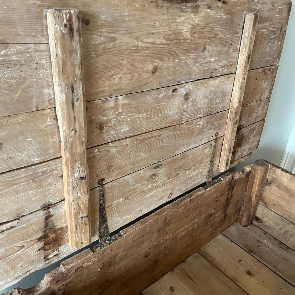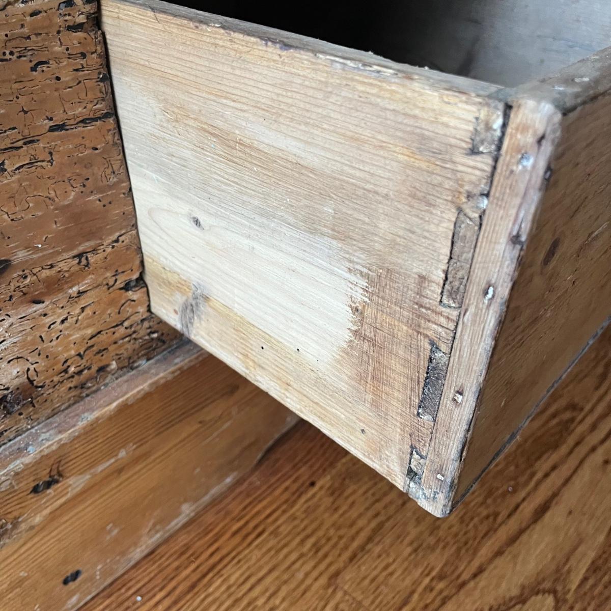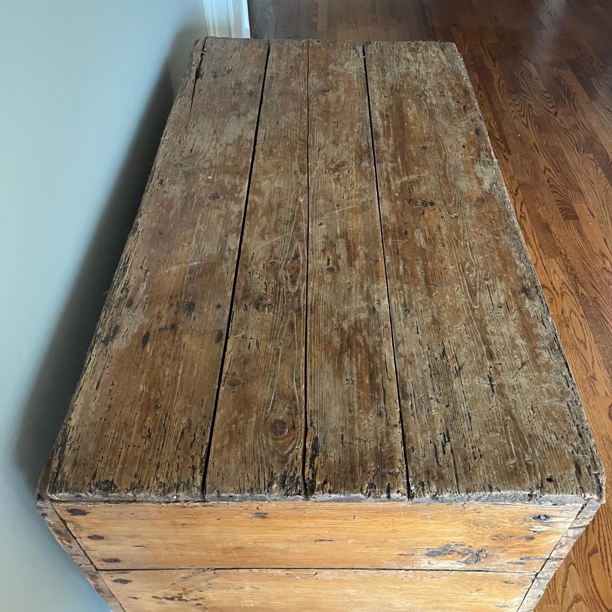 This lovely wooden trunk features a large storage space with two drawers crafted with dovetail joinery. Hardware is a bit rusty, but intact. This piece is a locking mechanism, but no key. This trunk has worn beautifully with time. While it is still strong, there are a couple loose boards on the lid that could easily be reinforced. Overall this piece is solid. Trunk measures 26” x 48” x 29”. The winning bidder will need to bring help to move this item as it is substantial.