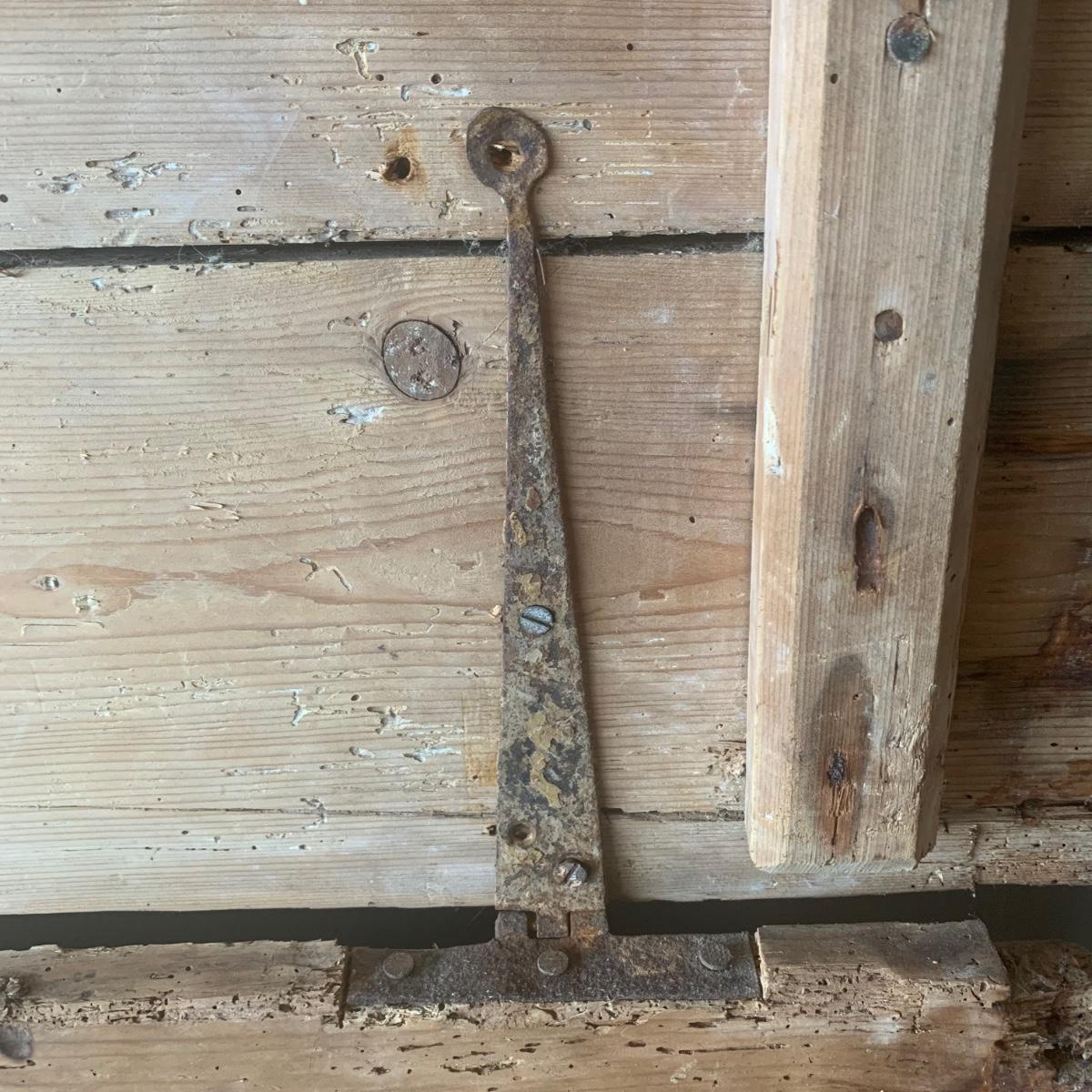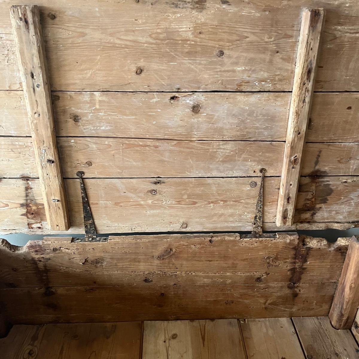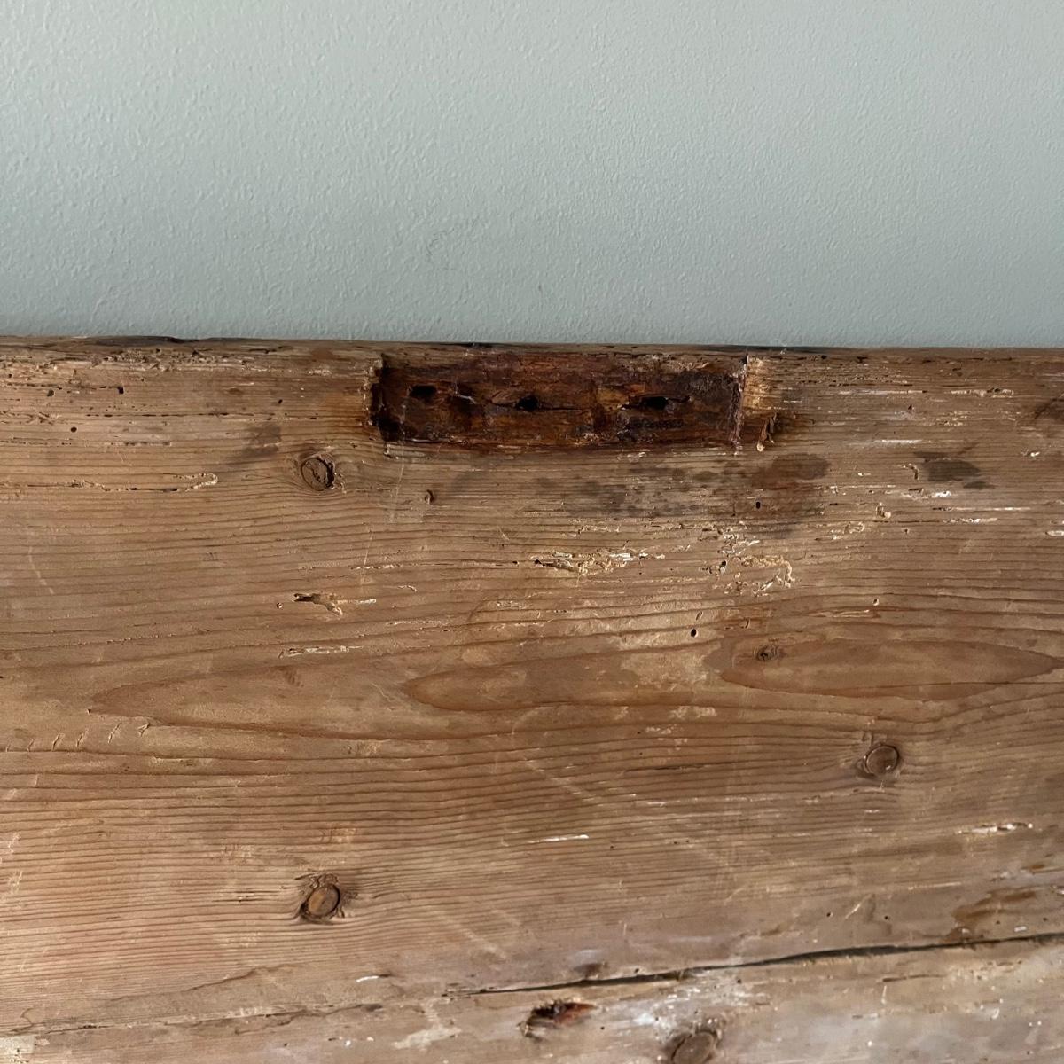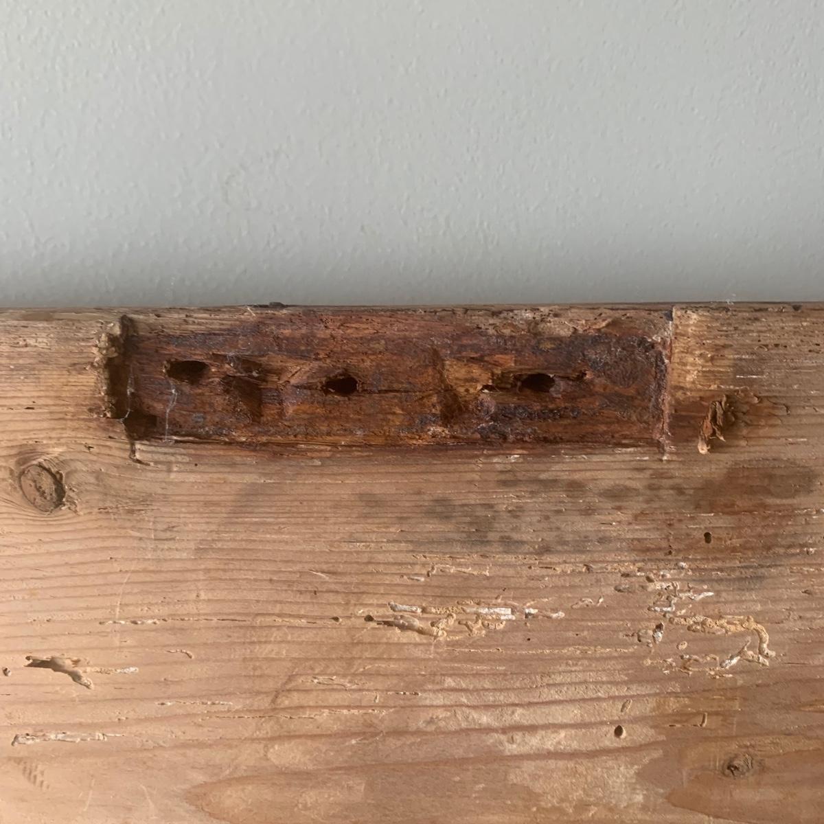 This lovely wooden trunk features a large storage space with two drawers crafted with dovetail joinery. Hardware is a bit rusty, but intact. This piece is a locking mechanism, but no key. This trunk has worn beautifully with time. While it is still strong, there are a couple loose boards on the lid that could easily be reinforced. Overall this piece is solid. Trunk measures 26” x 48” x 29”. The winning bidder will need to bring help to move this item as it is substantial.