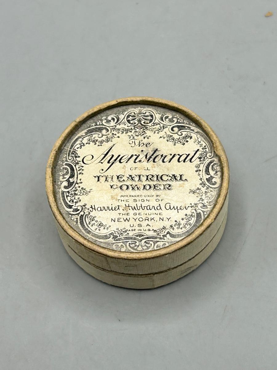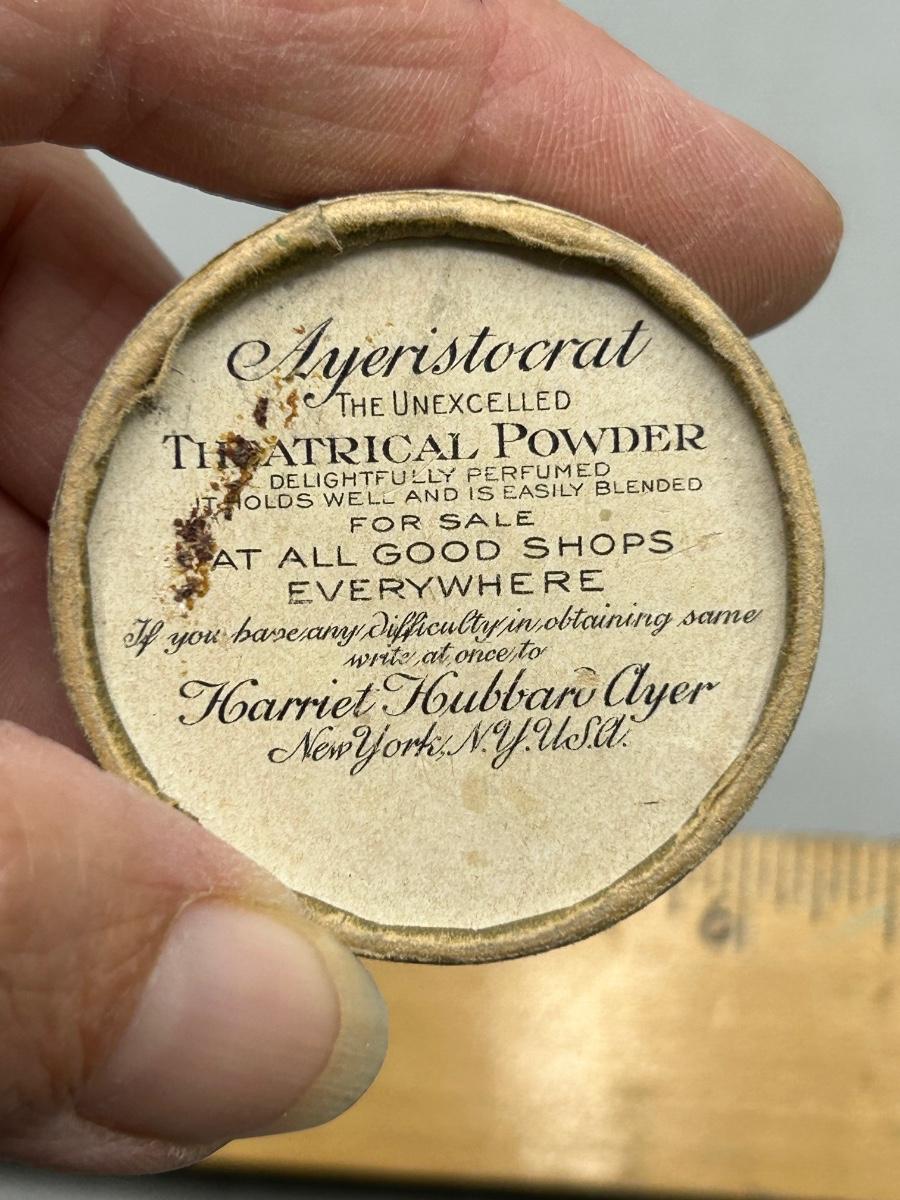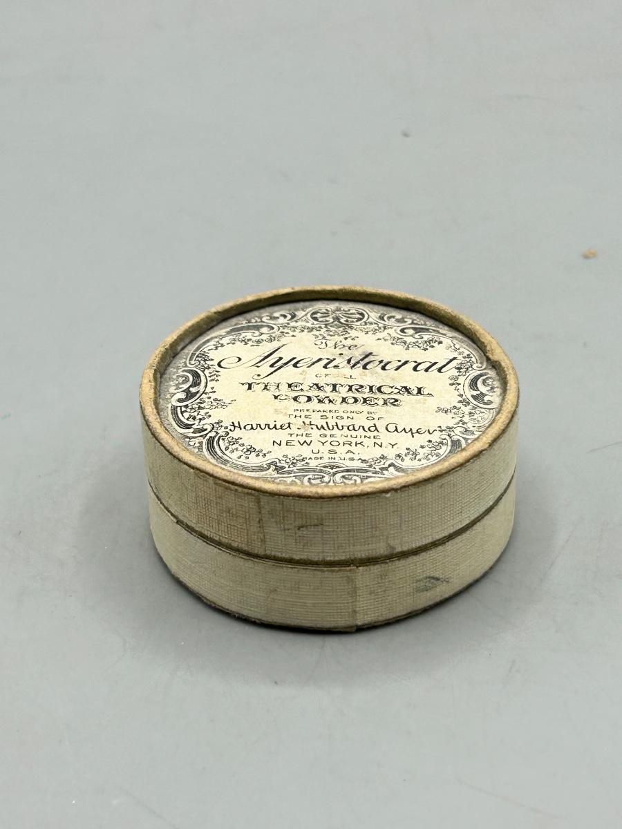 Small Vintage Cardboard Round Compact Ayeristocrat of all Theatrical Powder loose Face Makeup. In good displayable condition, there is even some powder left inside.