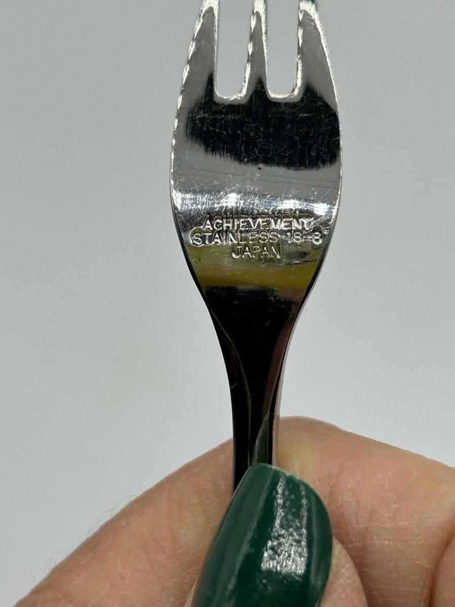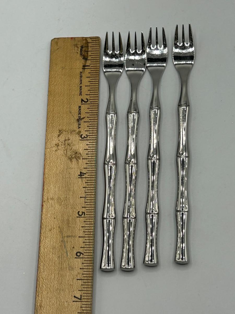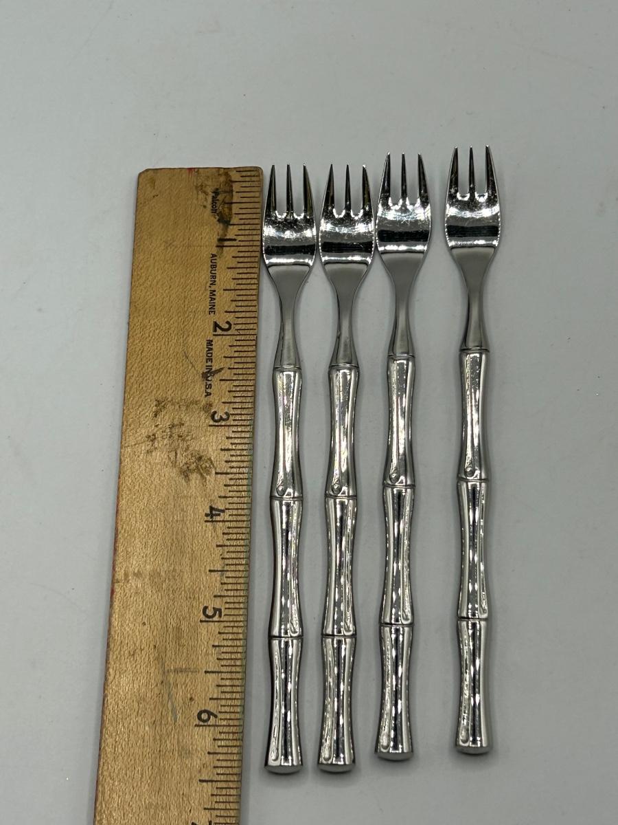 Set of 4 Stainless Steel Bamboo Shaped Handle Cocktail Forks. In good condition. About 6" length.