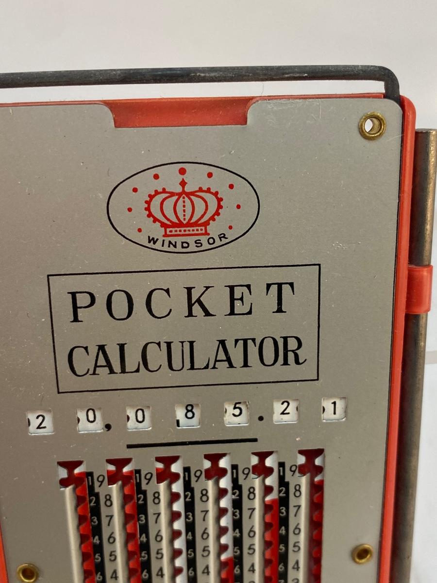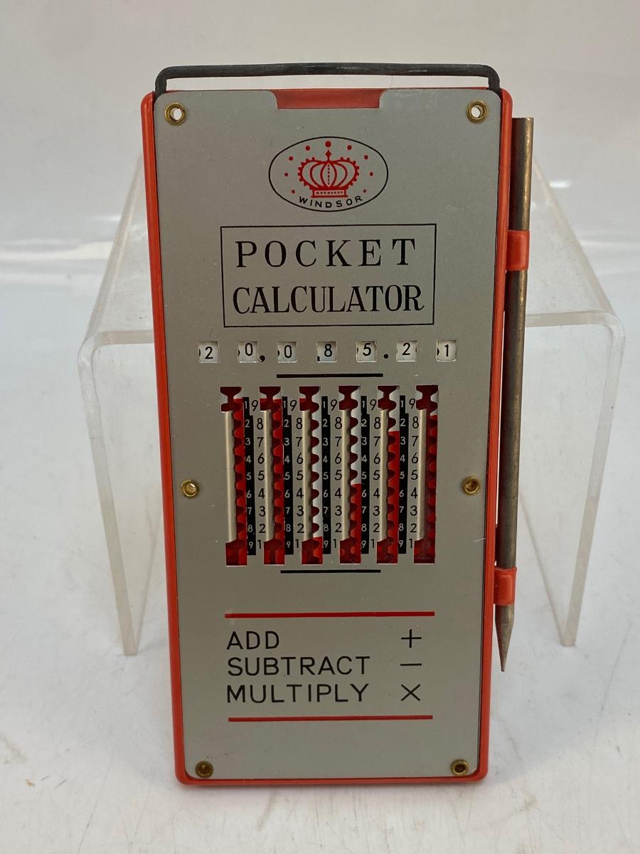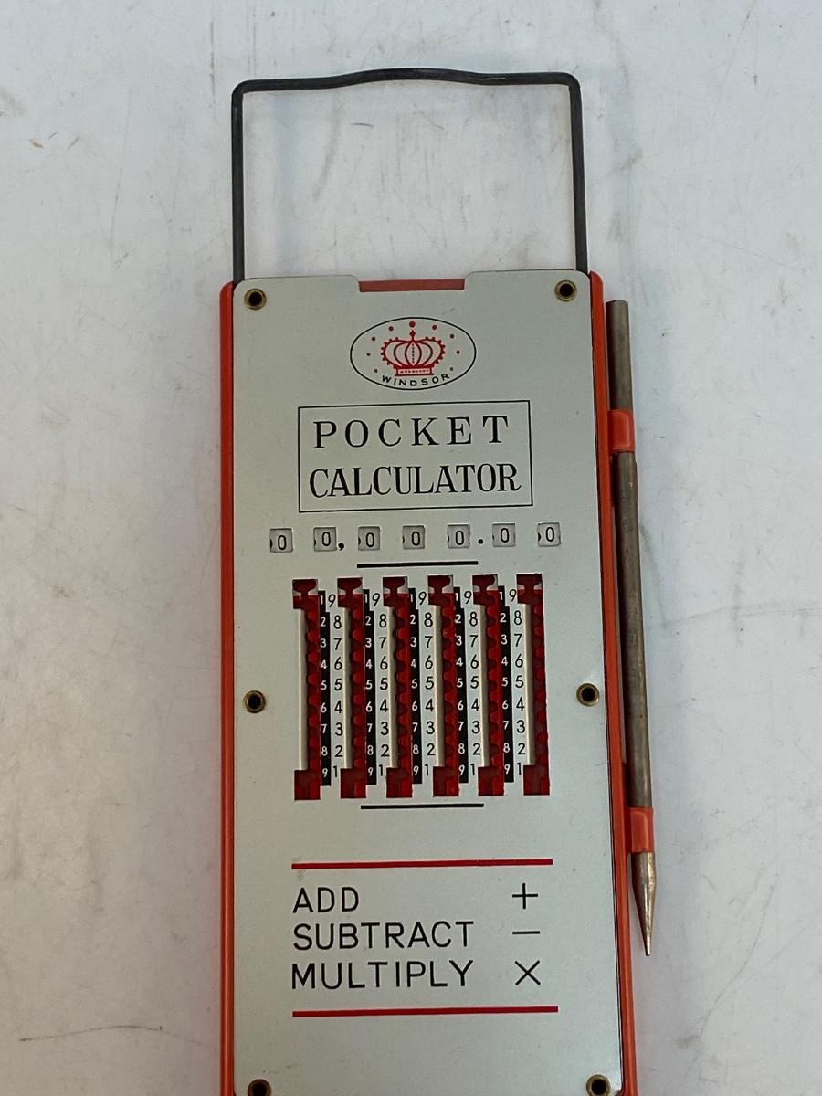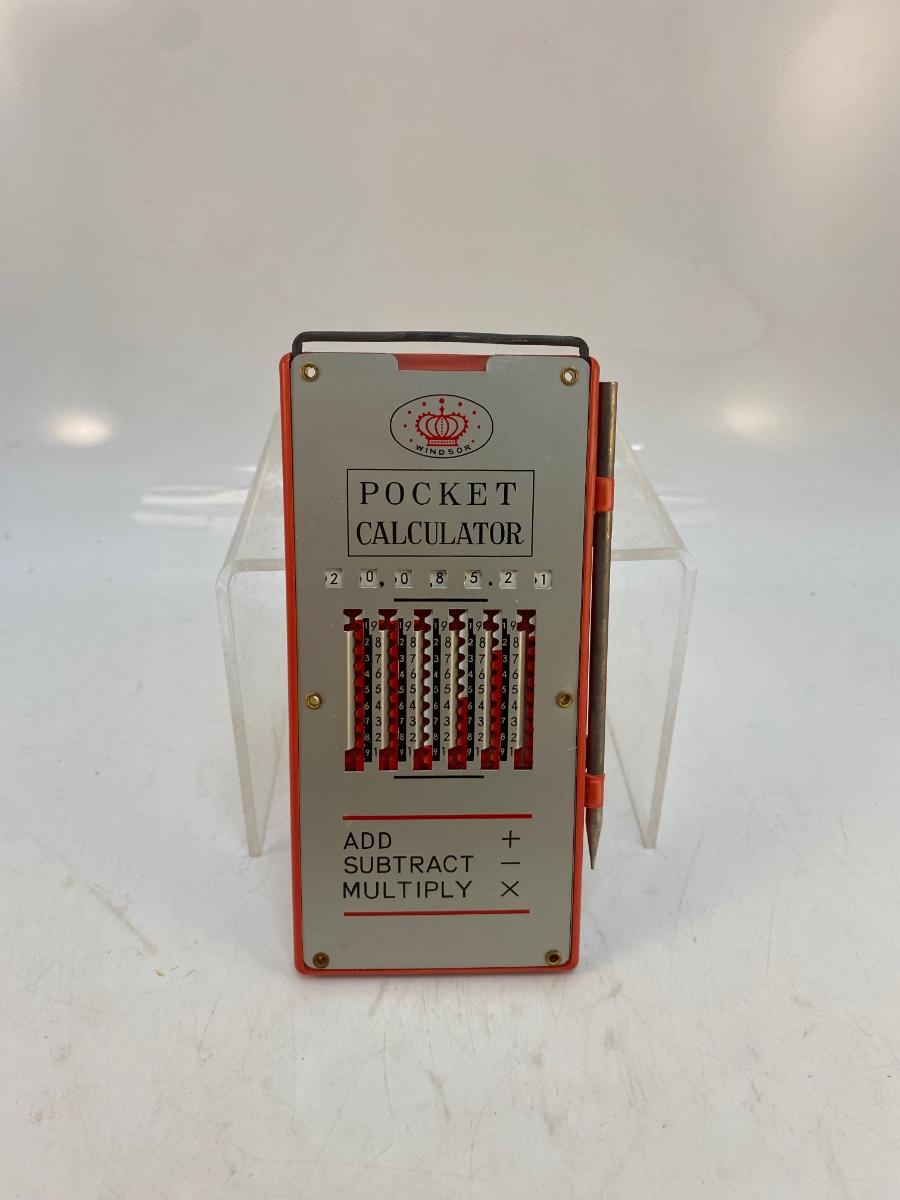 Vintage Metal Manual Mechanical Pocket Calculator with Stylist Windsor Japan. Small manual calculator. You use the stylist to move the numbers. No instructions on how to use exactly. Metal bar on top pulls up to reset numbers to zero. In good vintage condition.