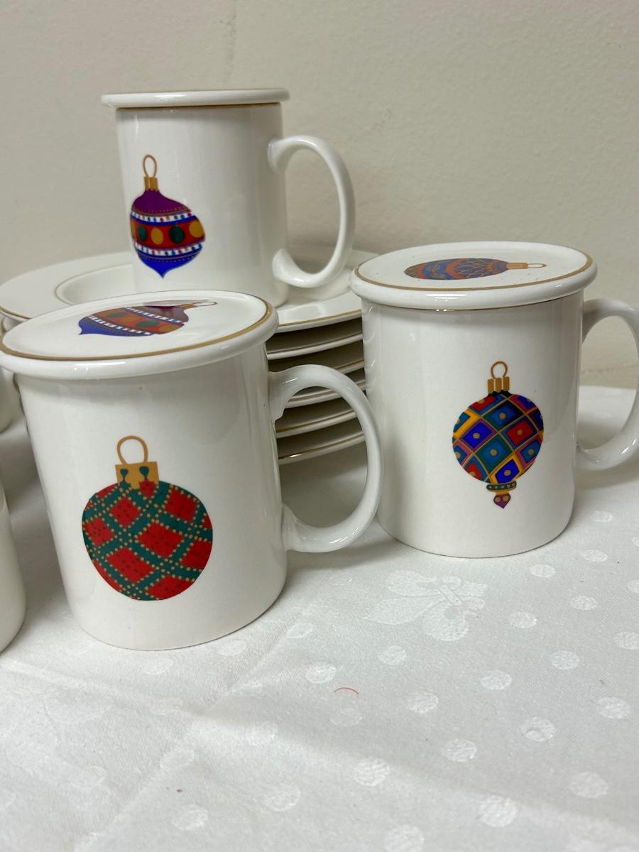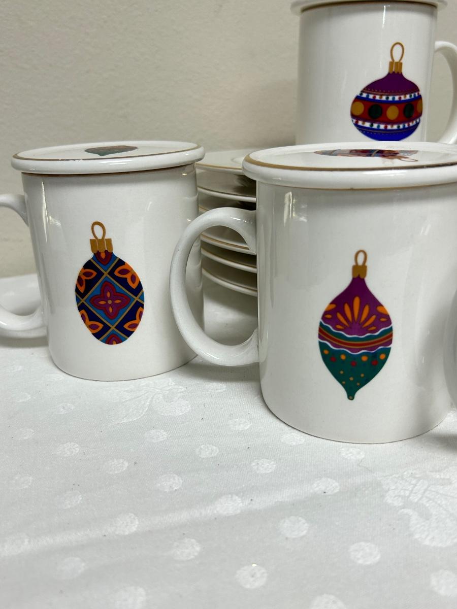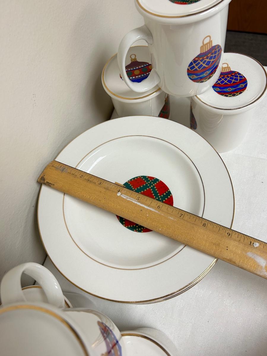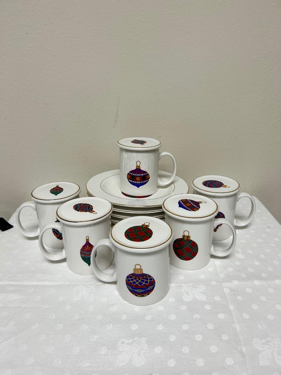 Gibson Holiday Dish Set Colorful Ornament Pattern Dessert Plates and Cocoa Coffee Mugs with Coaster Lids. In good condition. Different ornament patterns amongst the pieces. Service for 6.
