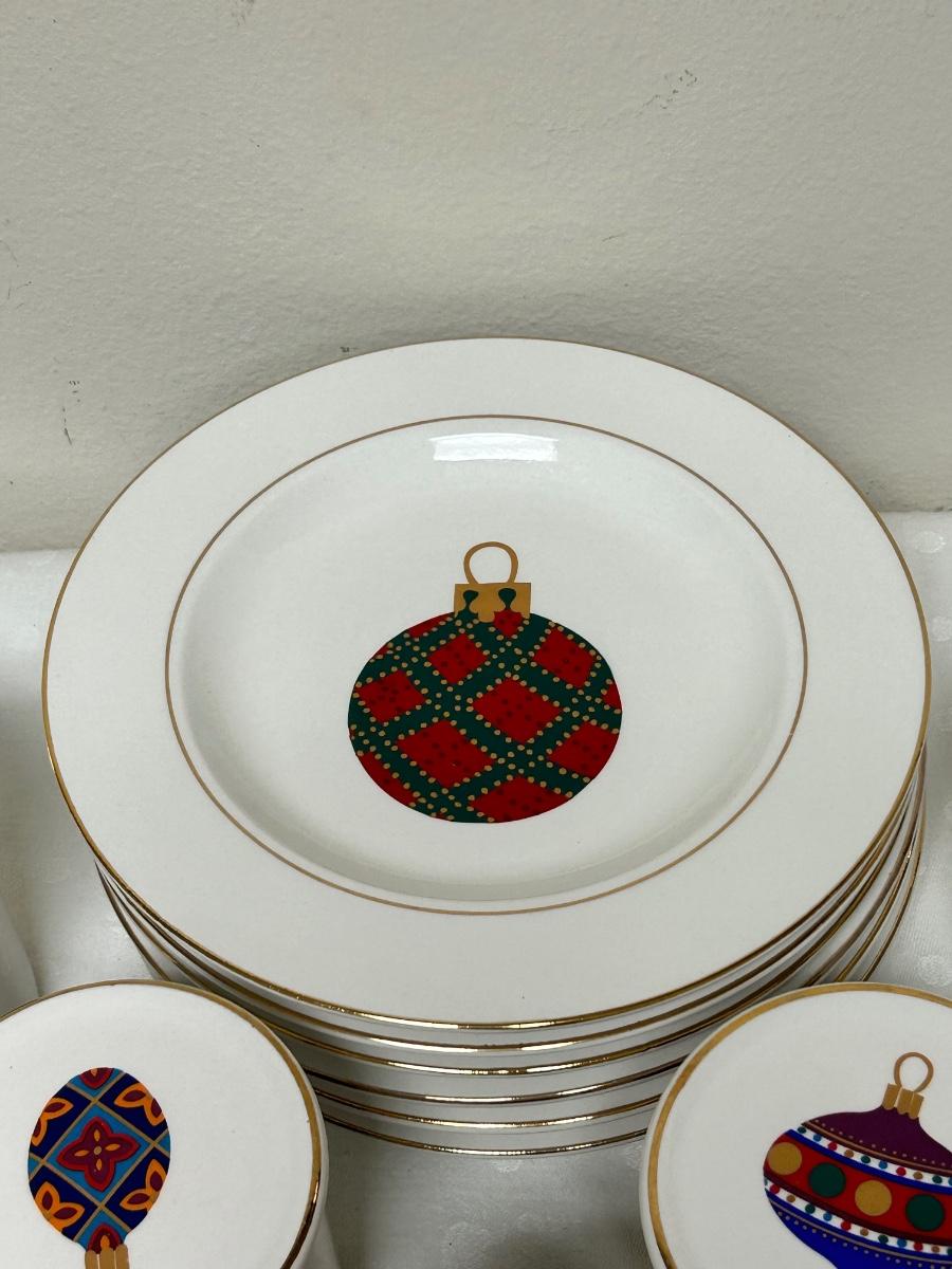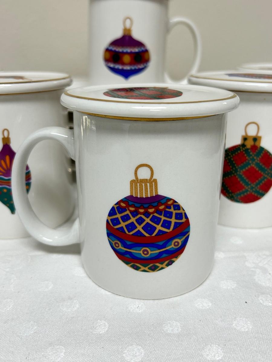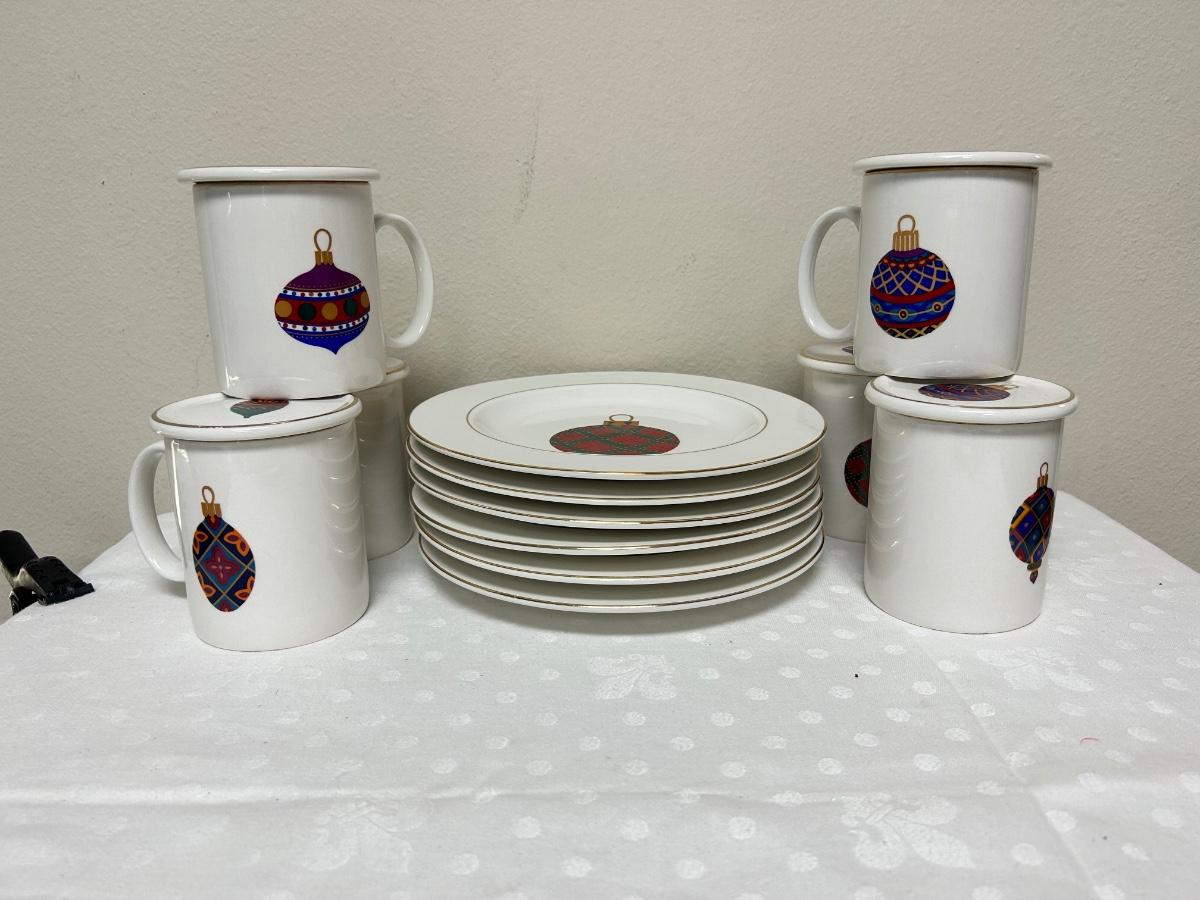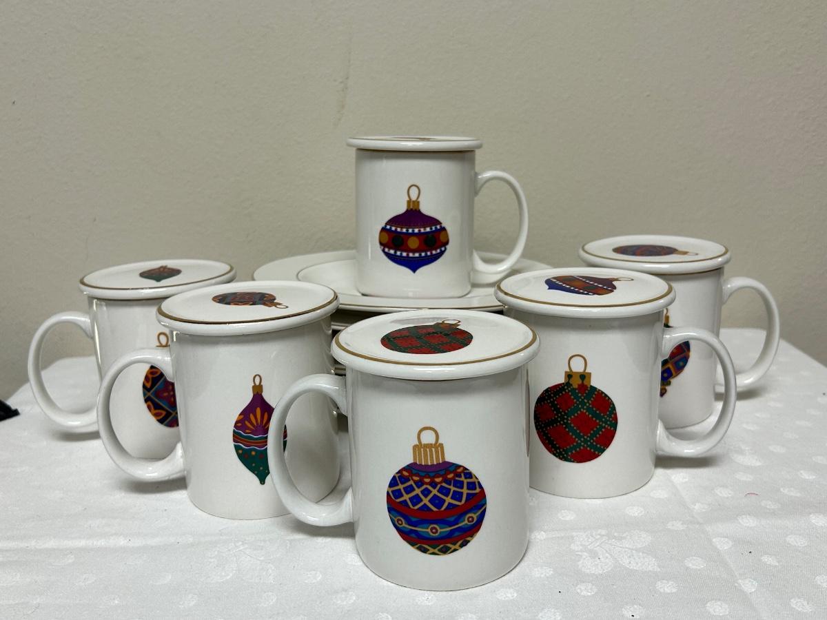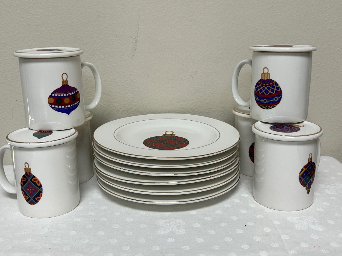 Gibson Holiday Dish Set Colorful Ornament Pattern Dessert Plates and Cocoa Coffee Mugs with Coaster Lids. In good condition. Different ornament patterns amongst the pieces. Service for 6.