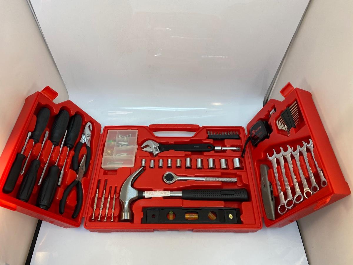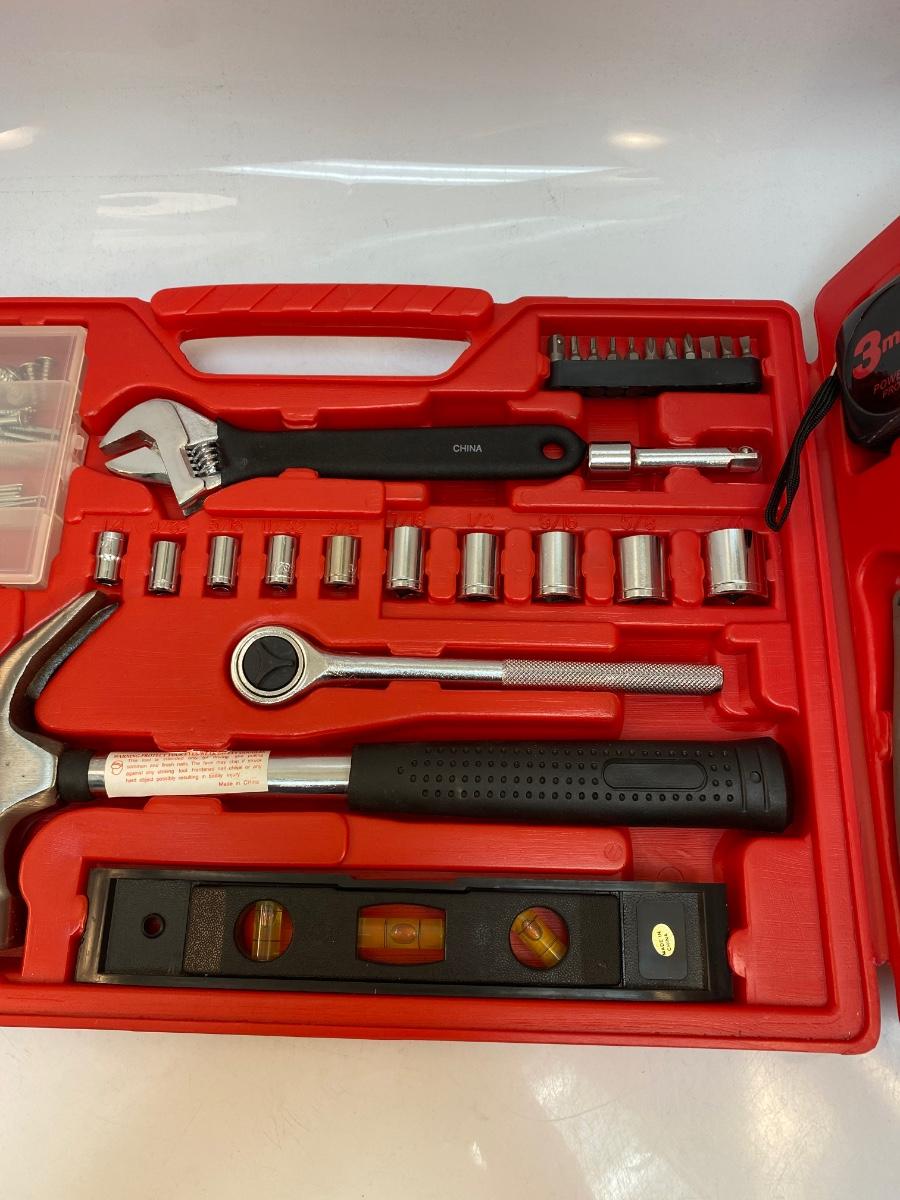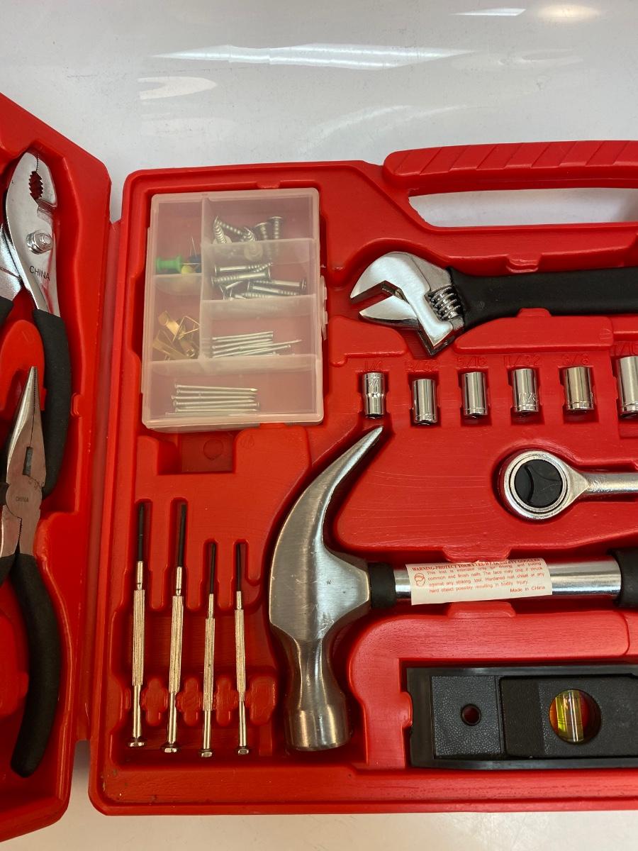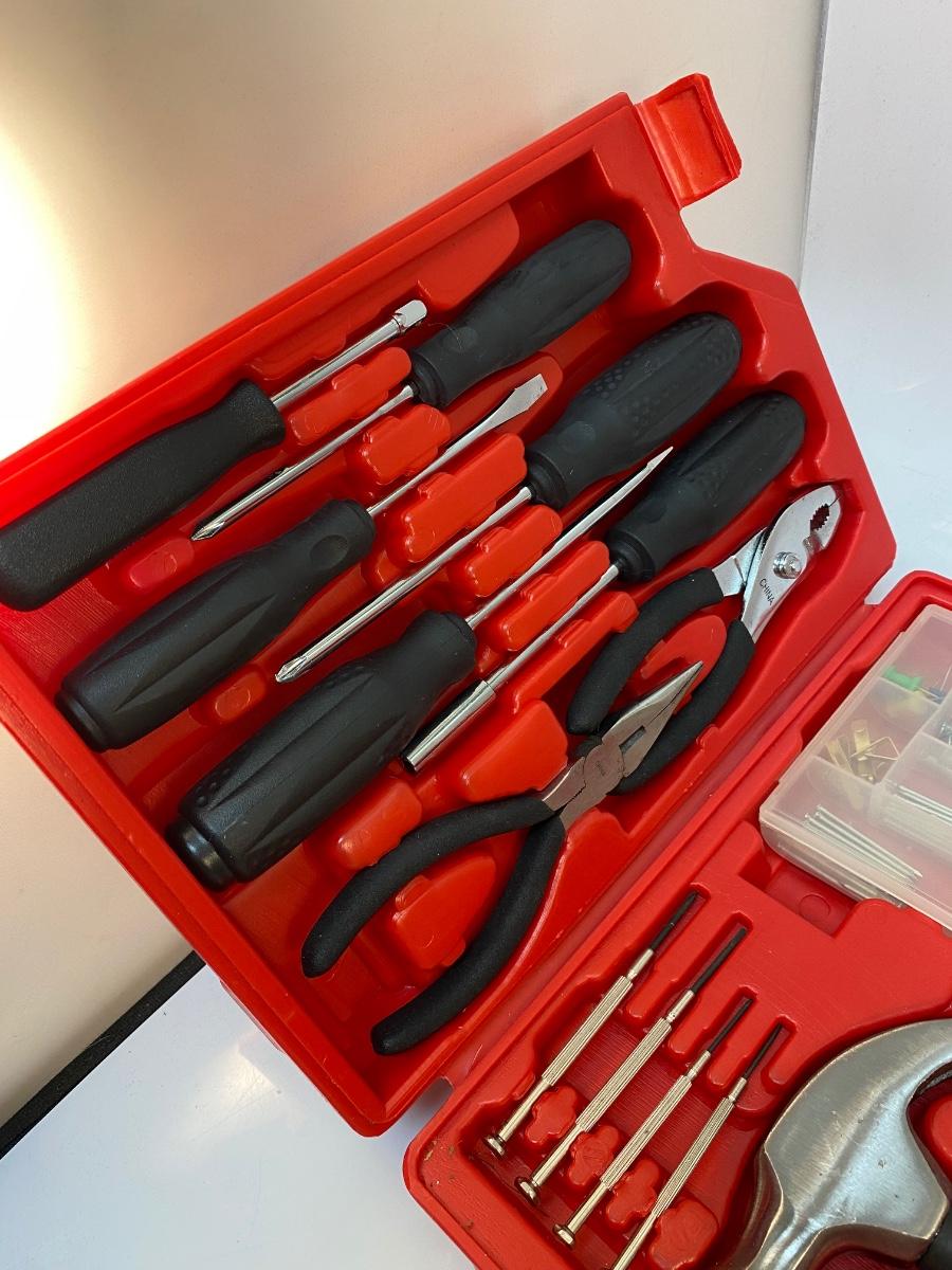 General Handyman Hand Tool Set with Hangable Storage Case. No missing pieces. Generic brand, great for small household tasks. Can be hung on the wall if desired.