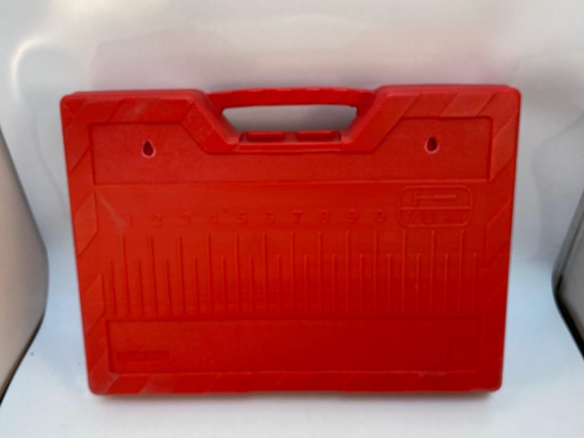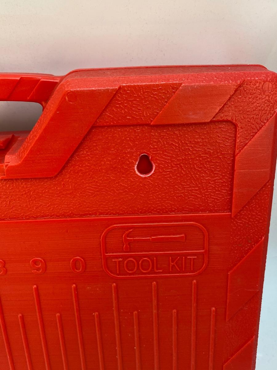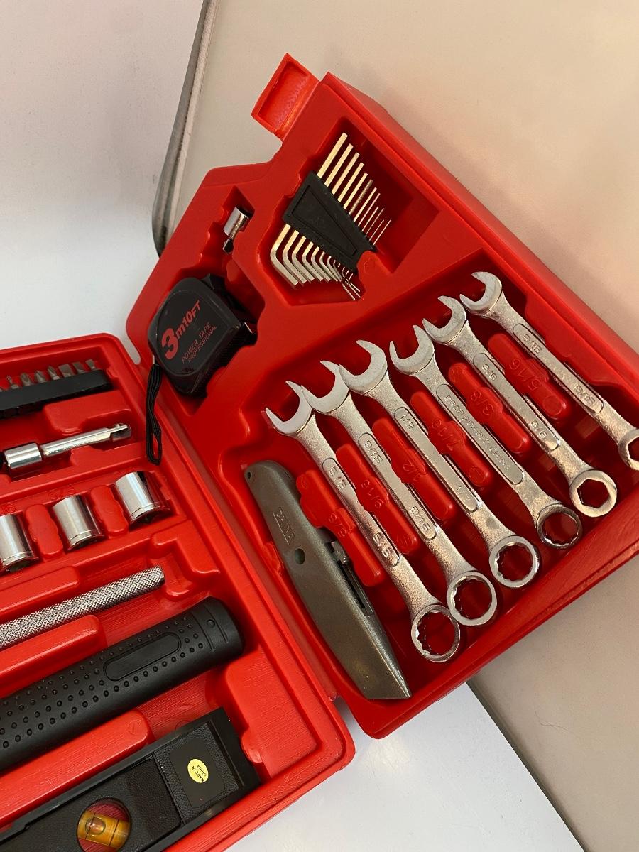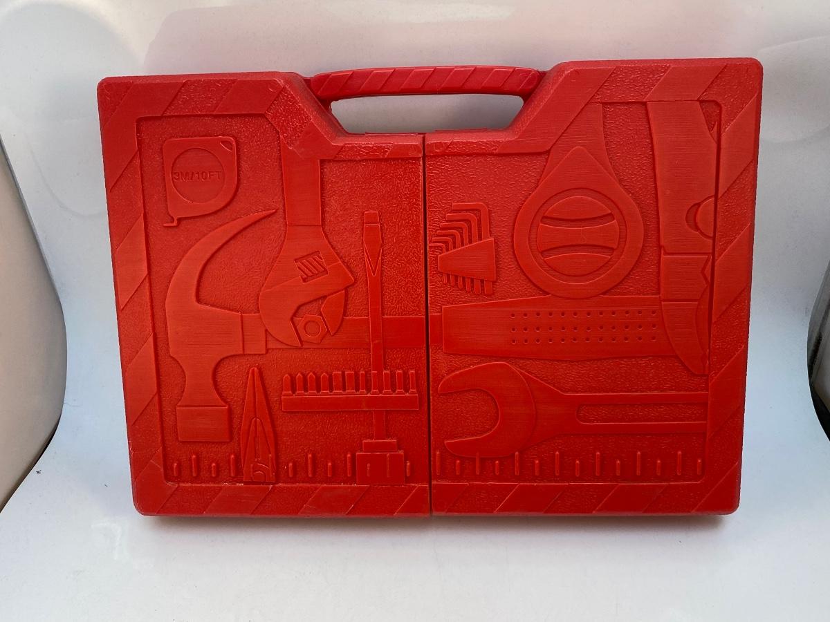 General Handyman Hand Tool Set with Hangable Storage Case. No missing pieces. Generic brand, great for small household tasks. Can be hung on the wall if desired.