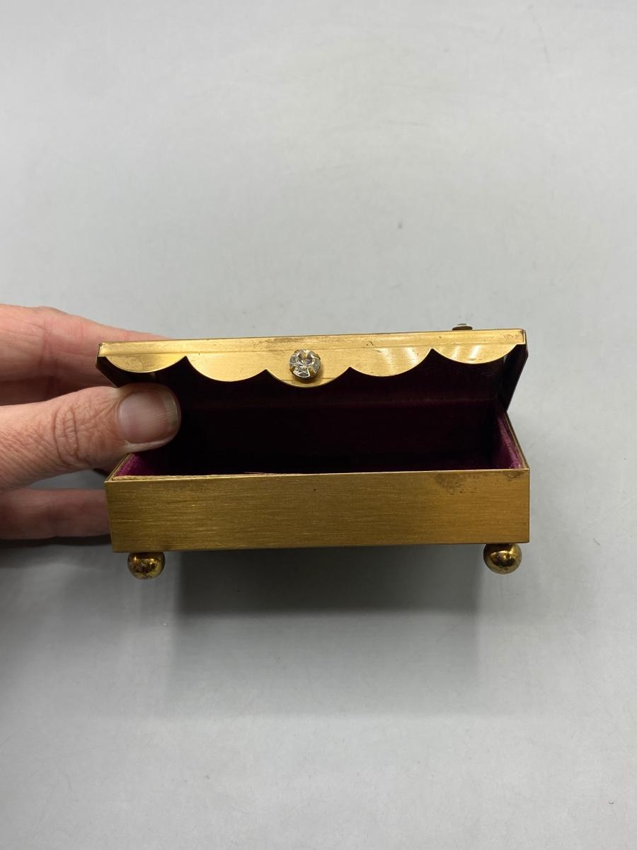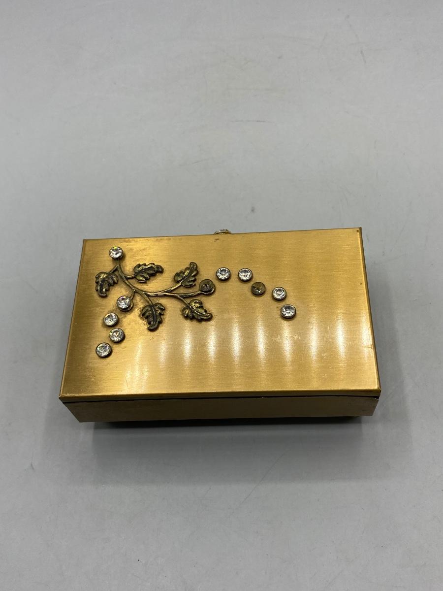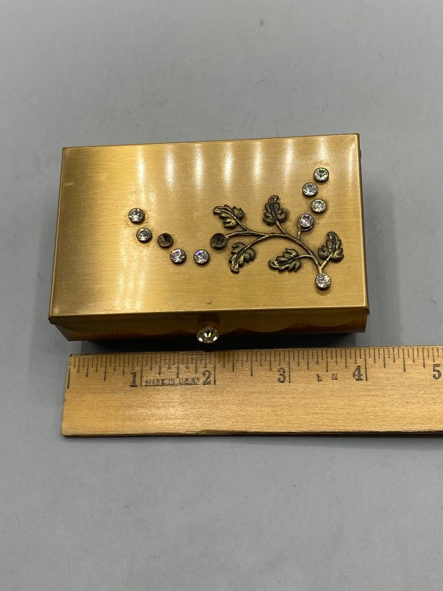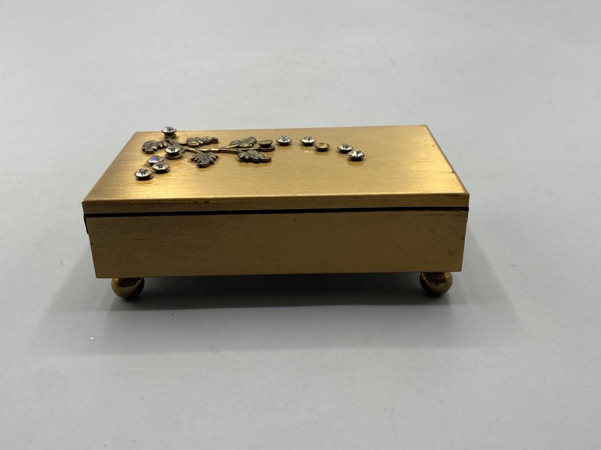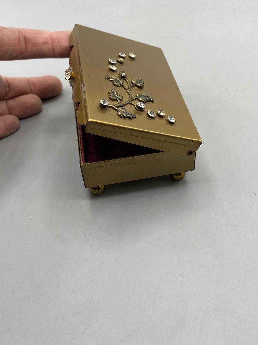 Vintage Brushed Brass Metal Trinket Box Gold Tone Product. Missing a couple of rhinestones but displays well. For some reason it only opens as far as shown in pictures. 4" size.