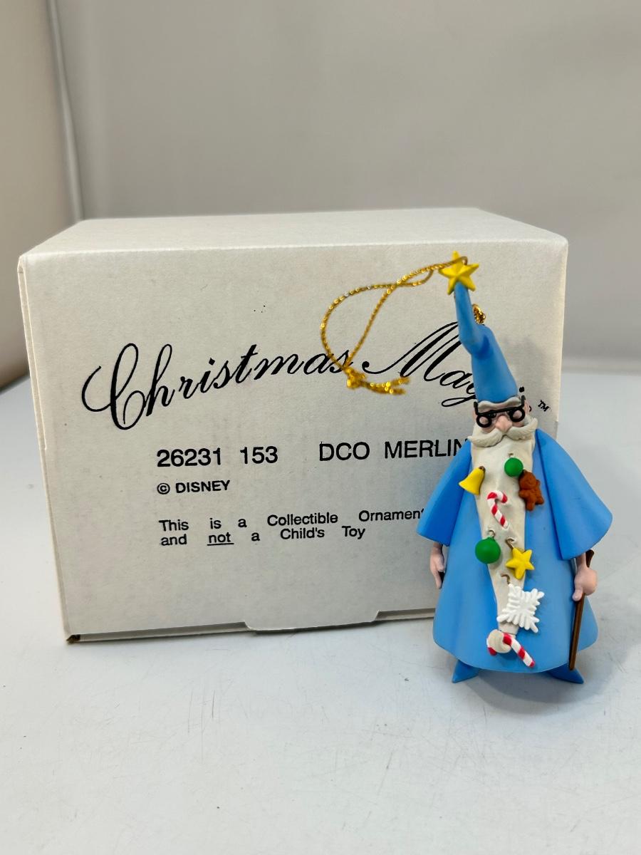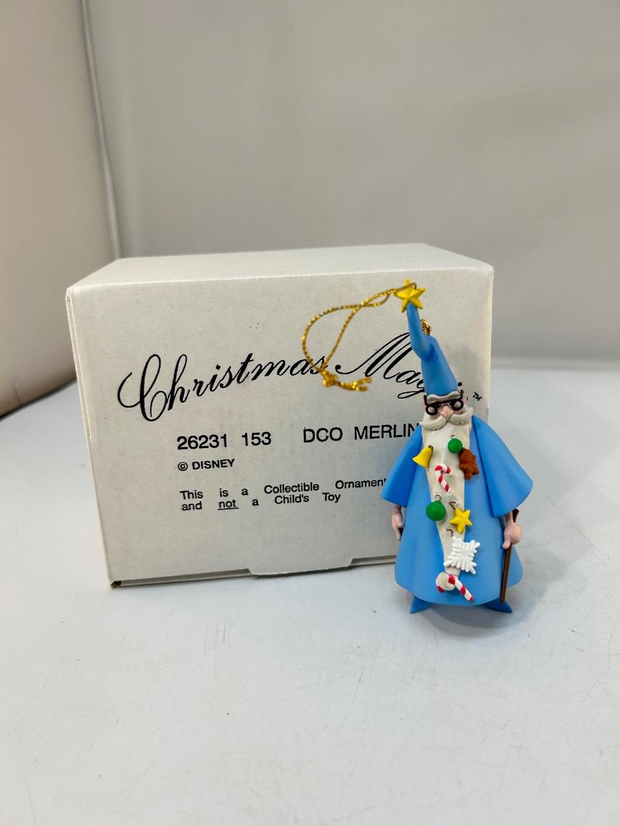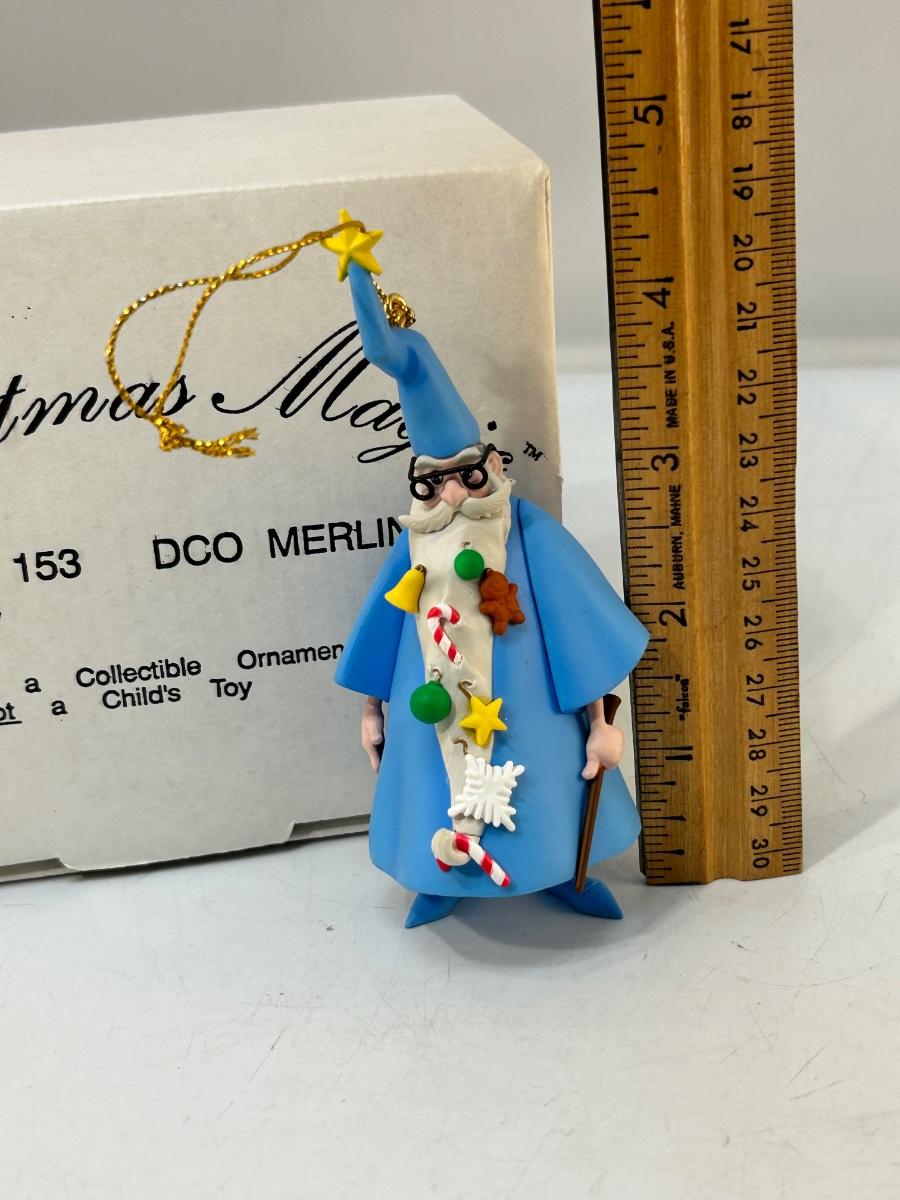 Walt Disney Christmas Magic The Sword in the Stone Merlin Holiday Tree Ornament Figurine. In good condition. About 4.5" size. Made of a hard plastic, comes with original box.