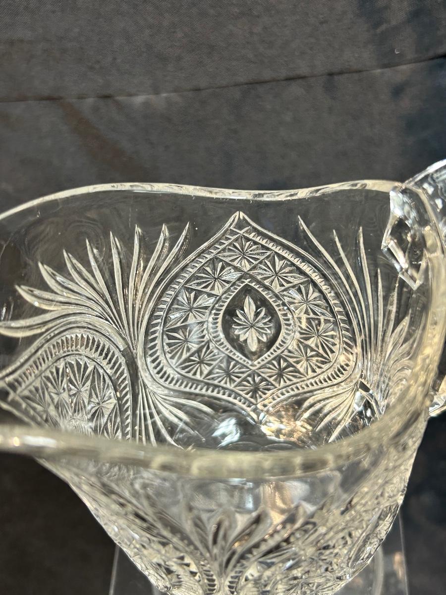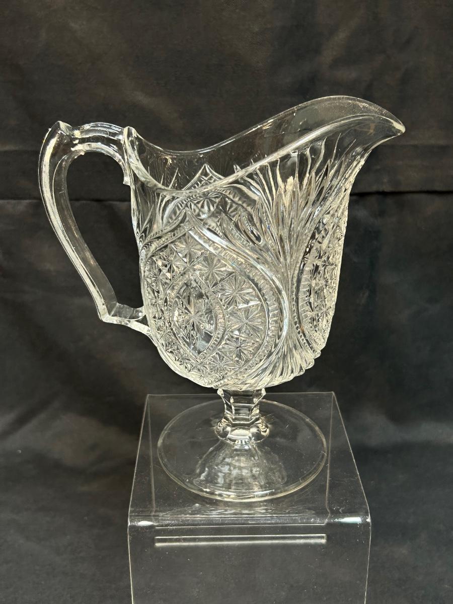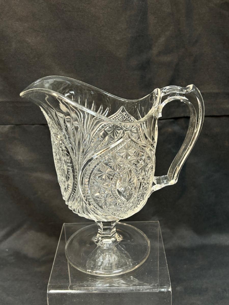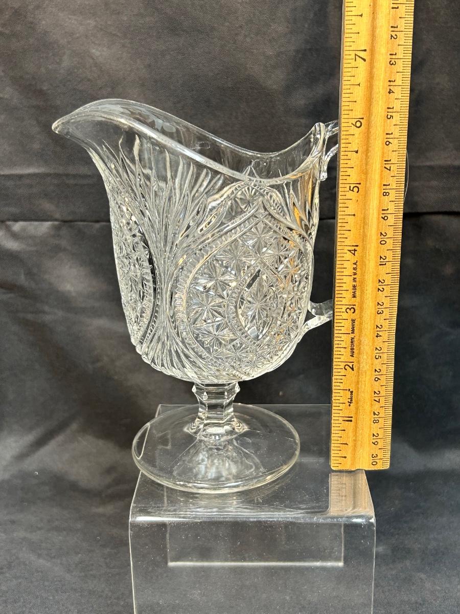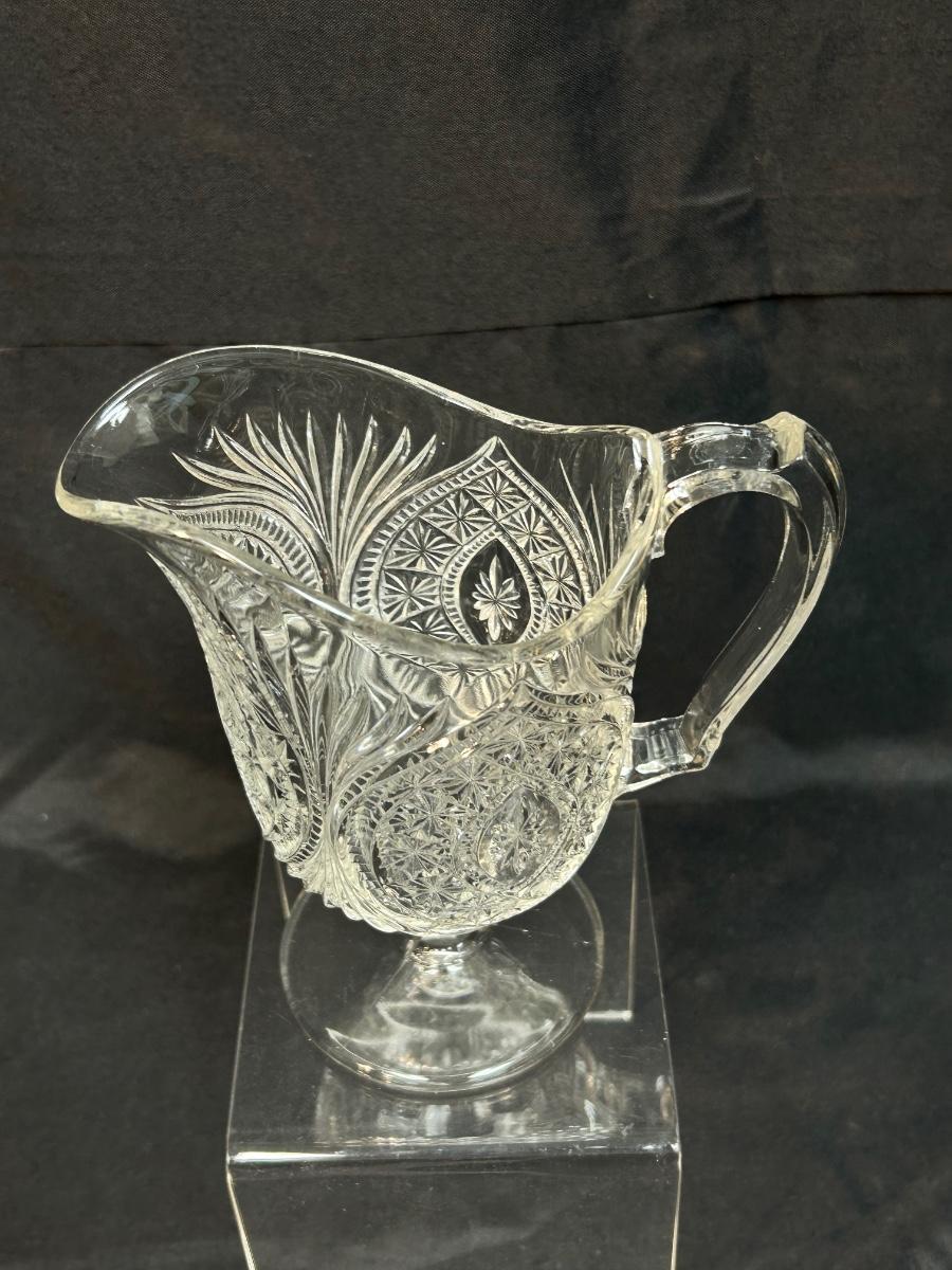 Vintage Footed Pressed Cut Glass Creamer Pitcher. In good condition, no chips or cracks. Beautiful cut pattern. 6" size.