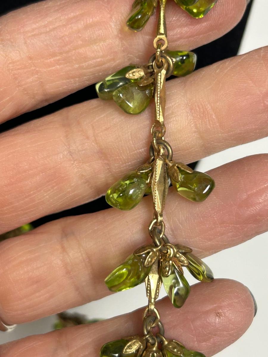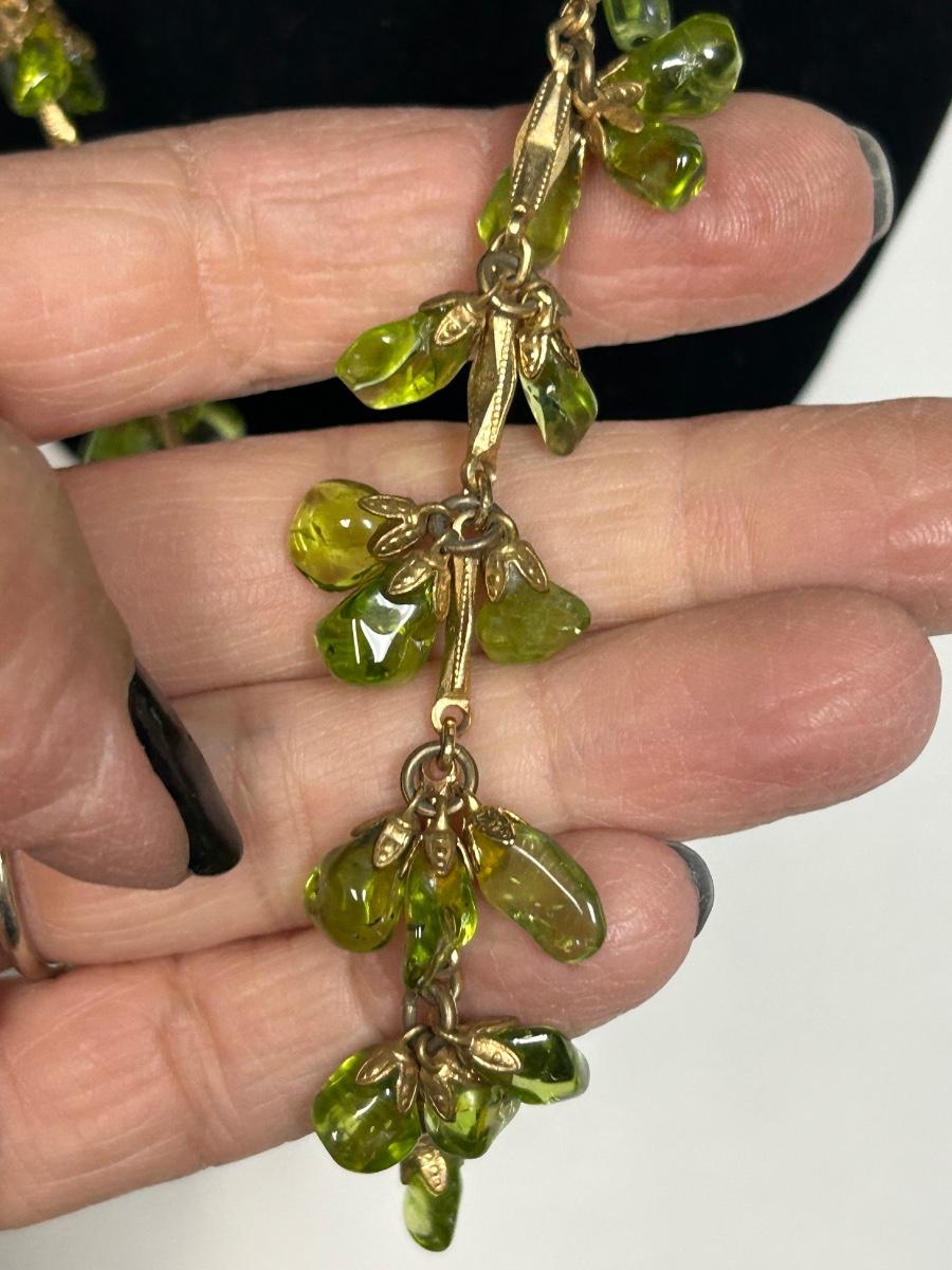 Vintage Gold Tone Rough Polish Peridot Dangling Necklace with Matching Earrings. In good condition. Long necklace.