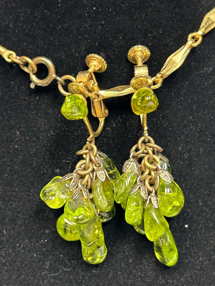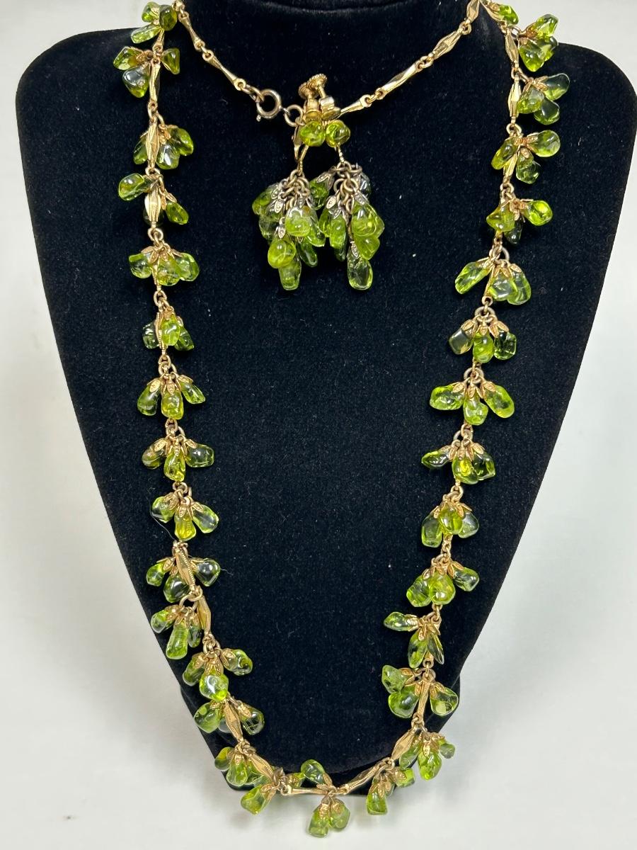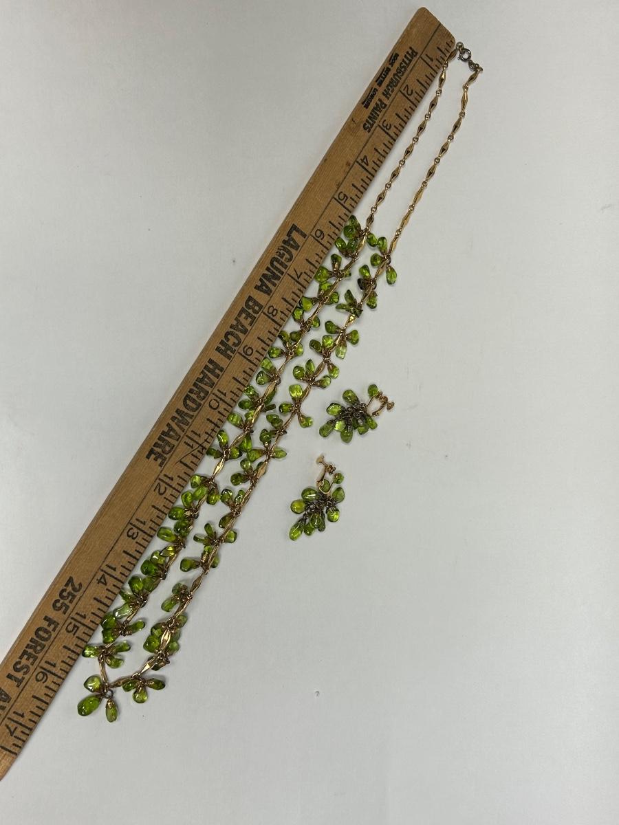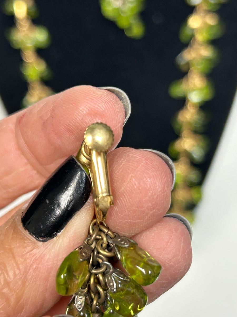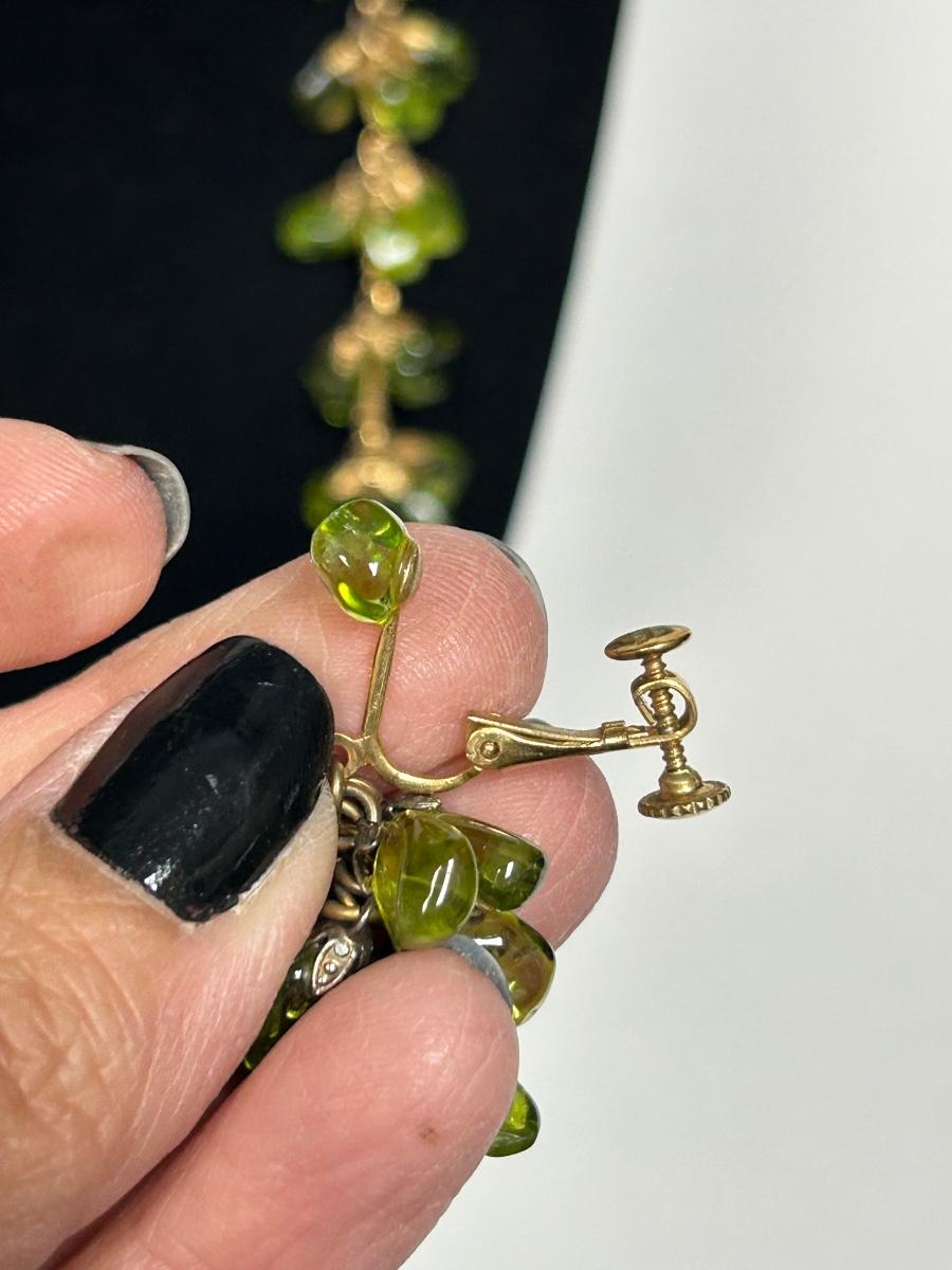 Vintage Gold Tone Rough Polish Peridot Dangling Necklace with Matching Earrings
