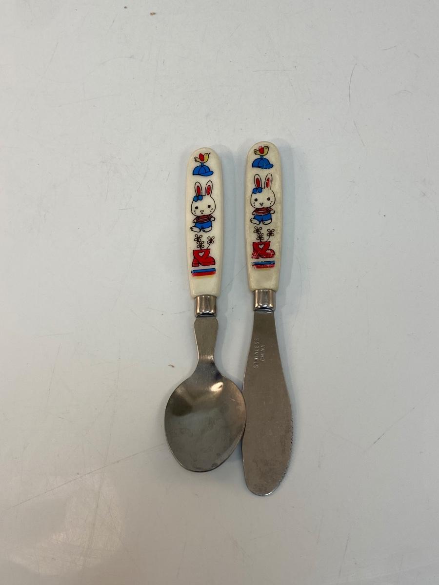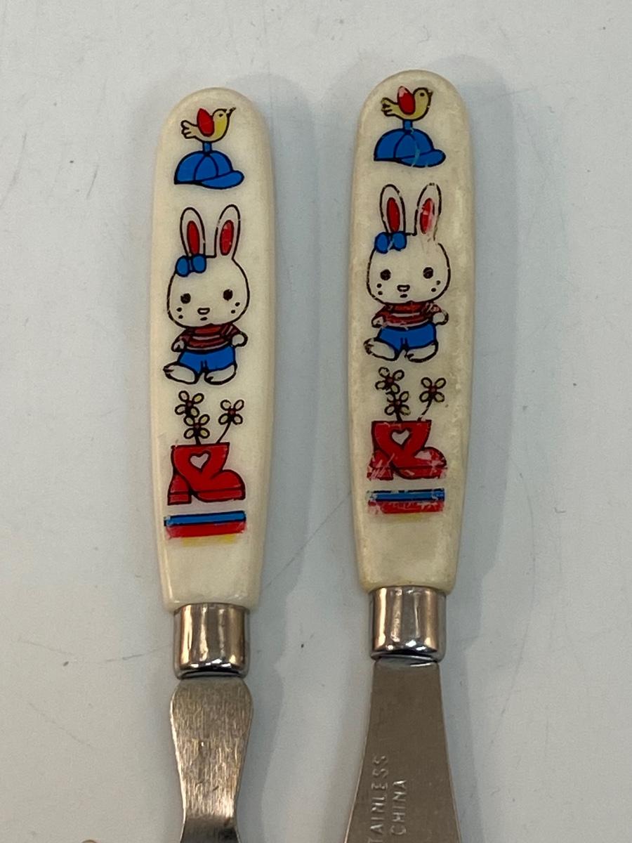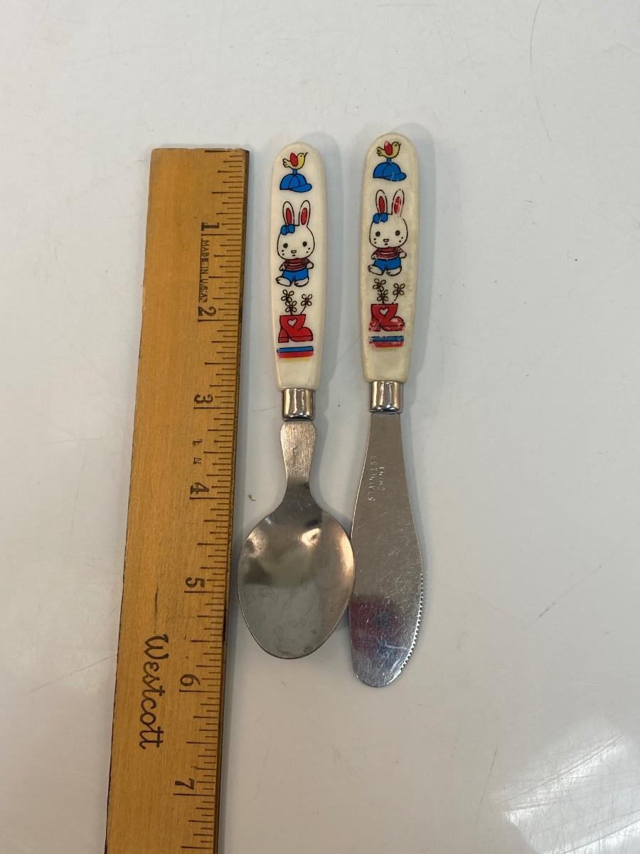 Pair of Vintage Child's Toddlers Eating Utensils Cute Rabbit Handles Spoon & Knife. In fair condition. Light weight metal. There is some discolor on plastic handles, may come cleaner with a light scrub.